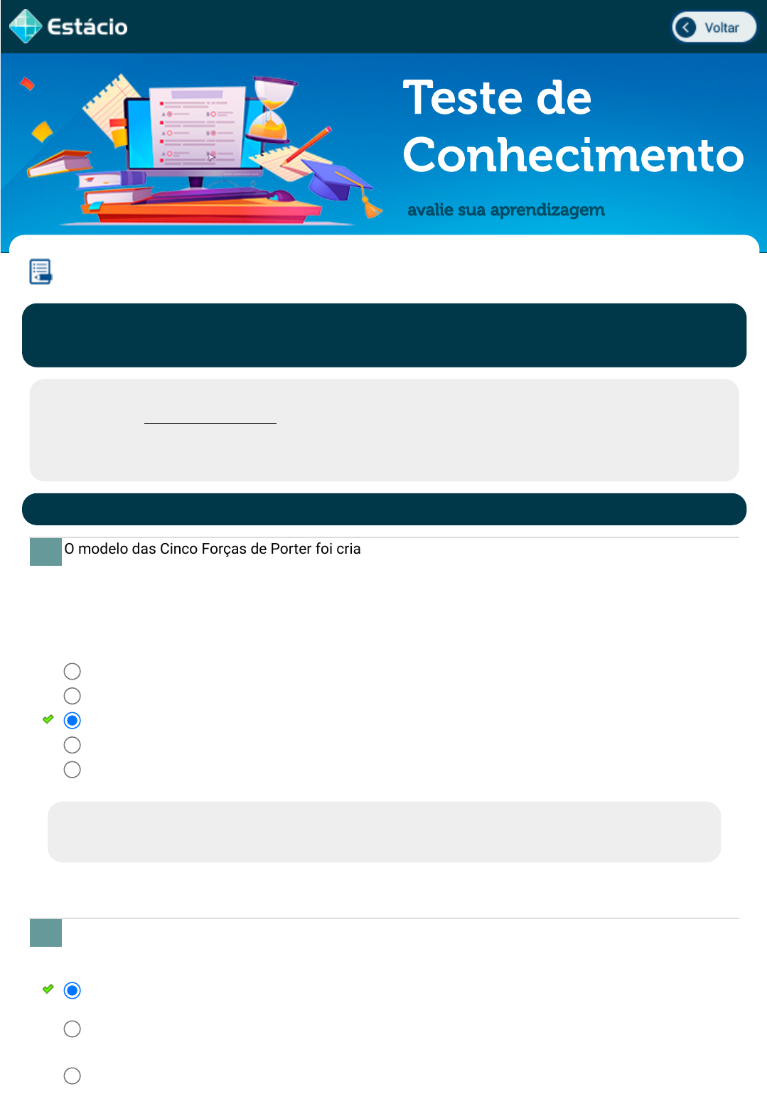 Teste de Conhecimento avalie sua aprendizagem O modelo das Cinco Forças de Porter foi criado por Michael Porter em 1979 e tem por objetivo a análise da competição entre empresas. O modelo considera cinco fatores importantes, as chamadas forças competitivas, que devem ser estudadas para o desenvolvimento de uma estratégia empresarial eficiente. Segundo o modelo, as forças competitivas que atuam sobre uma empresa são: poder de barganha dos fornecedores, poder de barganha dos clientes/consumidores, ameaça de novos entrantes no mercado, ameaça de produtos e serviços substitutos e: Considerando-se os principais processos administrativos, é correto afirmar que são algumas das principais finalidades do planejamento: PLANEJAMENTO E GESTÃO ESTRATÉGICA EDSON VITOR PASSOS QUINTINO 202001379592 PLANEJAMENTO E G 2021.3 EAD (GT) / EX Prezado (a) Aluno(a), Você fará agora seu TESTE DE CONHECIMENTO! Lembre-se que este exercício é opcional, mas não valerá ponto para sua avaliação. O mesmo será composto de questões de múltipla escolha. Após responde cada questão, você terá acesso ao gabarito comentado e/ou à explicação da mesma. Aproveite para se familiarizar com este modelo de questões que será usado na sua AV e AVS. DIAGNÓSTICO ESTRATÉGICO 1. Potencial de aquisição de produtos pelos clientes/consumidores. Manutenção do grau de satisfação dos clientes/consumidores. Grau de rivalidade entre os concorrentes do Mercado Facilidade de criação de novos produtos e renovação da gama atual. Alta demanda de produtos e capacidade de entrega pelos fornecedores. Data Resp.: 11/10/2021 00:10:21 Explicação: A resposta correta é: Grau de rivalidade entre os concorrentes do Mercado 2. a definição de objetivos para a empresa; o desenvolvimento de premissas sobre condições futuras; a identificação de meios adequados para alcance dos objetivos. a divisão e agrupamento das atividades na empresa; a designação de pessoas para as respectivas tarefas. a garantia de qualidade dos processos na empresa; a institucionalização de padrões de comportamento no trabalho; a adequada gestão dos recursos físicos, econômicos e humanos da empresa. javascript:voltar(); javascript:voltar(); A declaração da missão, visão e valores da organização são elementos essenciais na constituição de seu planejamento estratégico. Os conceitos associados a esses elementos são, respectivamente: Leia a afirmativa a seguir: Dentro do planejamento estratégico esse conceito "[...] representa a razão de ser da empresa", ou seja, "[...] a determinação do motivo central da existência da empresa [...]". A afirmação refere-se ao conceito de: o monitoramento e a mensuração do desempenho dos empregados; a adoção de medidas corretivas para assegurar o alcance de objetivos desejados. a gerência de conflitos internos; o reconhecimento do esforço dos trabalhadores e estabelecimento de recompensas; o processo de comunicação interna. Data Resp.: 11/10/2021 00:10:25 Explicação: A resposta correta é: a definição de objetivos para a empresa; o desenvolvimento de premissas sobre condições futuras; a identificação de meios adequados para alcance dos objetivos. FORMULAÇÃO ESTRATÉGICA 3. declaração dos objetivos estratégicos da organização; previsão de mercado atendido pela organização; declarações das intenções de ganhos da organização no horizonte do planejamento. conjunto dos indicadores a serem acompanhados pela organização; declaração do ponto de maturidade a ser alcançado pela organização no horizonte de planejamento; declarações daquilo que move a organização. declaração dos objetivos estratégicos da organização; previsão de mercado atendido pela organização; declarações daquilo que move a organização. declaração das metas da organização; projeção dessas metas a longo prazo; dimensões em relação às quais essas metas deverão ser avaliadas. declaração da finalidade da organização; declaração do posicionamento que a organização deseja no horizonte do planejamento; enunciados que norteiam todas as ações da organização. Data Resp.: 11/10/2021 00:10:31 Explicação: A resposta correta é: declaração da finalidade da organização; declaração do posicionamento que a organização deseja no horizonte do planejamento; enunciados que norteiam todas as ações da organização. 4. valores missão metas visão prazos Data Resp.: 11/10/2021 00:10:41 Explicação: A resposta correta é: missão Em relação às estratégias genéricas de Porter, identifique como verdadeiras (V) ou falsas (F) as seguintes afirmativas: ( ) Uma organização engajada em uma estratégia de diferenciação procura se distinguir dos competidores necessariamente pela localização de seus produtos ou serviços. ( ) As estratégias genéricas de Porter incluem as estratégias de ciclo de vida do produto. ( ) Uma organização que implementa uma estratégia de liderança por custo tenta alcançar vantagem competitiva reduzindo seu custo e diminuindo o preço, para que fique abaixo do das concorrentes. ( ) Uma empresa que pratica uma estratégia de foco concentra-se em um mercado, linha de produtos ou grupo de consumidores específicos. Assinale a alternativa que apresenta a sequência correta, de cima para baixo. Uma empresa implementa uma estratégia com a finalidade de criar: Ferramenta elaborada por Kaplan e Norton que procura fornecer a visão de conjunto dos fatores críticos de sucesso, viabilizando um sistema de controle que permite analisar as dimensões de desempenho, demonstrando não apenas resultados finais, mas também os fatores que os produzem, integrando medidas financeiras e não financeiras de desempenho, como cliente, inovação, finanças e processos internos. Qual o nome dessa ferramenta? IMPLEMENTAÇÃO ESTRATÉGICA 5. F - F - V - V V - V - F - F V - F - V - F V - F - V - V F - V - F - V Data Resp.: 11/10/2021 00:11:00 Explicaç