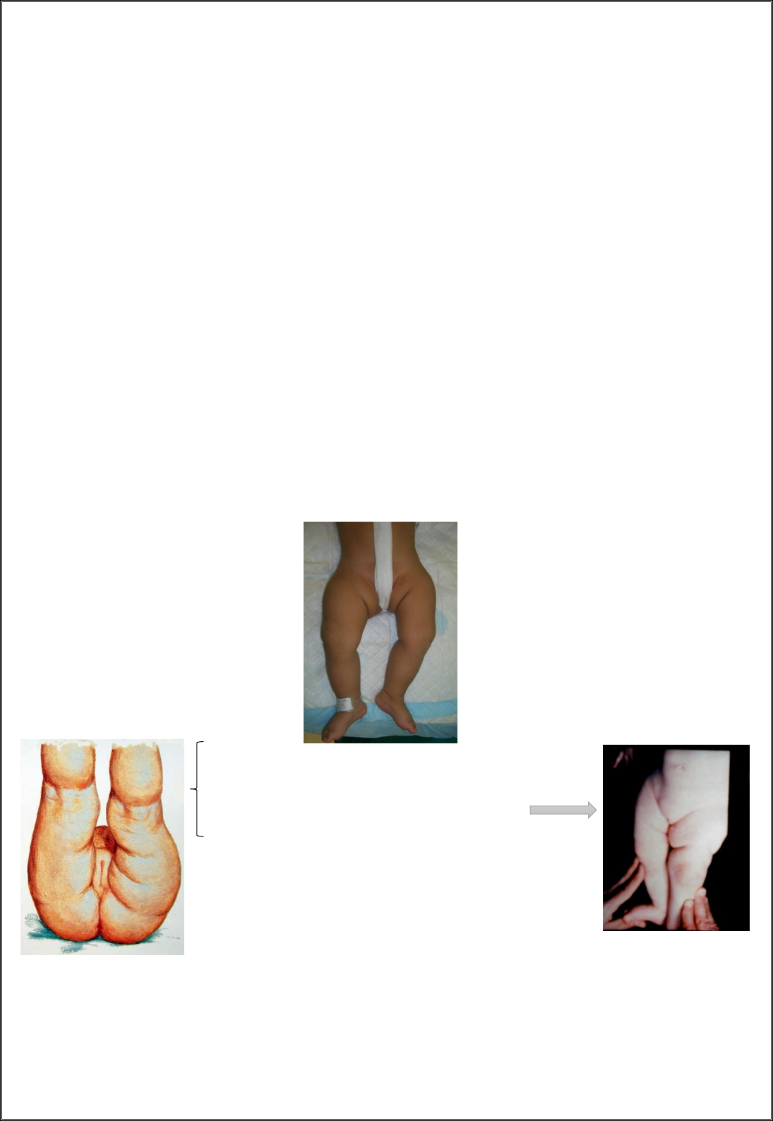 MALFORMAÇÕES DA PELVE E MMII | SÔNIA FARIAS – T.72 MALFORMAÇÕES DA PELVE E MMII DISPLASIA DO DESENVOLVIMENTO DO QUADRIL o Relação anormal entre a cabeça do fêmur e o acetábulo PROVOCA: luxação congênita do quadril o Mais comum em mulheres o Etiologia Frouxidão ligamentar Apresentação pélvica: hiperflexão do quadril + hiperextensão dos joelhos Fatores ambientais pós-natais Atitude de carregar a criança apoiada no quadril PROTEGE A CRIANÇA CONTRA DDP Atitude de enrolar o RN (mantém os MMII em adução) aumento da DDP o História familiar positiva: aumento da chance de apresentar DDP Presença de torcicolo congênito, deformidade no joelho e/ou no pé aumento do risco de apresentar DDP o Quadro clínico: Atitude de rotação externa Aumento do contorno lateral do quadril Assimetria das pregas cutâneas Aumento do períneo: um lábio vaginal parece ser um pouco maior do que o outro MALFORMAÇÕES DA PELVE E MMII | SÔNIA FARIAS – T.72 SINAL DE GALLEAZZI: diferença de altura entre os joelhos quando o quadril é fletido e os joelhos são hiperfletidos NO RN: instabilidade do quadril APÓS 2 MESES: limitação de abdução do quadril quando fletido Um dos lados possui bloqueio Cuidado com bilateralidade: perde o padrão de comparação TESTE DE THOMAS: perda da deformidade em flexão do quadril contralateral à hiperflexão do quadril (REALIZADA EM RN) NORMAL: presença da deformidade em flexão LCQ (?): ausência da deformidade em flexão PRESENTE EM NÃO RN! MALFORMAÇÕES DA PELVE E MMII | SÔNIA FARIAS – T.72 MANOBRA DE ORTOLANI: abdução e rotação externa reduz a luxação (“clique”) MANOBRA DE BARLOW: adução e rotação interna provoca a luxação (“clique”) TESTE DE TRENDENLEMBURG: presença da marcha anserina CAUSA: deficiência do glúteo médio ocorre em crianças que crescem com o quadril luxado Aumento da lordose lombar: alteração reflexa Fazer ddx com espondilolistese o Exame de imagem Região do quadril visto no RX Principal exame: USG (PARA CRIANÇAS MENORES) MOTIVO: por causa do núcleo de crescimento do fêmur CLASSIFICAÇÃO DE GRAF o diminuição do ângulo alfa e aumento do ângulo beta o 60º-43º: DISPLÁSICO o <43º: SUBLUXADO o Imensurável: LUXADO REALIZADAS EM RN MALFORMAÇÕES DA PELVE E MMII | SÔNIA FARIAS – T.72 RX: pode ser usado para crianças maiores o Cabeça do fêmur (posição normal) = QUADRANTE INFERIOR INTERNO o Ângulo de Kleinberg: aumentado se luxação o Ângulo de Wiberg: reduzido se luxado o Linha de Shenton: “quebrada” se luxado o Deslocamento lateral e proximal: luxação MALFORMAÇÕES DA PELVE E MMII | SÔNIA FARIAS – T.72 o Tratamento Até os 6 meses: atitude de abdução e rotação externa Aparelho de Pavlik Suporte de Frejka 6 meses aos 12 meses: momento de ficar em pé e andar Redução sob anestesia geral Imobilização com gesso pelvipodálico 12 meses aos 18 meses: Tração Tenotomia dos adutores (iliopsoas) Redução sob anestesia geral Controle por USG Imobilização com gesso pelvipodálico MOTIVOS PARA TRAÇÃO: o Encurtamento muscular o Tendão do Iliopsoas mais robusto o Inversão do limbo (fica interposto no trajeto que a cabeça do fêmur faria para voltar ao lugar) o Pulvinar: gordura dentro da cavidade acetabular (dificulta a redução) > 18 meses Tenotomia dos adutores redução aberta acetabuloplastia (reduz o ângulo de Kleinberg) encurtamento femoral com variação do colo EPIFISIÓLISE DO QUADRIL o Descolamento proximal do fêmur o Início: puberdade MOTIVO: ocorre em períodos de crescimento rápido M: 12-16 anos F: 10-14 anos MALFORMAÇÕES DA PELVE E MMII | SÔNIA FARIAS – T.72 o Fatores de risco Obesidade História familiar Hiperparatireoidismo o Quadro clínico: OCORRE ESCORREGAMENTO DA CABEÇA DO FÊMUR POR COMPRESSÃO NA ÁREA DE FRAGILIDADE DA CABEÇA DO FÊMUR Dor de instalação súbita Incapacidade de manter a carga sobre o membro Rotação externa e encurtamento do membro o Exame de imagem Sinal de CAPENER: imagem triangular Sinal de TRETHOVAN Desaparecimento da parte externa da cabeça do fêmur Sinal da corcova de HERNDON: osteófito na cabeça do fêmur o Tratamento Fixação in situ Osteotomias: corcovas já cicatrizadas impossibilitando o movimento do quadril ENFERMIDADE DE LEGG-CALVÉ-PERTHES MALFORMAÇÕES DA PELVE E MMII | SÔNIA FARIAS – T.72 o Patologia Início: obstrução temporária de todas as artérias circunflexas que nutrem a cabeça do fêmur GERA: necrose compressão da cabeça do fêmur ao andar fragmentação retorno da circulação reossificação remodelamento o Quadro clínico: Meninos entre 5-10 anos Típica claudicação inicial SEM DOR Abdução e rotação externa comprometidas Marcha antálgica o Imagem Sinal da crescente radio-transparente: mais precoce Sinal de Gage: aspecto triangular fragmentando a epífise MALFORMAÇÕES DA PELVE E MMII | SÔNIA FARIAS – T.72 Sinal de Caffey: “cabeça dentro da cabeça” Pode formar sequestro ósseo central, podendo evoluir para a destruição de toda a epífise o SE NESSE ULTIMO ESTÁGIO: perda da cabeça femoral o Tratamento Descarga do quadril Evitar a destruição da epífise/metáfise Centralização da cabeça femoral PÉ TORTO CONGÊNITO o Etiologia: Predisposição genética Defeito no plasma germinativo do osso Oligoidrâmnio Amniocentese precoce o Quadro clínico Equinismo do retropé: encurtamento do tendão de aquiles MALFORMAÇÕES DA PELVE E MMII | SÔNIA FARIAS – T.72 Verismo calcâneo Adução e supinação do antepé e mediopé Aumento do Cavo do pé Hipotrofia da panturrilha o Imagem RX AP Aumento do ângulo TPM Diminuição do ângulo talocalcâneo antero-posterior de Kite RX em PERFIL Diminuição do ângulo talocalcâneo lateral de Kite o Ocorre encurtamento de todos os tendões flexores mediais ao tendão de aquiles Tendão calcâneo; Flexor longo do hálux; Flexor longo dos dedos; Tibial posterior; Abdutor do hálux. o Tratamento Conservador Primeiro mês: al