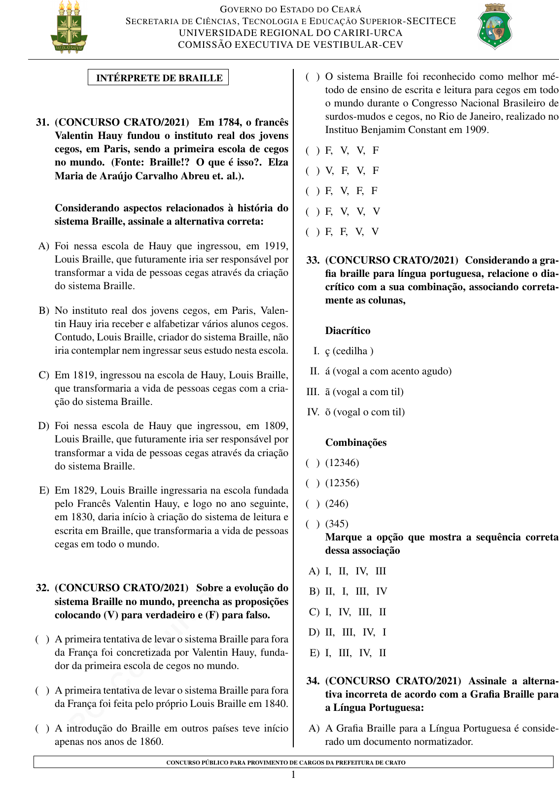 pcimarkpci MjgwNDowMTRjOjY1ODA6NGFhNToyYzE5OjllYmE6ODcxNjphODRl:TW9uLCAxMSBPY3QgMjAyMSAyMzoxNjozOCAtMDMwMA== GOVERNO DO ESTADO DO CEARÁ SECRETARIA DE CIÊNCIAS, TECNOLOGIA E EDUCAÇÃO SUPERIOR-SECITECE UNIVERSIDADE REGIONAL DO CARIRI-URCA COMISSÃO EXECUTIVA DE VESTIBULAR-CEV INTÉRPRETE DE BRAILLE 31. (CONCURSO CRATO/2021) Em 1784, o francês Valentin Hauy fundou o instituto real dos jovens cegos, em Paris, sendo a primeira escola de cegos no mundo. (Fonte: Braille!? O que é isso?. Elza Maria de Araújo Carvalho Abreu et. al.). Considerando aspectos relacionados à história do sistema Braille, assinale a alternativa correta: A) Foi nessa escola de Hauy que ingressou, em 1919, Louis Braille, que futuramente iria ser responsável por transformar a vida de pessoas cegas através da criação do sistema Braille. B) No instituto real dos jovens cegos, em Paris, Valen- tin Hauy iria receber e alfabetizar vários alunos cegos. Contudo, Louis Braille, criador do sistema Braille, não iria contemplar nem ingressar seus estudo nesta escola. C) Em 1819, ingressou na escola de Hauy, Louis Braille, que transformaria a vida de pessoas cegas com a cria- ção do sistema Braille. D) Foi nessa escola de Hauy que ingressou, em 1809, Louis Braille, que futuramente iria ser responsável por transformar a vida de pessoas cegas através da criação do sistema Braille. E) Em 1829, Louis Braille ingressaria na escola fundada pelo Francês Valentin Hauy, e logo no ano seguinte, em 1830, daria início à criação do sistema de leitura e escrita em Braille, que transformaria a vida de pessoas cegas em todo o mundo. 32. (CONCURSO CRATO/2021) Sobre a evolução do sistema Braille no mundo, preencha as proposições colocando (V) para verdadeiro e (F) para falso. ( ) A primeira tentativa de levar o sistema Braille para fora da França foi concretizada por Valentin Hauy, funda- dor da primeira escola de cegos no mundo. ( ) A primeira tentativa de levar o sistema Braille para fora da França foi feita pelo próprio Louis Braille em 1840. ( ) A introdução do Braille em outros países teve início apenas nos anos de 1860. ( ) O sistema Braille foi reconhecido como melhor mé- todo de ensino de escrita e leitura para cegos em todo o mundo durante o Congresso Nacional Brasileiro de surdos-mudos e cegos, no Rio de Janeiro, realizado no Instituo Benjamim Constant em 1909. ( ) F, V, V, F ( ) V, F, V, F ( ) F, V, F, F ( ) F, V, V, V ( ) F, F, V, V 33. (CONCURSO CRATO/2021) Considerando a gra- fia braille para língua portuguesa, relacione o dia- crítico com a sua combinação, associando correta- mente as colunas, Diacrítico I. ç (cedilha ) II. á (vogal a com acento agudo) III. ã (vogal a com til) IV. õ (vogal o com til) Combinações ( ) (12346) ( ) (12356) ( ) (246) ( ) (345) Marque a opção que mostra a sequência correta dessa associação A) I, II, IV, III B) II, I, III, IV C) I, IV, III, II D) II, III, IV, I E) I, III, IV, II 34. (CONCURSO CRATO/2021) Assinale a alterna- tiva incorreta de acordo com a Grafia Braille para a Língua Portuguesa: A) A Grafia Braille para a Língua Portuguesa é conside- rado um documento normatizador. CONCURSO PÚBLICO PARA PROVIMENTO DE CARGOS DA PREFEITURA DE CRATO 1 pcimarkpci MjgwNDowMTRjOjY1ODA6NGFhNToyYzE5OjllYmE6ODcxNjphODRl:TW9uLCAxMSBPY3QgMjAyMSAyMzoxNjozOCAtMDMwMA== GOVERNO DO ESTADO DO CEARÁ SECRETARIA DE CIÊNCIAS, TECNOLOGIA E EDUCAÇÃO SUPERIOR-SECITECE UNIVERSIDADE REGIONAL DO CARIRI-URCA COMISSÃO EXECUTIVA DE VESTIBULAR-CEV B) A grafia Braille para língua portuguesa tem como prin- cipal objetivo permitir que o Braille continue sendo uma ferramenta fundamental na educação, habilitação, reabilitação e profissionalização das pessoas cegas. C) A Grafia Braille para a Língua Portuguesa está exposta em dois capítulos, que compreende um primeiro capí- tulo sobre o sistema Braille e um segundo sobre o có- digo Braille na grafia da Língua Portuguesa. D) A grafia Braille para a Língua portuguesa irá apresen- tar o Sistema Braille definindo e apresentando o sis- tema, assim como procede à sua caracterização. Neste caso, o manual não compreende aspectos relacionados a Alguns diacríticos necessários à escrita de palavras em outras línguas e na própria Língua Portuguesa. E) A Grafia Braille para a Língua Portuguesa é também considerado um documento de consulta. 35. (CONCURSO CRATO/2021) Considerando a gra- fia correta, sobre pontuação e sinais acessórios, as- sinale a opção incorreta: A) O sinal (36) corresponde a hífen ou traço de união B) O sinal (2) corresponde a vírgula C) O sinal (35) corresponde ao asterisco D) O sinal (234) corresponde ao ponto de exclamação E) O sinal (456) corresponde à barra vertical. 36. (CONCURSO CRATO/2021) Considerando a gra- fia correta, sobre sinais usados com números, assi- nale a opção incorreta: A) O sinal (36) corresponde ao sinal de subtração (menos) B) O sinal (235) corresponde ao + sinal de adição (mais) C) O sinal (236) corresponde ao sinal de divisão (dividido por) D) O sinal (356) corresponde ao grau(s) E) O sinal (2356) corresponde ao sinal de igualdade 37. (CONCURSO CRATO/2021) Preencha as lacunas corretamente, de acordo com a estrutura e uso do sistema Braille. O sistema de escrita em relevo conhecido pelo nome de Braille é constituído por 63 sinais formados por a partir do conjunto matricial (123456). Este con- junto de pontos chama- se, por isso, . O es- paço por ele ocupado, ou por qualquer ou- tro sinal, denomina-se ou e, quando vazio, é também considerado por alguns especialistas como um sinal, passando assim o sistema a ser composto por 64 si- nais. (Abreu, 2008, p.27) (Fonte: Braille!? O que é isso?. Elza Maria de Araujo Carvalho Abreu et. al.). Assinale agora a alternativa que preenche as lacu- nas corretamente: A) Pontos; 7; sinal exclusivo; cela braille ou célula braille. B) Linhas; 7; sinal exclusivo; cela braille ou célula braille. C) Pontos; 6; sinal funda