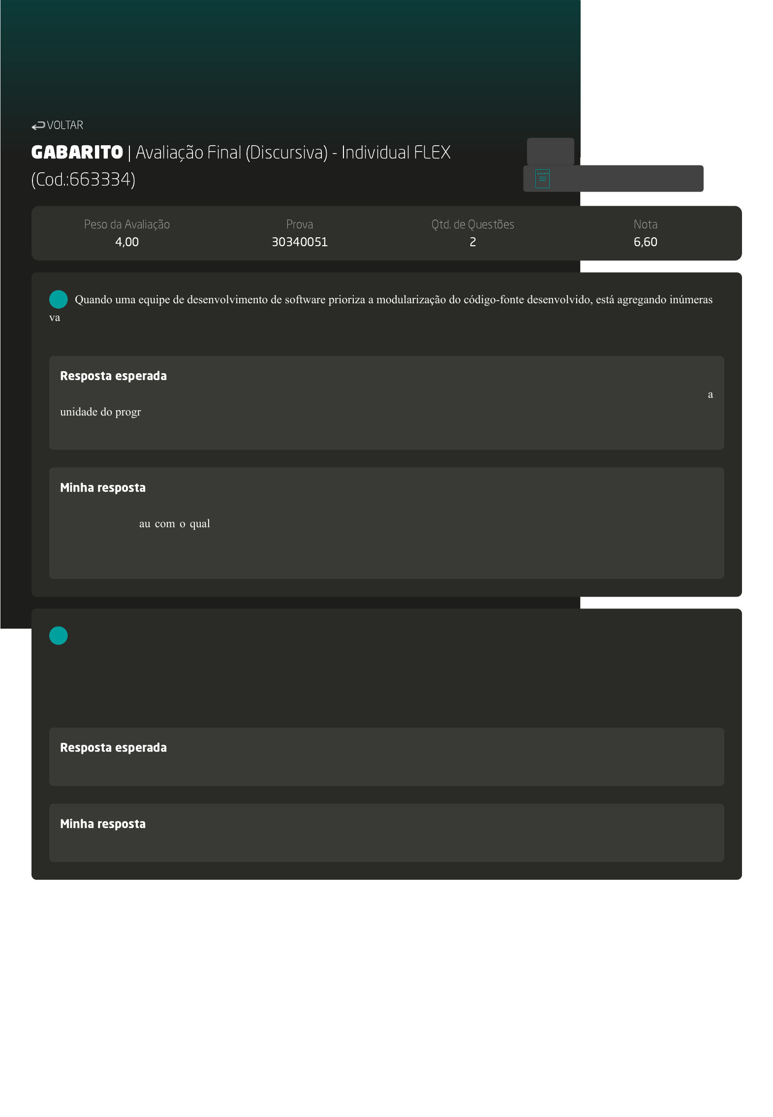 GABARITO | Avaliação Final (Discursiva) - Individual FLEX (Cod.:663334) Peso da Avaliação 4,00 Prova 30340051 Qtd. de Questões 2 Nota 6,60 Quando uma equipe de desenvolvimento de software prioriza a modularização do código-fonte desenvolvido, está agregando inúmeras vantagens. O código-fonte, quando coeso, apresenta baixo grau de acoplamento, enquanto um código-fonte com alto grau de acoplamento possui sua coesão condenada. Disserte sobre coesão e acoplamento. Resposta esperada A coesão é o grau de direcionamento de uma parte do programa para um objetivo. Já o acoplamento é o grau de conhecimento sobre uma unidade do programa para poder utilizá-la. Quando um código é coeso, ele apresenta baixo grau de acoplamento, logo, quando um código possui alto grau de acoplamento, possui a coesão condenada. Minha resposta Ambos dizem respeito a módulos de um sistema, apesar de que normalmente são conceitos associados a classes em orientação a objetos. A coesão é o grau com o qual um módulo tem uma responsabilidade única e bem definida. O acoplamento é o grau com o qual um módulo depende de outros módulos para seu funcionamento. O ideal, para que um sistema seja flexível e compreensível, são módulos com alta coesão e baixo acoplamento. A Linguagem de Marcação de Hipertexto (HTML) utiliza tags para estruturar o conteúdo que deve ser apresentado pelo navegador. Alguns exemplos são as tags de âncora, de imagens e de parágrafos. As tags podem receber características específicas por meio de atributos, assim personalizar e tornar duas tags de parágrafo diferentes, mesmo sendo o mesmo tipo de tag. Sobre HTML: escreva um documento Hello Word por meio de um HTML padrão; no Body deste HTML imprima um Parágrafo utilizando PHP; e no Head do HTML adicione uma regra para alinhar o texto do parágrafo à esquerda. Resposta esperada Hello World Hello World!"; ?> Minha resposta Hello World Hello World!"; ?> VOLTAR A+ Alterar modo de visualização 1 2