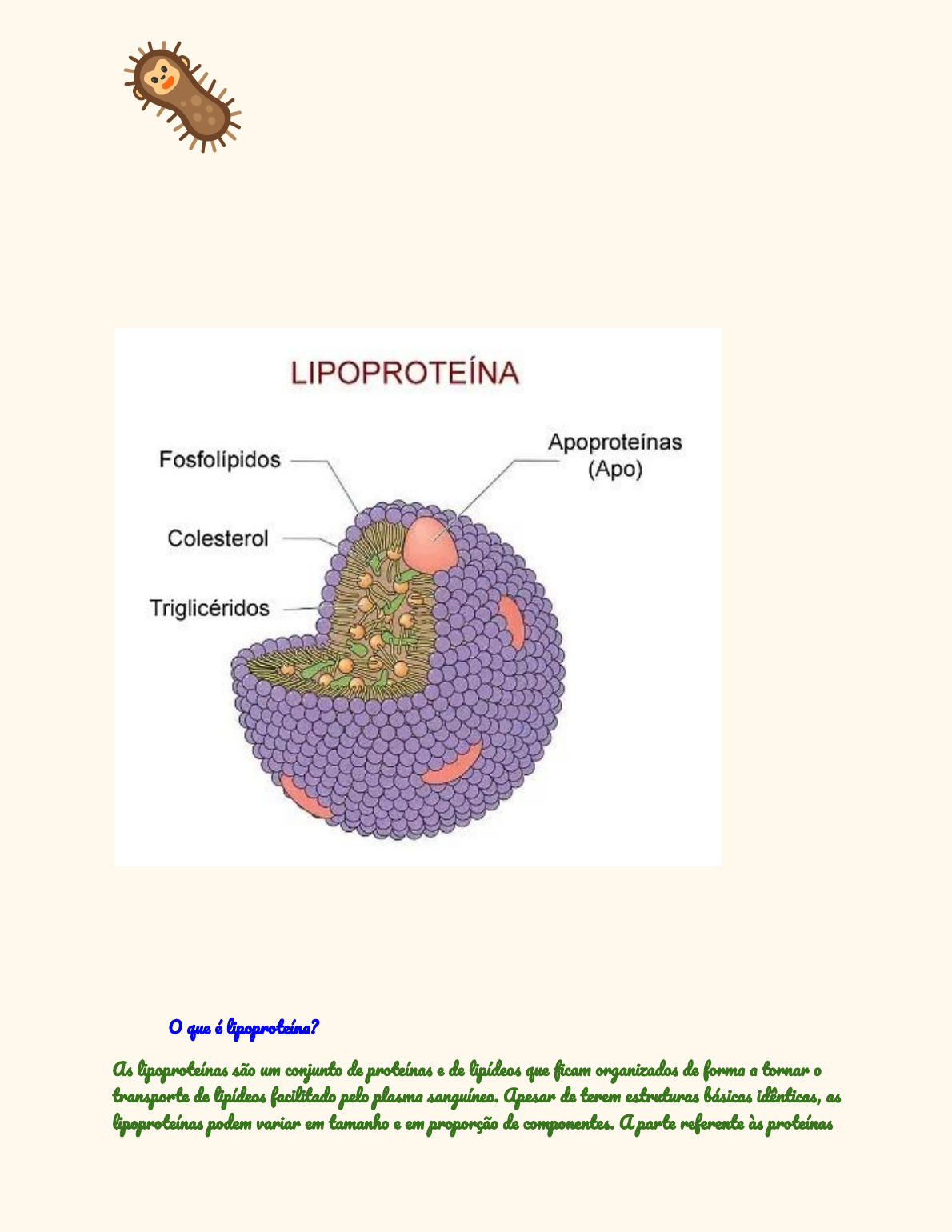 ○ Lipoproteínas ● O qu� � lipoproteín�? A� lipoproteína� sã� u� conjunt� d� proteína� � d� lipíde�� qu� fica� organizad�� d� form� � torna� � transpo�t� d� lipíde�� facilitad� pel� plasm� sanguíne�. Apesa� d� tere� estrutura� básica� idêntica�, a� lipoproteína� pode� varia� e� tamanh� � e� proporçã� d� componente�. A pa�t� referent� à� proteína� � formad� po� apoproteína�, j� � pa�t� referent� a�� lipíde�� � formad� po� colestero�, po� f�sfogliceríde�� � po� trigliceríde��. A� lipoproteína� pode�, po�tant�, dependend� d� su� formaçã�, sere� categorizada� e� quilomícron�, VLDL (lipoproteín� d� muit� baix� intensidad�), LDL (lipoproteín� d� baix� intensidad�) � e� HDL (lipoproteín� d� alt� intensidad�). ● Quilomícron� � VLDL O� quilomícron� sã� u� tip� d� lipoproteín� sintetizad� pela� célula� qu� fica� localizada� n� intestin�. Sã� molécula� grande� comp�sta� po� trigliceríde�� d� orige� alimenta� e� su� maiori�, cerc� d� 85 � 95%. Alé� diss�, p�ssue� també� cerc� d� 1 � 2% d� proteína� � um� baix� quantidad� d� colestero� livr�. Devid� a� fat� d� p�ssuíre� e� su� formaçã� mai� lipíde�� d� qu� proteína�, �� quilomícron� flutua� n� plasm� sanguíne�, j� qu� sã� men�� dens��. Co� iss�, deixa� � plasm� co� aspect� leit�s� � pode� até� mesm� leva� � produçã� d� um� camad� crem�s� quand� � plasm� � deixad� e� repous�. J� � VLDL , o� ver� lo� densit� lipoprotei�, � u� tip� d� lipoproteín� d� grand� tamanh�, entretant�, meno� d� qu� �� quilomícron�. Est� lipoproteín� � sintetizad� pela� célula� d� fígad� � � comp�st� e� médi� po� 50% d� trigliceríde��, 10% d� proteína� � po� 40% d� colestero�. O VLDL � u� tip� d� lipoproteín� qu� p�ssu� � funçã� d� transpo�ta� trigliceríde�� � colestero� par� tecid�� periféric��, ond� serã� armazenad�� o� usad�� com� um� font� d� energi�. D� mesm� form� qu� �� quilomícron�, �� VLDL també� pode� deixa� � plasm� turv�. desenh� d� um� Lipoproteín� ● LDL � HDL O LDL � u� tip� d� lipoproteín� d� baix� densidad�. Sã� pa�tícula� muit� pequena� qu� mesm� e� alta� concentraçõe� nã� sã� capaze� d� deixa� � plasm� turv�. O LDL � u� tip� d� lipoproteín� comp�st� po� cerc� d� 25% d� proteín� � 75% d� trigliceríde�� � f�sfolipíde��. P�ssu� � funçã� d� transpo�ta� colestero� par� locai� e� qu� el� p�ss� te� um� funçã� fisiológic�, po� exempl�, n� produçã� d� esteroide�. J� � HDL , o� hig� densit� lipoprotei�, � u� tip� d� lipoproteín� comp�st� basicament� po� 50% d� proteín�, 20% d� colestero�, 30% d� trigliceríde�� � po� vestígi�� d� f�sfolipíde��. O HDL pod� aind� se� subdivid� e� HDL2 � e� HDL3, variand� d� acord� co� � tamanh�, � densidad� � � comp�siçã�. Est� tip� d� lipoproteín� te� com� funçã� leva� � colestero� at� � fígad�. Alé� diss�, pode� atua� transferind� éstere� d� colestero� par� outr�� tip�� d� lipoproteín�, principalment� par� a� d� tip� VLDL . Po� fi�, � lipoproteín� HDL 2 � muit� conhecid� pel� su� açã� n� combat� � ater�scler�s�. Colestero� HDL Colestero� VLDL Colestero� LDL COLESTEROL LDL ALTO Qua� � � impo�tânci� d� lipoproteín�? O colestero� � um� su�stânci� gordur�s� qu� nã� consegu� s� dissolve� n� sangu�. El� � muit� impo�tant� par� � organism�, ma� e� quantidade� elevada� pod� traze� um� séri� d� complicaçõe�. Par� pode� se� transpo�tad� atravé� d� sangu� � pode� executa� sua� funçõe�, com� � síntes� d� hormôni��, � colestero� s� junt� à� lipoproteína�. A quantidad� d� lipoproteína� n� plasm� pod� indica�, po�tant�, alg� bo� o� rui�, dependend� d� tip�. Quand� � colestero� s� junt� � lipoproteína� d� tip� LDL pod� acaba� gerand� complicaçõe� com� formaçã� d� placa� e� vas�� sanguíne��. J� quand� � colestero� s� junt� � lipoproteína� d� tip� HDL , tra� benefíci�� com� remoçã� d� dep�sit� d� cristai� d� colestero� rui� da� parede� a�teriai� � da� veia�, evitand� co� iss� u� infa�t� o� entã� séria� doença� d� coraçã�.