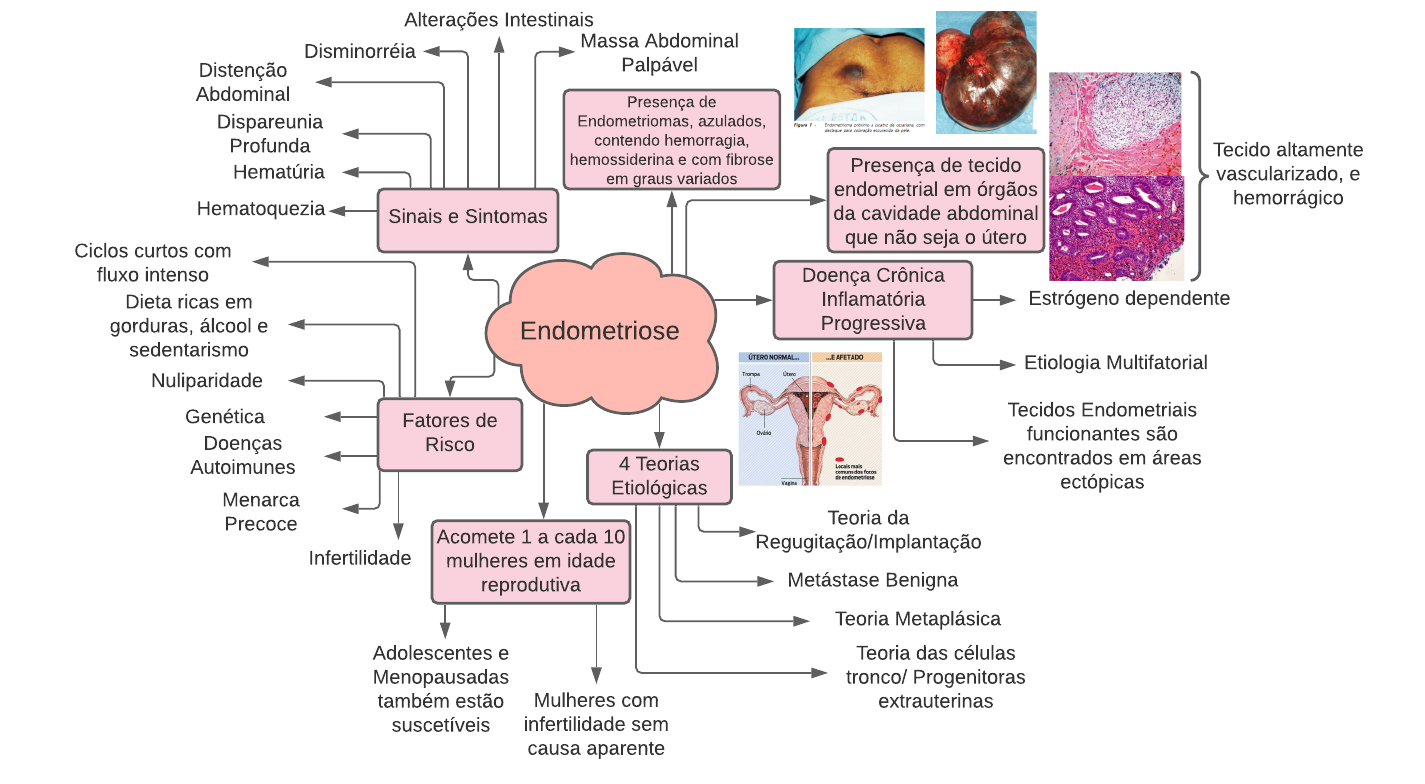 Endometriose Doença Crônica Inflamatória Progressiva Etiologia Multifatorial Tecidos Endometriais funcionantes são encontrados em áreas ectópicas Estrógeno dependente 4 Teorias Etiológicas Teoria da Regugitação/Implantação Metástase Benigna Teoria Metaplásica Teoria das células tronco/ Progenitoras extrauterinas Acomete 1 a cada 10 mulheres em idade reprodutiva Adolescentes e Menopausadas também estão suscetíveis Mulheres com infertilidade sem causa aparente Fatores de Risco Menarca Precoce Doenças Autoimunes Genética Nuliparidade Dieta ricas em gorduras, álcool e sedentarismo Ciclos curtos com fluxo intenso Infertilidade Presença de tecido endometrial em órgãos da cavidade abdominal que não seja o útero Tecido altamente vascularizado, e hemorrágico Presença de Endometriomas, azulados, contendo hemorragia, hemossiderina e com fibrose em graus variados Sinais e Sintomas Hematúria Dispareunia Profunda Hematoquezia Distenção Abdominal Disminorréia Massa Abdominal Palpável Alterações Intestinais Blank diagram Page 1