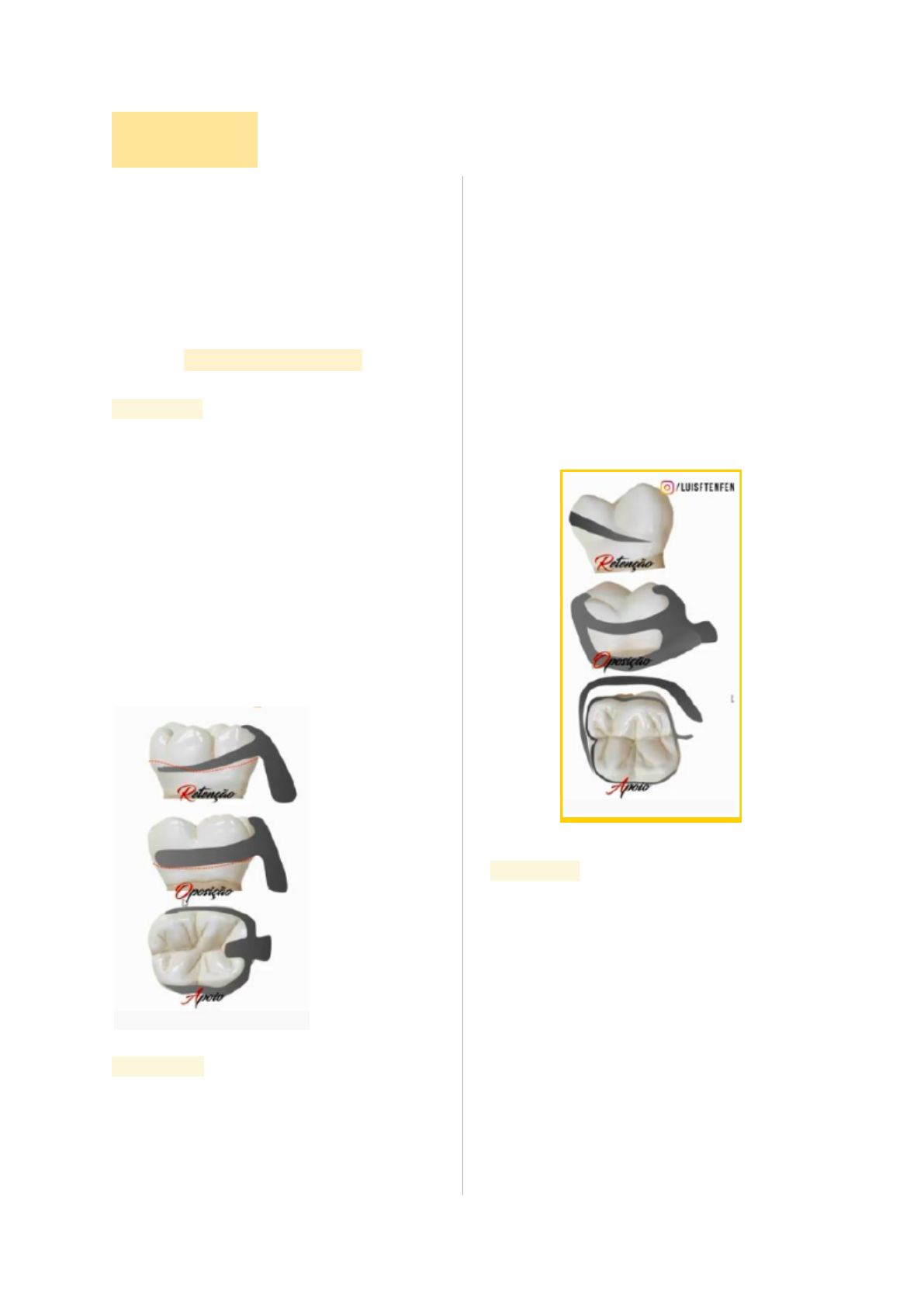 Letícia Custódio- Unigranrio Odontologia GRAMPOS ->A retenção é a resistência ao desalojamento da prótese no sentido cérvico-oclusal, podendo ser fisiológica, física ou mecânica. Essa retenção se dá pelos grampos e apoios. CIRCUNFERENCIAIS ⤏ Simples Características: ● O corpo e apoio dele estão próximos ao espaço protético; ● São os mais utilizados em próteses dentomucossuportadas. Aplicações: ● Molares e pré-molares; ● Caninos sem limitações estéticas. ⤏ Reverso Características ● Corpo e apoio estão distantes do espaço protético; ● Braço de oposição e retenção está voltado para o espaço protético. Aplicações: ● Molares superiores e inferiores posteriores ao espaço protético com inclinação para mesial. ● É mais estético, visto que o maior volume de material fica para distal. ⤏ Gêmeo: Características: ● É como se fosse a fusão de dois grampos simples; ● Retenção indireta; ● Podem ser unidos pelo apoio ou pelo braço de oposição. Aplicações: ● PM e Molares em classe II e III, sem modificações e em classe IV de Kennedy. Letícia Custódio- Unigranrio Odontologia ⤏ Anel Características: ● Tem 2 conectores menores e 2 apoios oclusais, interligados por um braço de oposição; ● Dá mais estabilidade ao dente; ● Exige o preparo de 2 nichos oclusais. Aplicações: ● PM e Molares isolados entre 2 espaços protéticos e m posições normais; ● Molares posteriores ao espaço protético, com inclinação mesiovestibular para os superiores e mesiolingual para os inferiores ⤏ Contínuo de Kennedy Características: ● Retenção feita por grampos de ação de ponta nos caninos, que se unem a uma barra lingual dentária anterior contínua ou barra lingual dupla; ● Elemento de estabilização para extremidades livres; ● Localizados nos cíngulos da face lingual dos dentes anteriores. Aplicações: ● Classe I (canino a canino) AÇÃO DE PONTA ⤏ Grampo T Características: Letícia Custódio- Unigranrio Odontologia ● É o mais indicado ● Bem flexível; ● Facilidade de obtenção de retenção. Aplicações: ● Incisivos, caninos e PMs. ⤏ Grampo U Características: ● Formato específico para coroas curtas e/ou limitação e m áreas retentivas. Aplicações: ● 3ºM inferiores com coroa curta ● Molares e PMs inferiores ⤏ Grampo L Características: ● Mais flexível; ● Boa retenção, porém menor que a do T; ● A ponta ativa atinge uma área de retenção oposto ao espaço protético. Aplicações: ● PM e Molares; ● Caninos inferiores em classe I e II ⤏ Grampo I Características: ● Mais estético; ● Grande capacidade de retenção; ● Pouco flexível devido ao tamanho e formato; ● Sua ponta ativa deve estar na área distovestibular, adjacente ao espaço. Aplicações: Letícia Custódio- Unigranrio Odontologia ● Canino e PM superiores, em caso de suporte dentário posterior; Contraindicação: ● Em casos de classe I ⤏ Grampo C Características ● Localizado adjacente ao espaço protético Aplicações ● PMs e molares inferiores quando a área de maior retenção se localiza adjacente ao espaço protético. ⤏ Grampo RPI Características ● Apoio na mesial com conector menor; ● Placa proximal distal; ● Grampo em I na face vestibular Aplicações ● Dentes próximos ao espaço protético em casos de extremidade livre, uni e bilateral.