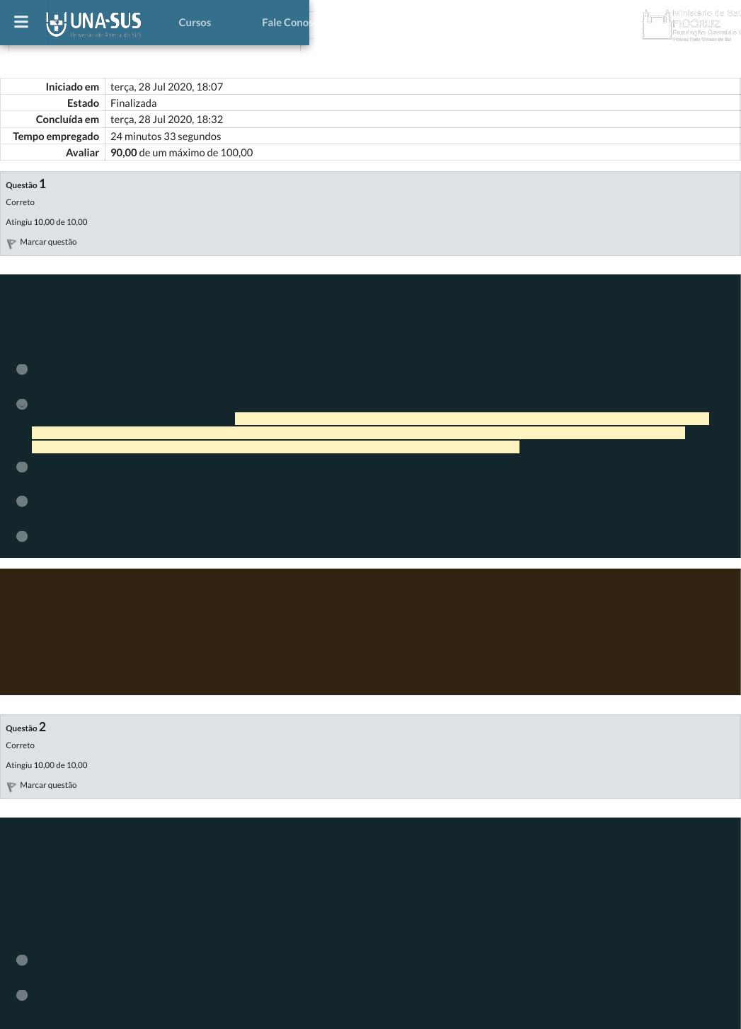 Iniciado em terça, 28 Jul 2020, 18:07 Estado Finalizada Concluída em terça, 28 Jul 2020, 18:32 Tempo empregado 24 minutos 33 segundos Avaliar 90,00 de um máximo de 100,00 Questão 1 Correto Atingiu 10,00 de 10,00 Marcar questão Questão 2 Correto Atingiu 10,00 de 10,00 Marcar questão Habilidade/Objetivo: Atuar no diagnóstico e prevenção da malária, junto aos diversos cenários rurais. Durante sua jornada de atendimentos em uma comunidade de assentamento rural, você atende o Sr. Jonas, apresentando febre, associada a calafrios e astenia. Diante da suspeita de malária qual a sua conduta? Escolha uma opção: a. Inicia o tratamento para malária falciparum e em caso de não haver melhora altera o tratamento para malária vivax, visto a necessidade de iniciar o tratamento precoce. b. Solicita a confirmação laboratorial, através da realização de Gota Espessa, que é o padrão ouro no diagnóstico da malária, e que, além da confirmação clínica, identifica a espécie de plasmódio. ! O diagnóstico de certeza da malária é laboratorial, e, além da confirmação clínica, identifica a espécie de plasmódio, fundamental para orientar o tratamento, sendo realizado através do exame de Gota Espessa (técnica mais utilizada para o diagnóstico laboratorial da malária, sendo considerada como o “padrão ouro” para a confirmação específica da doença). c. Inicia o tratamento para malária vivax, visto que os sinais e sintomas da malária são bem característicos, permitindo apenas o diagnóstico clínico, sem a necessidade de exames laboratoriais. d. Em respeito as questões culturais e de proteção ambiental dos ambientes rurais, você contraindica o uso de repelentes e telagem de portas e janelas das casas. e. Desconsidera informações sobre a procedência do Sr. Jonas, visto que na malária o diagnóstico epidemiológico não é relevante. Sua resposta está correta. REFERÊNCIA BRASIL. Ministério da Saúde. Ações de controle da malária: manual para profissionais de saúde na Atenção Básica. Brasília: Ministério da Saúde, 2006. BRASIL. Ministério da Saúde. Guia prático de tratamento da malária no Brasil. Brasília: Ministério da Saúde, 2010. A resposta correta é: Solicita a confirmação laboratorial, através da realização de Gota Espessa, que é o padrão ouro no diagnóstico da malária, e que, além da confirmação clínica, identifica a espécie de plasmódio. Habilidade/Objetivo: Conhecer e aplicar os pressupostos da organização dos serviços de atenção à saúde dos povos indígenas, por meio do Subsistema de Atenção à Saúde Indígena e sua integração com a rede do SUS. Para responder a questão, leia e analise a situação descrita abaixo: Ticia, moradora da aldeia de Lima Verde levou seu filho Dionisio de quatro meses, para atendimento na Unidade Básica de Saúde da aldeia. Mãe refere que há três dias Dionisio apresenta diarreia com fezes liquidas (5 a 7 episódios/dia) e com muco. Relata ainda desconforto abdominal, hiporexia, febre (39°C) e vômitos pós-prandiais. Em relação à forma de organização do atendimento para Dionisio, marque a alternativa INCORRETA. Escolha uma opção: a. A criança pós-hospitalização e em fase de recuperação poderá receber assistência de enfermagem na Casa de saúde do índio (CASAI), devendo esta ser localizada no município de referencia da rede SUS. b. No retorno a aldeia, a criança deverá receber a visita domiciliar do agente indígena de saúde, além de ser acompanhada pela equipe multidisciplinar de saúde indígena que atende no Posto de Saúde. ! Cursos Fale Conosco Sair" Karen Chrystina Felizardo VasconcelosVocê acessou como 13/10/2021 23:48 Página 1 de 6 Questão 3 Correto Atingiu 10,00 de 10,00 Marcar questão Questão 4 Correto Atingiu 10,00 de 10,00 Marcar questão c. Durante o período em que a criança estiver em tratamento nos serviços de saúde da rede SUS, a mãe e/ou outro parente da criança poderá ficar na Casa de saúde do índio (CASAI), onde terá abrigo e alimentação. d. A criança deverá ser atendida pelo médico da equipe multidisciplinar de saúde indígena (EMSI) do Posto de Saúde da aldeia. O médico ao avaliar a gravidade da criança deverá realizar o referenciamento da criança para um serviço da rede SUS, no município. e. O médico da equipe multidisciplinar de saúde indígena do Posto de Saúde da aldeia deverá comunicar o DSEI para que o mesmo preste os serviços de saúde de atenção básica, média e alta complexidade dentro de seu território. ! Cada DSEI dispõe de uma rede de serviços de saúde de atenção básica dentro de seu território, integrada e hierarquizada com complexidade crescente e articulada com a rede do Sistema Único de Saúde. Com o objetivo de garantir o acesso à atenção de média e alta complexidade, devem ser definidos procedimentos de referência, contrarreferência nos serviços de rede do SUS. O DSEI é definido como um espaço etno-cultural dinâmico, geográfico, populacional e administrativo bem delimitado -, que contempla um conjunto de atividades técnicas, visando medidas racionalizadas e qualificadas de atenção à saúde, promovendo a reordenação da rede de saúde e das práticas sanitárias e desenvolvendo atividades administrativo-gerenciais necessárias à prestação da assistência, com controle social. Referências: CARDOSO, A. M. et al. Saúde dos povos indígenas e políticas públicas no Brasil. In: GIOVANELLA, L. et al. (Org.). Políticas e Sistemas de Saúde no Brasil. 2. ed. Rio de Janeiro: ed. Fiocruz, 2012, p. 911-932. Sua resposta está correta. A resposta correta é: O médico da equipe multidisciplinar de saúde indígena do Posto de Saúde da aldeia deverá comunicar o DSEI para que o mesmo preste os serviços de saúde de atenção básica, média e alta complexidade dentro de seu território. Habilidade/Objetivo: Reconhecer ações que promovam a melhoria de saúd