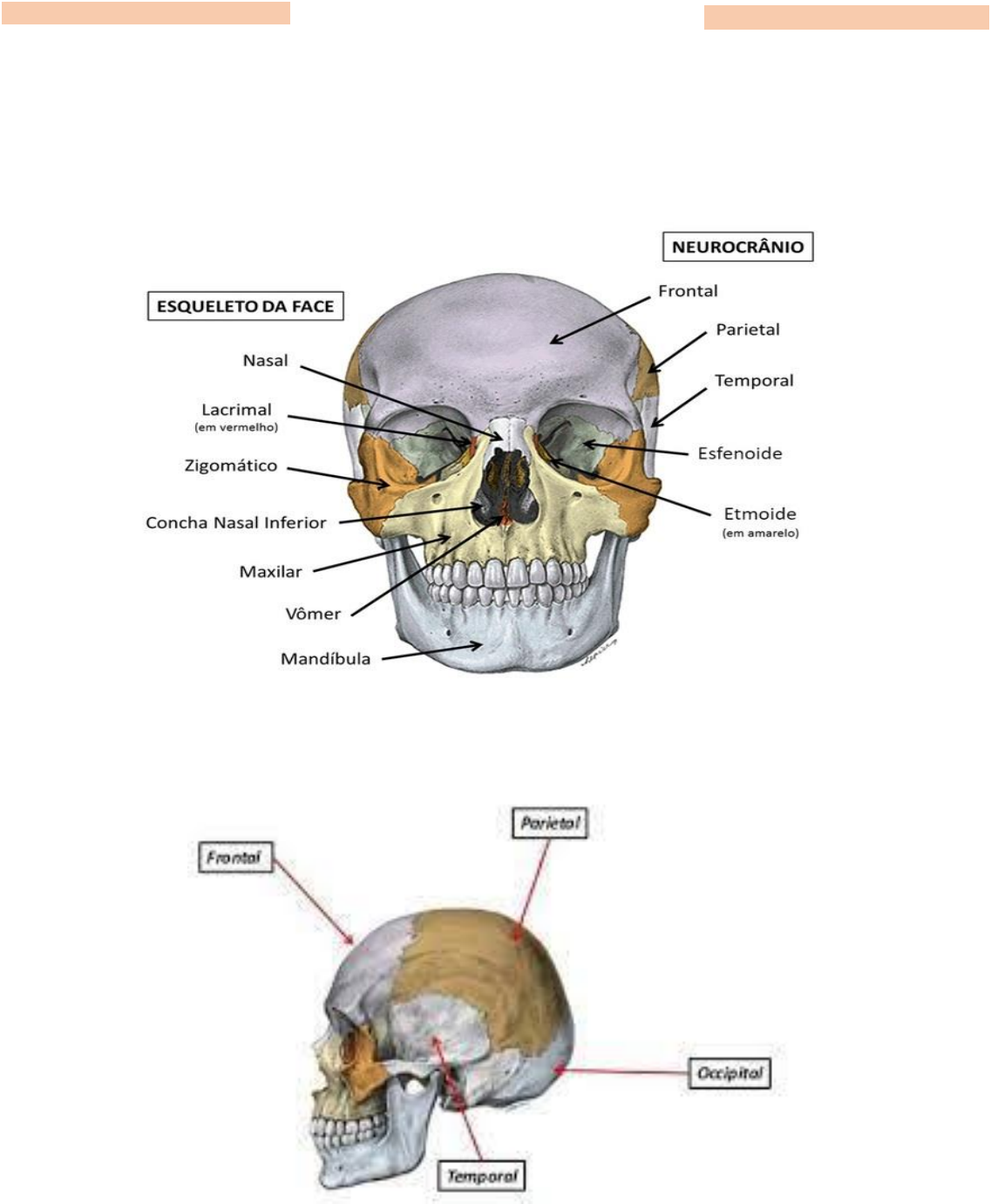 OSTEOLOGIA CRANIOFACIAL ACIDENTES ANATÔMICOS • Vicerocrânio: • Neurocrânio: Anatomia da mandíbula • Osso ímpar • Arcada dentária inferior • Dividido anatomicamente em 02 porções: – Horizontal (corpo) – Duas porções verticais perpendiculares (ramos) Anatomia da Maxila • Osso par, irregular e plano • Forma quatro cavidades: teto da cavidade bucal; assoalho da cavidade nasal; parede lateral da cavidade nasal; assoalho da órbita; seio maxilar ANATOMIA DOS OSSOS PALATINOS • Duas porções: – Lâmina perpendicular e lâmina horizontal Anatomia do Zigoma • Osso par • Relaciona-se com a maxila, osso frontal, osso esfenoide, osso temporal • Formação da cavidade orbital