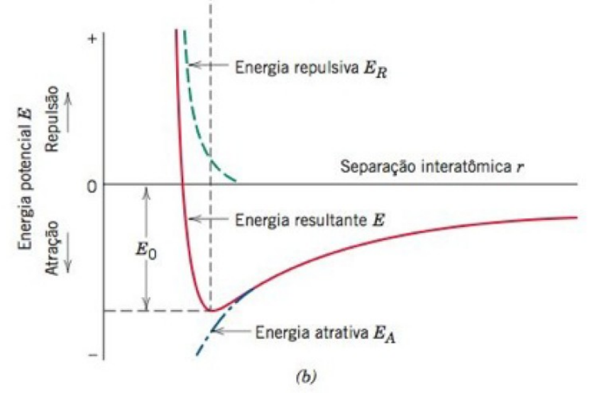 Ligações químicas Para compreender as propriedades dos materiais, precisamos conhecer as forças interatômicas que unem os átomos entre si. A grandes distâncias, as interações entre átomos são desprezíveis, porém, na medida em que os átomos se aproximam, cada um exerce forças sobre o outro. Essas forças atrativas dependem do tipo específico de ligação e as forças repulsivas são devido à sobreposição das camadas eletrônicas mais externas dos átomos envolvidos. Quando os átomos assumem uma distância de separação ideal, as forças de atração (FA) e repulsão (FR) se igualam e não existe qualquer força resultante. Assim, assume-se um estado de equilíbrio onde os átomos estão separados por uma distância r0. Uma vez na situação de equilíbrio, as forças repulsivas irão contrabalancear qualquer tentativa de aproximação dos átomos e forças atrativas irão contrabalancear qualquer tentativa de separação destes. Agora, ao invés de tratar de força, vamos trabalhar com energias potenciais entre dois átomos. O gráfico a seguir mostra as energias potenciais atrativas, repulsivas e total em função da separação interatômica para dois átomos. A curva para a energia resultante é igual à soma das outras duas, apresentando um poço de energia potencial ao redor do seu mínimo em r0. A energia de ligação, E0, corresponde à energia potencial no ponto de mínimo em r0 e representa a energia necessária para afastar dois átomos até uma distância infinita. A magnitude da energia de ligação e a forma da curva de energia potencial em função da separação interatômica variam de material para material e dependem do tipo de ligação química. Além disso, inúmeras propriedades dependem de E0, do formato da curva e do tipo de ligação. Geralmente, materiais com energias de ligação altas também possuem elevadas temperaturas de fusão. Um poço íngreme de energia potencial também pode indicar um material com módulo de elasticidade alto. A assimetria da curva pode estar associada à maiores coeficientes de dilatação térmica, etc. Três tipos de ligações químicas primárias são encontradas nos sólidos: ligação iônica, covalente e metálica. Em todos os tipos de ligação há a tendência dos átomos em adquirir estruturas eletrônicas estáveis pelo preenchimento completo da camada eletrônica mais externa. Ligação iônica: - Consiste na ligação entre átomos com eletronegatividade distinta, como elementos metálicos e não metálicos de diferentes extremidades da tabela periódica. Os metais, por exemplo, perdem com facilidade seus elétrons para os não-metais. Nesse processo, todos os átomos adquirem configurações eletrônicas estáveis e, além disso, uma carga elétrica. Ex: NaCl Na+ Cl- A ligação iônica é não direcional, isto é, a magnitude da ligação é igual em todas as direções ao redor do íon. Sendo assim, para que um arranjo tridimensional se mantenha estável, todos os íons positivos devem ter como vizinhos íons carregados negativamente e vice versa. As energias de ligação iônica variam de 600 a 1500 kJ/mol. Esses valores são relativamente altos, o que se refletem em temperaturas de fusão elevadas. Além disso, matérias iônicos são caracteristicamente duros e frágeis e, além disso, isolantes elétricos e térmicos. Ligação covalente: - Na ligação covalente, configurações eletrônicas estáveis são adquiridas por meio do compartilhamento de elétrons entre os átomos. Neste tipo de ligação, os elétrons compartilhados podem ser considerados pertencentes à ambos os átomos. Ex: Metano CH4 A ligação covalente é direcional, isto é, ela ocorre entre átomos específicos e pode existir apenas na direção entre um átomo e o outro que participa do compartilhamento de elétrons. Esse tipo de ligação é encontrado em sólidos elementares como o diamante e o grafite (carbono), o silício e o germânio. As ligações covalentes podem ser muito fortes, como no caso do diamante, que é muito duro e tam temperatura de fusão muito elevada (>3550 °C), ou elas podem ser muito fracas, como acontece com o bismuto, que se funde a aproximadamente 270 °C. É possível a existência de ligações que sejam parcialmente iônicas e parcialmente covalentes. Na prática, poucos compostos apresentam ligações exclusivamente iônicas ou covalentes. O grau de cada tipo de ligação depende das posições relativas dos seus átomos constituintes na tabela periódica ou da diferença de suas eletronegatividades. Ligação metálica: Na tabela periódica, a grande maioria dos elementos possui caráter metálico predominante. Os materiais metálicos podem ser formados por apenas um elemento químico metálico, mas são frequentemente formados pela combinação em solução sólida de elementos metálicos, ou seja, ligas. Os elementos químicos metálicos possuem 1, 2 ou 3 elétrons de valência e, por isso, tendem a formar íons positivos. No modelo proposto para as ligações metálicas, os elétrons de valência não estão ligados a nenhum átomo particular, formando uma “nuvem de elétrons” em que os elétrons pertencem ao metal como um todo. Na prática, a “nuvem de elétrons” atua como uma proteção às forças eletrostáticas repulsivas entre estes núcleos iônicos, atuando como uma “cola” que mantém a estrutura íntegra e atribuindo um caráter não direcional à ligação metálica. As ligações metálicas podem ser fortes ou fracas. Desde 68 kJ/mol para o mercúrio (Hg) até 850 kJ/mol para o tungstênio (W). Isso tem influência direta na temperatura de fusão desses metais. Tm Hg = -39 °C Tm W = 3410 °C Alguns comportamentos dos metais podem ser justificados pelo modelo proposto para as ligações metálicas. Devido aos elétrons livres, pode-se justificar a boa condutividade elétrica e térmica dos metais. Materiais iônicos e covalentes são, normalmente, isolantes elétr