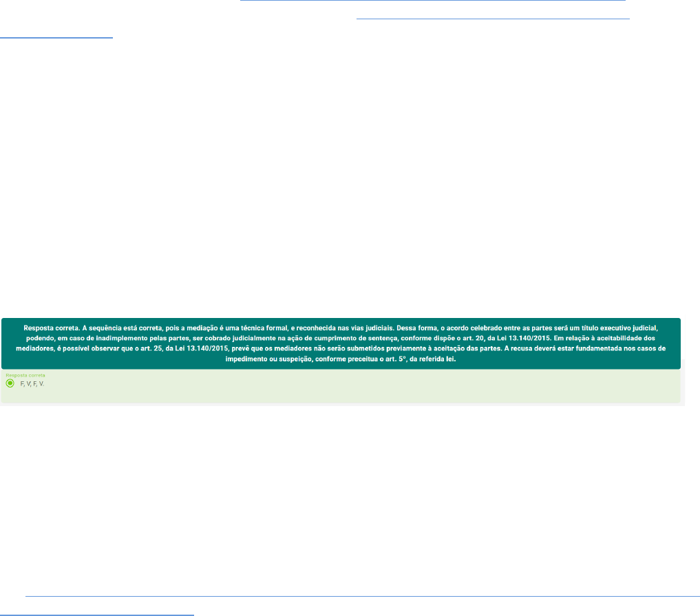 Leia o excerto abaixo: “[...] A história recente das diferentes formas de trabalhar com a mediação informa que a mediação se estruturou a partir da negociação da escola de direito de Harvard como uma alternativa ao Poder Judiciário que se desenvolveu e se consolidou integrando distintas áreas do conhecimento [...].” SANTOS, T. M. dos. Mediação judicial no Brasil: breves notas conceituais à luz dos princípios constitucionais. Revista de Direito,https://dialnet.unirioja.es/servlet/articulo?codigo=7085877 Viçosa, v. 10, n. 1, p. 195-220, 2018. Disponível em: https://dialnet.unirioja.es/servlet/articulo?codigo=7085877. Acesso em: 8 maio 2020. Considerado o excerto apresentado, analise as afirmativas a seguir, a respeito dos tipos de mediação conforme a Lei 13.140/2015, e assinale V para a(s) Verdadeira(s) e F para a(s) Falsa(s). I. Será possível solicitar mediação no início da ação judicial; após decorrido esse prazo, não será mais possível. II. Tendo sido celebrado acordo entre as partes na mediação judicial, esse título será denominado título executivo judicial. III. Na mediação extrajudicial, o início será considerado a partir do convite enviado por meio de oficial de justiça. IV. Na mediação judicial, as partes não poderão recusar previamente a indicação do tribunal referente à composição dos mediadores. Assinale a alternativa que apresenta a sequência correta: A Constituição Federal de 1988 dispõe, em seu art. 133, sobre a presença indispensável do advogado para a administração da justiça, por essa atribuição constitucional, é possível concluir que esse profissional deve estar presente em todos os atos jurisdicionados. Por essa definição, análise, as opções que correspondam à presença do advogado nas sessões de mediação, a fim de acompanhar o seu cliente. BRASIL. Constituição da República Federativa do Brasil de 1988. Diário Oficial da União. Disponível em:http://www.planalto.gov.br/ccivil_03/constituicao/constituicao.htmhttp://www.planalto.gov.br/ccivil_03/constituicao/constituicao.htm. Acesso em 09 maio 2020. I - Na mediação judicial, não será necessária a presença do advogado, em razão do princípio da informalidade. II - Na mediação extrajudicial, as partes poderão estar acompanhadas de advogado, ou seja, não é obrigatório. III - Nas mediações judicial e extrajudicial, é imprescindível que o advogado esteja presente, atuando informalmente. IV - Na mediação judicial, é fundamental a presença do advogado em causas cujo valor não ultrapasse vinte salários mínimos. Está correto o que se afirma em A transportadora Entrega Rápida estabelece vários contratos com clientes e fornecedores, tanto de âmbito público como privado. O seu contato não tem previsão do uso de Câmara Arbitral em caso de algum tipo de conflito no decorrer das relações firmadas. Ocorreu, recentemente, um conflito entre a transportadora e um fornecedor, referente à compra de um caminhão especial de entregas, estimado em mais de 50 salários mínimos. No caso apresentado, sobre a transportadora necessitar resolver o mais breve possível o conflito gerado com o fornecedor, analise as afirmativas a seguir e assinale V para a(s) verdadeira(s) e F para a(s) Falsa(s). I. Nesse caso, a transportadora terá de se reportar ao judiciário, já que não contém cláusula para resolver pela via arbitral. II. A transportadora e o fornecedor poderão chegar a um acordo de forma consensual e voluntária, sem a necessidade do judiciário. III. Poderá interpor ação em juizado especial, para que a solução do conflito seja resolvida o mais rápido possível, por meio de conciliação. IV. Poderá utilizar a via arbitral mesmo sem cláusula contratual, sendo, portanto, desnecessária a via judicial. Assinale a alternativa que apresenta a sequência correta: Natália tem 18 anos e ingressou na faculdade de Medicina, distante de sua cidade. Seus pais são separados e seu pai jamais pagou pensão alimentícia. A mãe de Natália resolveu não entrar com a respectiva ação. Contudo, nesse momento, Natália necessita da ajuda de seu pai, para que possa morar em outra cidade, e o pouco que a mãe ganha não será suficiente para sustentá-la. Natália procurou o pai, que se recusou a auxiliar dizendo que ela deveria procurar um emprego para custear as despesas. No caso apresentado, identifique as opções possíveis às quais Natália poderá recorrer para resolver o conflito. I - Natália poderia procurar a defensoria pública da sua cidade para entrar com uma ação no juizado especial. II - As partes poderiam tentar se compor por meio de negociação direta, procurando estabelecer diálogo. III - Natália poderia procurar diretamente o juizado especial, solicitando que fosse realizada sessão de mediação ou conciliação. IV - Natália poderia procurar um advogado, solicitando auxílio para resolução do conflito sem a ingerência do Poder Judiciário. Está correto o que se afirma em: Leia o excerto abaixo: “[...] Muitas vezes, a discussão da cláusula arbitral é relegada para a ‘última hora’, quando os advogados e as partes já chegaram a um acordo nas questões cruciais do contrato e não pretendem debater sobre matérias que lhes pareçam apenas eventuais e menos relevantes, como o mecanismo de solução de controvérsias [...].” REYNOL, T. S. G. S. Cláusulas arbitrais patológicas e cuidados na redação de cláusula compromissórias. 2017. Dissertação (Mestrado em Direito) - Escola de Direito de São Paulo, Fundação Getúlio Vargas, São Paulo, 2017. p. 8. Disponível em: https://bibliotecadigital.fgv.br/dspace/handle/10438/19097. Acesso em: 8 maio 2020. A respeito da Cláusula Compromissória Arbitral, analise as afirmativas a seguir, e assinale V para a(s) verdadeira(s) e F para a(s) Falsa(s). I. Tanto na arbitragem judicial quanto na extrajudicial, os contratos que tenham cláusula compromissória