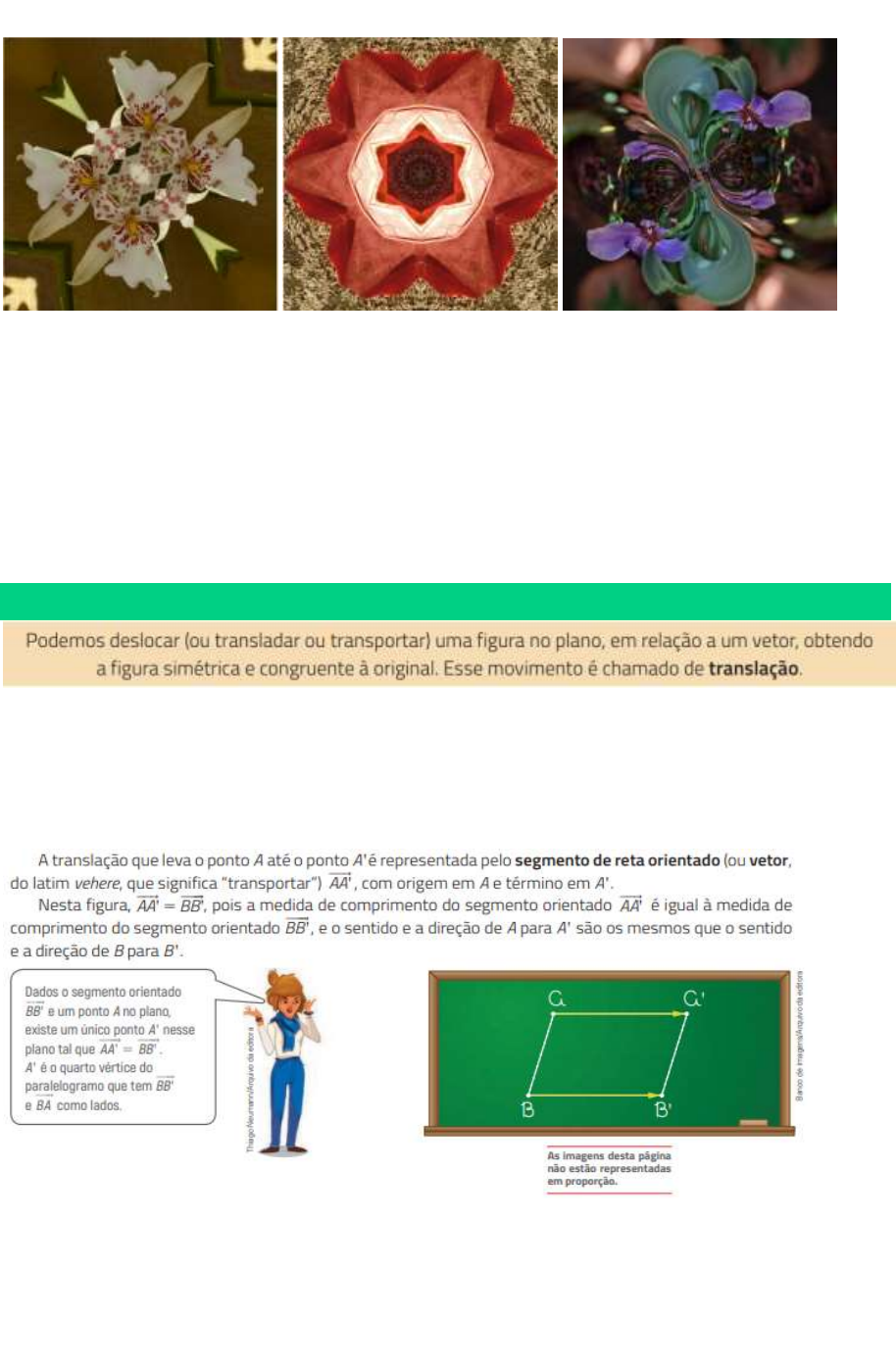 Aula 7: Transformações geométricas: simetrias de translação, reflexão e rotação. Fonte: produção do NEC (acervo pessoal da coordenadora de GT A. C.) As imagens tem uma característica em comum, relaciona-se ao conceito de simetria, pois todas as figuras são ou estão em simetria. Simetria pode ser uma conformidade, em medida, forma e posição relativa, entre as partes dispostas em cada lado de uma linha divisória, um plano médio, um centro ou um eixo. Transformação geométrica de TRANSLAÇÃO Fonte: (DANTE, 2018, p. 236) Para exemplificar um modelo de translação, observe o esquema abaixo que representa a translação de um segmento de reta AB. Fonte: (DANTE, 2018, p. 236) Perceba que a translação realizada, além da formação do paralelogramo ABA’B’ os segmentos de reta AA’ e BB’ são paralelos. Outro caso importante de visualização é a translação na malha quadriculada. Transformação geométrica de ROTAÇÃO Fonte: (DANTE, 2018, p. 239) Exemplificando a transformação geométrica de rotação, toma-se por base a representação abaixo: Fonte: (PATARO e BALESTRI, 2018, p. 101) Um fator muitíssimo importante a ser observado na transformação geométrica de rotação é que ela parte de um ponto, e é esse ponto quem dá a orientação angular da devida transformação que irá ocorrer ou já ocorrida. No outro exemplo abaixo, tem-se uma rotação sofrida por um triângulo de cor roxa para um triângulo de cor verde, onde o ponto de simetria que coordena a inclinação angular é o ponto A. Observe: Fonte: (DANTE, 2018, p. 242) Transformação geométrica de REFLEXÃO Fonte: (DANTE, 2018, p. 236) A transformação geométrica de reflexão é a mais conhecida entre todas as simetrias, pois é a simetria que oportuniza o espelhamento. Assim, é muito comum observar a transformação acontecer quando nos olhamos no espelho, ou até mesmo visualizamos a imagem de uma paisagem refletida em um “espelho d’água”. Para exemplificar, observe a situação abaixo: Fonte: (DANTE, 2018, p. 236) Observe que, para obter-se uma transformação geométrica de reflexão, é necessário um eixo de simetria, em que cada um dos pontos correspondentes estejam à mesma distância desse eixo de simetria. Há, também, casos de transformações geométricas que estão em rotação, mas a própria imagem já é por si mesma simétrica. Observe: Fonte: (PATARO e BALESTRI, 2018, p. 101) Ao refletir cada uma dessas imagens em relação ao eixo de reflexão e, a figura obtida corresponde à figura original. Quando isso ocorre, o eixo de reflexão é também chamado de eixo de simetria da figura e a figura é chamada de figura simétrica. Exercício de Reflexão Questão 01. Observe a imagem abaixo que foi transladada. Após uma análise criteriosa, sobretudo dos pontos correspondentes, determine qual a direção e sentido do segmento de reta orientador que confirma a transformação geométrica. Fonte: (DANTE, 2018, p. 236) Questão 02. Em cada item, classifique no caderno a transformação da figura da casinha da direita em relação à da esquerda. Fonte: (DANTE, 2018, p. 244) Questão 03. Descreva no caderno as transformações geométricas que podem ser observadas nestas figuras. Fonte: (DANTE, 2018, p. 244) a) De C para C’. b) De C’ para C”. c) De C para C”. Questão 04. Em cada item, a figura II foi obtida por translação da figura I. Escreva a direção, a medida da distância e o sentido dessa translação. Fonte: (PATARO e BALESTRI, 2018, p. 102)