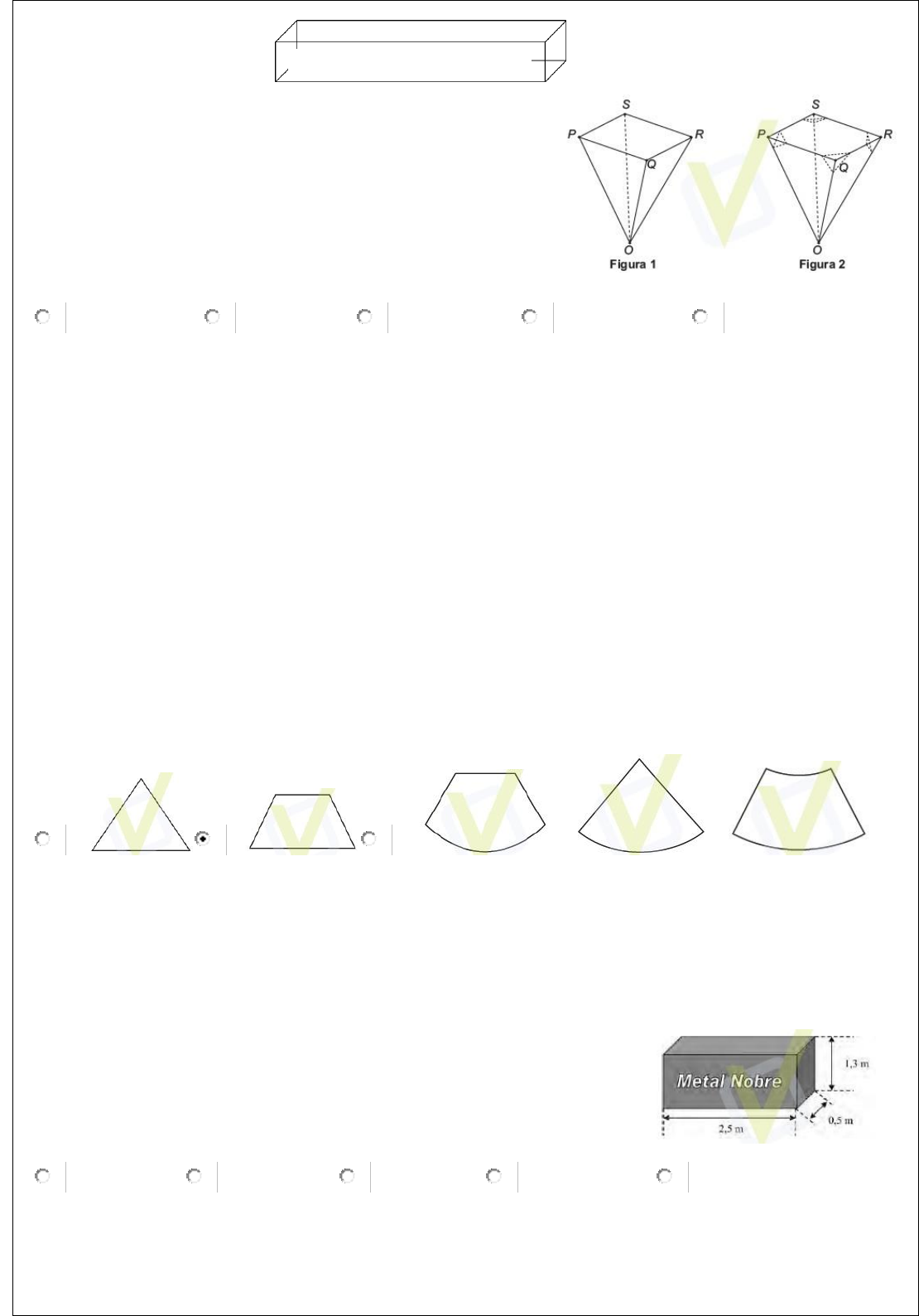 1. (ENEM 2016) Um lapidador recebeu de um joalheiro a encomenda para trabalhar em uma pedra preciosa cujo formato é o de uma pirâmide, conforme ilustra a Figura 1. Para tanto, o lapidador fará quatro cortes de formatos iguais nos cantos da base. Os cantos retirados correspondem a pequenas pirâmides, nos vértices P, Q, R e S, ao longo dos segmentos tracejados, ilustrados na Figura 2. Depois de efetuados os cortes, o lapidador obteve, a partir da pedra maior, uma joia poliédrica cujos números de faces, arestas e vértices são, respectivamente, iguais a a) 9, 20 e 13. b) 9, 24 e 13. c) 7, 15 e 12. d) 10, 16 e 5. e) 11, 16 e 5. 2. (Enem 2015) Para o modelo de um troféu foi escolhido um poliedro P, obtido a partir de cortes nos vértices de um cubo. Com um corte plano em cada um dos cantos do cubo, retira-se o canto, que é um tetraedro de arestas menores do que metade da aresta do cubo. Cada face do poliedro P, então, é pintada usando uma cor distinta das demais faces. Com base nas informações, qual é a quantidade de cores que serão utilizadas na pintura das faces do troféu? a) 6 b) 8 c) 14 d) 24 e) 30 3. A única caixa d´água de uma casa tem a forma de um cubo de aresta 1,4 m. A caixa possui paredes de espessura desprezível, e está completamente cheia de água. Admitindo-se que o consumo diário de água dessa casa seja de 392 litros, e que não haja reposição de água na caixa, sua capacidade será suficiente para atender as necessidades da casa por, no máximo, (Dado: 1m³ = 1000L). a) 7 dias. b) 20 dias. c) 18 dias. d) 12 dias. e) 28 dias. 4. (ENEM 2014) Um sinalizador de trânsito tem o formato de um cone circular reto. O sinalizador precisa ser revestido externamente com adesivo fluorescente, desde sua base (base do cone) até a metade de sua altura, para sinalização noturna. O responsável pela colocação do adesivo precisa fazer o corte do material de maneira que a forma do adesivo corresponda exatamente à parte da superfície lateral a ser revestida. Qual deverá ser a forma do adesivo? a) b) c) d) e) 5. (ENEM 2010) Uma fábrica produz barras de chocolates no formato de paralelepípedos e de cubos, com o mesmo volume. As arestas da barra de chocolate no formato de paralelepípedo medem 3 cm de largura, 18 cm de comprimento e 4 cm de espessura. Analisando as características das figuras geométricas descritas, a medida das arestas dos chocolates que têm o formato de cubo é igual a a) 5 cm. b) 6 cm c) 12 cm d) 24 cm e) 25 cm 6. (ENEM 2010) A siderúrgica “Metal Nobre” produz diversos objetos maciços utilizando o ferro. Um tipo especial de peça feita nessa companhia tem o formato de um paralelepípedo retangular, de acordo com as dimensões indicadas na figura que segue. O produto das três dimensões indicadas na peça resultaria na medida da grandeza a) massa. b) volume. c) superfície. d) capacidade. e) comprimento. Geometria Espacial (ENEM) https://d3nrbuzrdlzz76.cloudfront.net/sis_questoes/posts/40415_pre.jpg?1413514548 https://d3nrbuzrdlzz76.cloudfront.net/sis_questoes/posts/135445_pos.jpg?1493994215 7. (ENEM 2010) Um porta-lápis de madeira foi construído no formato cúbico, seguindo o modelo ilustrado a seguir. O cubo de dentro é vazio. A aresta do cubo maior mede 12 cm e a do cubo menor, que é interno, mede 8 cm. O volume de madeira utilizado na confecção desse objeto foi de a) 12 cm³ b) 64 cm³ c) 96 cm³ d) 1216 cm³ e) 1728 cm³ 8. (ENEM 2016) Uma caixa-d’água em forma de um paralelepípedo retângulo reto, com 4 m de comprimento, 3 m de largura e 2 m de altura, necessita de higienização. Nessa operação, a caixa precisará ser esvaziada em 20 min, no máximo. A retirada da água será feita com o auxílio de uma bomba de vazão constante, em que vazão é o volume do líquido que passa pela bomba por unidade de tempo. A vazão mínima, em litro por segundo, que essa bomba deverá ter para que a caixa seja esvaziada no tempo estipulado é a) 2 b) 3 c)5 d) 5 e) 20 9. (ENEM 2015) Para resolver o problema de abastecimento de água foi decidida, numa reunião do condomínio, a construção de uma nova cisterna. A cisterna atual tem formato cilíndrico, com 3 m de altura e 2 m de diâmetro, e estimou-se que a nova cisterna deverá comportar 81 m3 de água, mantendo o formato cilíndrico e a altura da atual. Após a inauguração da nova cisterna a antiga será desativada. Utilize 3,0 como aproximação para π. Qual deve ser o aumento, em metros, no raio da cisterna para atingir o volume desejado? a) 0,5 b) 1,0 c) 2,0 d) 3,5 e) 8,0 10. (Enem 2016) É comum os artistas plásticos se apropriarem de entes matemáticos para produzirem, por exemplo, formas e imagens por meio de manipulações. Um artista plástico, em uma de suas obras, pretende retratar os diversos polígonos obtidos pelas intersecções de um plano com uma pirâmide regular de base quadrada. Segundo a classificação dos polígonos, quais deles são possíveis de serem obtidos pelo artista plástico? a) Quadrados, apenas. b) Triângulos e quadrados, apenas. c) Triângulos, quadrados e trapézios, apenas. d) Triângulos, quadrados, trapézios e quadriláteros irregulares, apenas. e) Triângulos, quadrados, trapézios, quadriláteros irregulares e pentágonos, apenas. 11. Uma fábrica de sorvetes utiliza embalagens plásticas no formato de paralelepípedo retangular reto. Internamente, a embalagem tem 10 cm de altura e base de 20 cm por 10 cm. No processo de confecção do sorvete, uma mistura é colocada na embalagem no estado líquido e, quando levada ao congelador, tem seu volume aumentado em 25%, ficando com consistência cremosa. Inicialmente é colocada na embalagem uma mistura sabor chocolate com volume de 1 000 cm3 e, após essa mistura ficar cremosa, será adicionada uma mistura sabor morango, de modo que, ao final do processo de congelamento, a embalagem fique completamente preenchida com sorvete, sem transbordar. O volume máximo, em cm³, da mistura sabor mora