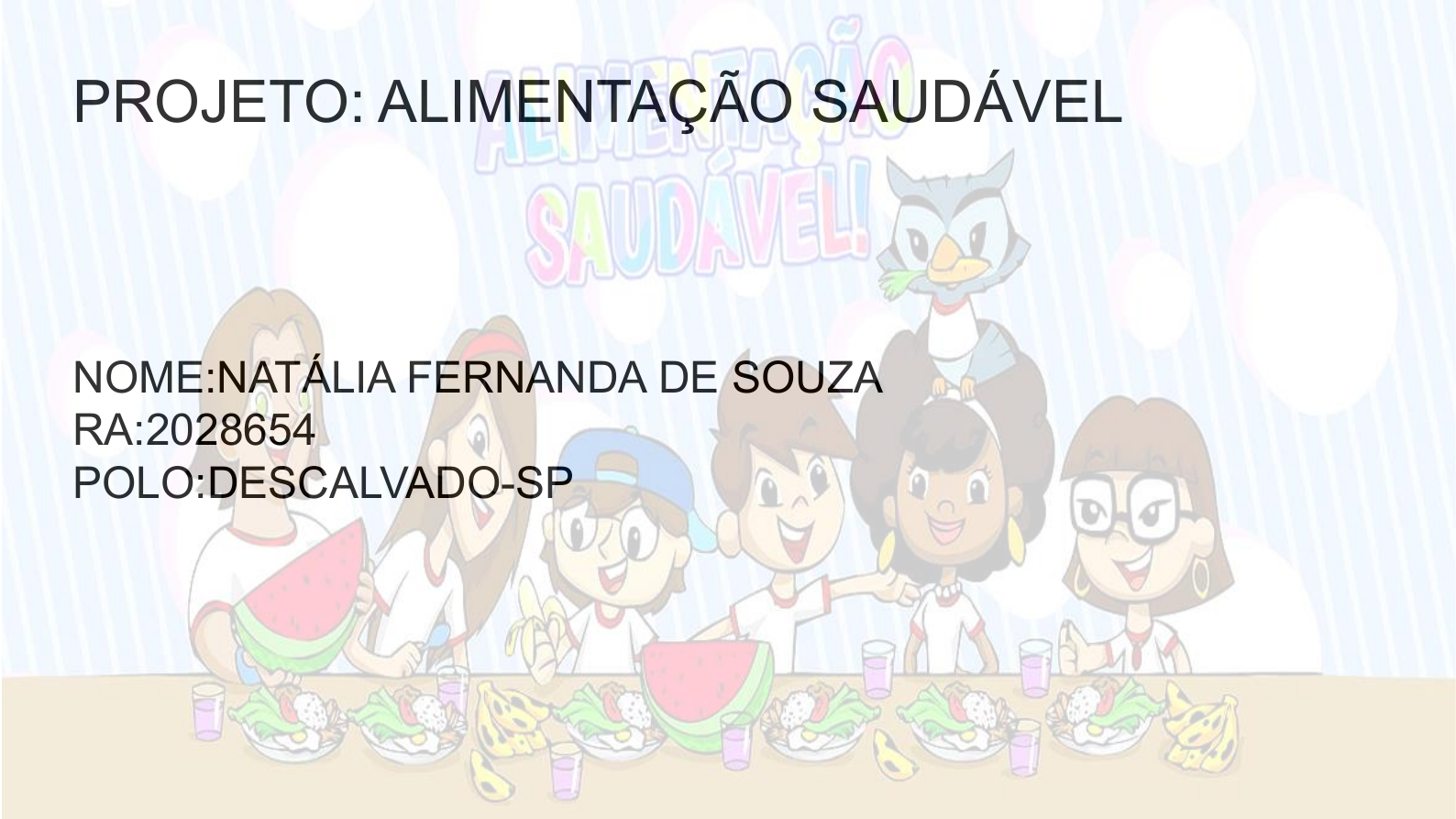 PROJETO: ALIMENTAÇÃO SAUDÁVEL NOME:NATÁLIA FERNANDA DE SOUZA RA:2028654 POLO:DESCALVADO-SP A IMPORTÂNCIA DA ALIMENTAÇÃO SAUDÁVEL NA INFÂNCIA SITUAÇÃO PROBLEMA: Um dos maiores desafios é introduzir uma alimentação saudável na infância,através dessa necessidade foi desenvolvido um projeto pedagógico na escola, com o propósito de incentivar crianças de 4 e 5 anos à criar hábitos alimentares mais saudáveis. JUSTIFICATIVA: A necessidade do projeto surgiu da observação da alimentação das crianças na escola,algumas crianças se alimentam muito mal e outras possui muita dificuldade para se alimentar. Cabe a nós como educadores trazer um incentivo para essas crianças. Público Alvo: -Crianças faixa etária de 4 e 5 Anos – Educação Infantil Objetivo Geral: -O objetivo do projeto é permitir que os alunos, juntamente com seus familiares, reflitam sobre seus hábitos alimentares e das consequências que esses hábitos têm na sua saúde. Objetivo Específicos: -Definir o que é uma alimentação saudável. -Diferenciar verduras, frutas e legumes, e assim estimular o consumo. -Promover em um dia específico, a realização de um piquenique saudável. -Atividades em sala de aula em relação ao tema do projeto. - Promover uma oficina culinária para pais e alunos. PERCURSO METODOLÓGICO: -Trabalhar com a definição da importância da alimentação saudável ,através de vídeos filmes,revistas,livros,apresentando assuntos relacionados ao tema do projeto. -Realização de um piquenique em horário de aula, na parte externa da escola. -Promover de atividades do projeto em sala de aula. -Realização da oficina culinária, que envolveu pais ou responsáveis e alunos. Neste dia os alunos ajudam no preparo de lanches saudáveis. FONTE IMAGEM:http://ecos-redenutri.bvs.br/tiki-read_article.php?articleId=700 http://ecos-redenutri.bvs.br/tiki-read_article.php?articleId=700 RECURSOS: Livros,jornais,vídeos,músicas,filmes, papéis,materiais escolares escolares,alimentos saudáveis ,materiais para piquenique pendrive,projetor,caixa de som,câmera fotográfica, e a participação dos pais ou responsáveis dos alunos para a contribuição e finalização do projeto. CRONOGRAMA: 1ºSEMANA: Definição da importância da alimentação saudável. 2ºSEMANA:Realização piquenique saudável. 3ºSEMANA:Realização de atividades do projeto em sala de aula. 4ºSEMANA:Oficina culinária para pais e alunos. AVALIAÇÃO: A avaliação será realizado com o decorrer do projeto. Onde serão realizados registros das atividades em sala de aula por meio de fotos,filmagens e registros diários. No último dia de projeto será realizado uma avaliação final analisando trabalho feitos com as crianças e com a família. PRODUTO FINAL: No final deste projeto será realizado uma exposição com as atividades realizadas em sala de aula e fotos tiradas com o decorrer do projeto, expostos na escola para que família e alunos da escola observem a finalização do projeto. Fonte imagem: https://br.depositphotos.com/stock-photos/avalia%C3%A7%C3%A3o.html https://br.depositphotos.com/stock-photos/avaliação.html REFERÊNCIAS: AUTORES: RAMOS MAUREM, STEIN M. LILIAN- Desenvolvimento do comportamento alimentar infantil. Jornal da Pediatra,v.76,p.229- 237-2000.Acesso em 10/03/2021 APARÍCIO, Graça. Ajudar a desenvolver hábitos alimentares saudáveis na infância. 2010. Site: https://educador.brasilescola.uol.com.br/ Estimulando uma alimentação saudável entre as crianças. Autora Paula Louredo - Graduada em Biologia. Acesso em : 10/03/2021. https://educador.brasilescola.uol.com.br/