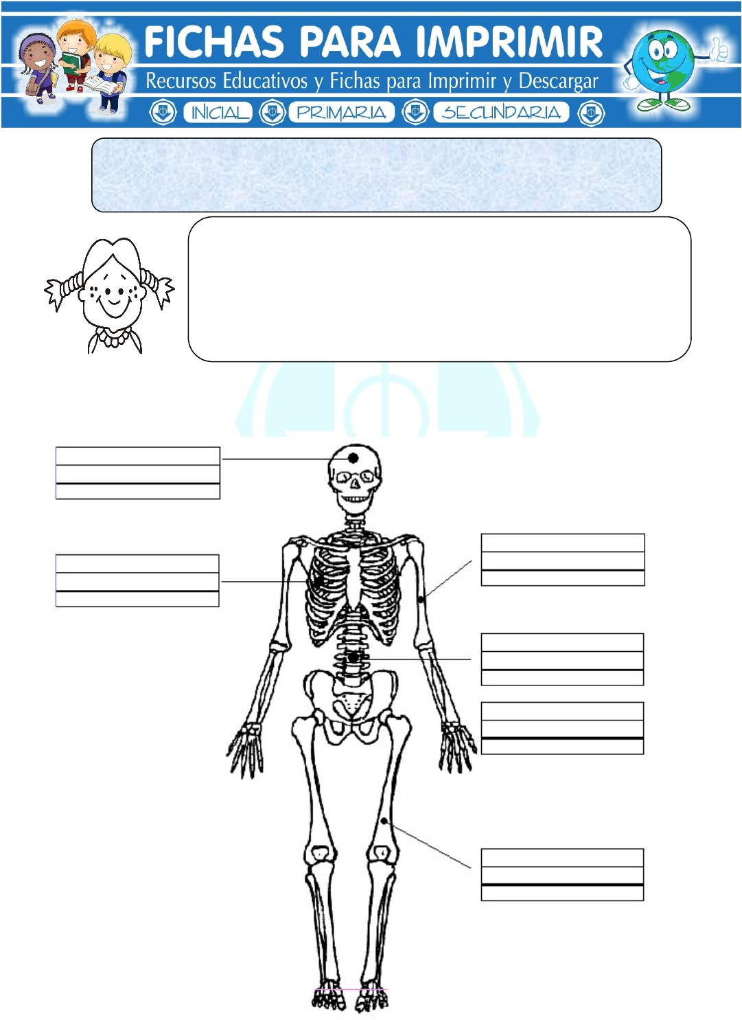 CIENCIA Y AMBIENTE – PRIMERO DE PRIMARIA Sistema Oseo Recuerda: * El cuerpo está formado por huesos. * Los huesos son duros y tienen diferentes tamaños. * A la reunión de todos los huesos se le llama ESQUELETO. * El esqueleto sirve para sostener todo el cuerpo. * Observa e identifica los principales huesos, escribiendo sus nombres en los espacios: www.fichasparaimprimir.com Página 2