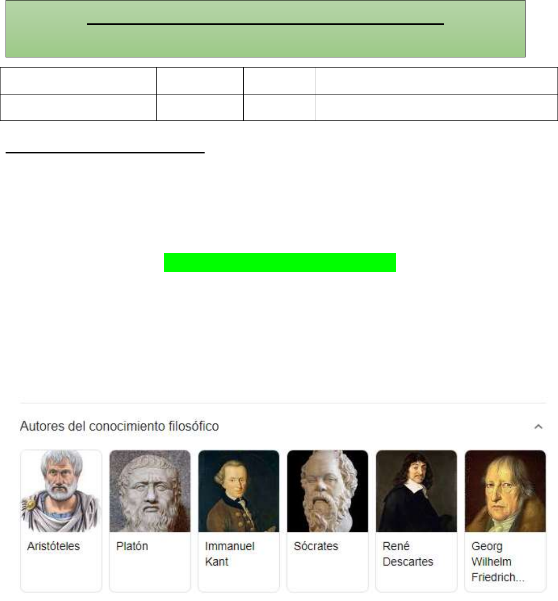 DOCENTES GRUPO FECHA DE ENTREGA E-MAIL Luis Alejandro Pardo Torres 1001 1002 1003 Marzo 5 de 2021 socialesjosemarti@gmail.com INDICADOR DE DESEMPEÑO • Comprende la importancia de la filosofía para su existencia. • Reconoce las características generales del conocimiento filosófico. • Evidencia en los métodos filosóficos formas de hallar la verdad. • Identifica las principales características de la filosofía grecorromana. CONOCIMIENTO FILOSÓFICO El conocimiento filosófico es el conjunto acumulado de saberes de tipo existencial, reflexivo y contemplativo que la humanidad ha ido formulando a lo largo de su historia, desde las civilizaciones antiguas hasta las contemporáneas. Intenta comprender la existencia del ser humano tal y como es. El conocimiento filosófico se puede considerar una rama de la filosofía; se trata del resultado o el producto de las reflexiones filosóficas. Se fundamenta en la lógica y la crítica que caracterizan el pensamiento filosófico. En otras palabras, se trata de la ciencia que estudia “el propio conocimiento” El conocimiento filosófico es aquel que nace de observar, leer, estudiar, investigar y analizar diferentes fenómenos del entorno, así como otros tipos de conocimientos. Se trata de una rama de la filosofía basada en estudiar las cuestiones más destacadas de la misma. Este tipo de conocimiento también se origina gracias a nuestra capacidad de reflexión, que nos permite reflexionar sobre la realidad y sobre reflexiones previas de otras personas. Es decir, no se basa estrictamente en la ciencia ni en la experiencia (aunque hay algunos tipos que sí, como veremos más adelante), sino en la propia capacidad de reflexión. Cuando su metodología es estrictamente reflexiva, hablamos de la epistemología; es decir, en realidad la epistemología se trata de un tipo de conocimiento filosófico, pero existen más. Así, a la epistemología se la considera “la ciencia que estudia el propio conocimiento”. Pero ¿cómo estudia la realidad el conocimiento filosófico? A través de tres vías principales: la observación, la reflexión y la capacidad crítica. GUÍA 1. FILOSOFIA GRADO DECIMO 10º. El objetivo del conocimiento filosófico es la creación de nuevas ideas y conceptos que, a su vez, permitan desarrollar nuevos conocimientos. Además, también permite entender cómo han aparecido ciertas ideas y reflexiones, es decir, de dónde han surgido y por qué. Esta comprensión que permite el conocimiento filosófico nos ayuda a determinar erradas, contradicciones, repeticiones, etc., del propio conocimiento (o discurso) filosófico. Es decir, como adelantábamos, se trata de estudiar el propio conocimiento, sus bases y estructura. Además, el conocimiento filosófico tiene otra función: llegar a conocer la realidad de la forma lo más verdadera posible, y además, entenderla. Otro de sus objetivos primordiales es analizar la manera que tenemos las personas de razonar, de pensar y de responder a las clásicas preguntas de la filosofía. Por otro lado, intenta definir qué método(s) debe usar la ciencia, qué contenidos debe abarcar y el lenguaje que debe utilizar. CARACTERÍSTICAS PRINCIPALES DEL CONOCIMIENTO FILOSÓFICO 1. Sistemático La primera característica que proponemos es su grado de sistematicidad; esto quiere decir que el conocimiento filosófico es altamente sistemático, es decir, está ordenado según una serie de parámetros. 2. Analítico Otra segunda característica es su grado de análisis. El conocimiento filosófico pretende analizar y entender la realidad, los propios conocimientos, de forma analítica y detallada. Así, se centra en algunas categorías, conceptos, temáticas y teorías particulares. Su objetivo es abarcar un tema concreto (o concepto, categoría, etc.) para analizarlo con detalle. 3. Racional Se trata de un conocimiento racional, que se estudia principalmente a través de la lógica y la razón. Esto quiere decir que se desprende de cualquier emoción. La razón es la herramienta básica de los filósofos y de los pensadores, que permite acceder al conocimiento y entenderlo. 4. Histórico Este tipo de conocimiento se vincula a un contexto histórico concreto, es decir, a un período de la historia, que puede o no ser actual. Este contexto incluye hechos históricos determinados, y a su vez, se trata de un contexto social y político. Es decir, no se trata de un conocimiento “atemporal”. 5. Global Por otro lado, este conocimiento puede englobar cualquier realidad posible, esto es, diferentes ciencias, ámbitos de estudio, disciplinas… Es decir, se puede aplicar en su totalidad (aunque a veces se centre en ciertas categorías o conceptos, como explicábamos en el punto 2). 6. Crítico Como ya adelantábamos una de las vías de estudio del conocimiento filosófico es el sentido crítico, ampliamente utilizado en filosofía. La crítica se utiliza para responder a preguntas, para plantearse dudas, para desgranar misterios, etc. Esta herramienta permite identificar posibles contradicciones dentro del discurso filosófico, así como pensar con mayor grado de objetividad. h tt p s: // m ic ar re ra u n iv er si ta ri a. co m /c -f ilo so fi a/ fi lo so fi a- a- n iv el -d e- es tu d io / EXISTEN 5 GRANDES TIPOS DE CONOCIMIENTO FILOSÓFICO, EN FUNCIÓN DE SUS OBJETIVOS, CARACTERÍSTICAS, METODOLOGÍAS, ETC. ESTOS SON LOS SIGUIENTES. 1. Conocimiento filosófico empírico Este tipo de conocimiento aporta información y datos a través de la experiencia y de lo que vamos viviendo. Se fundamenta en comprobar empíricamente los hechos, las hipótesis o las teorías. Ejemplos de él son: aprender un idioma o aprender a leer y escribir. 2. Conocimiento filosófico científico Este, a diferencia del empírico, se fundamenta en la observación, la experimentación y el análisis de los fenómenos. Es decir, se basa en el método científico, fundamentado en métodos rigurosos. Algunos ejemplos son: la te