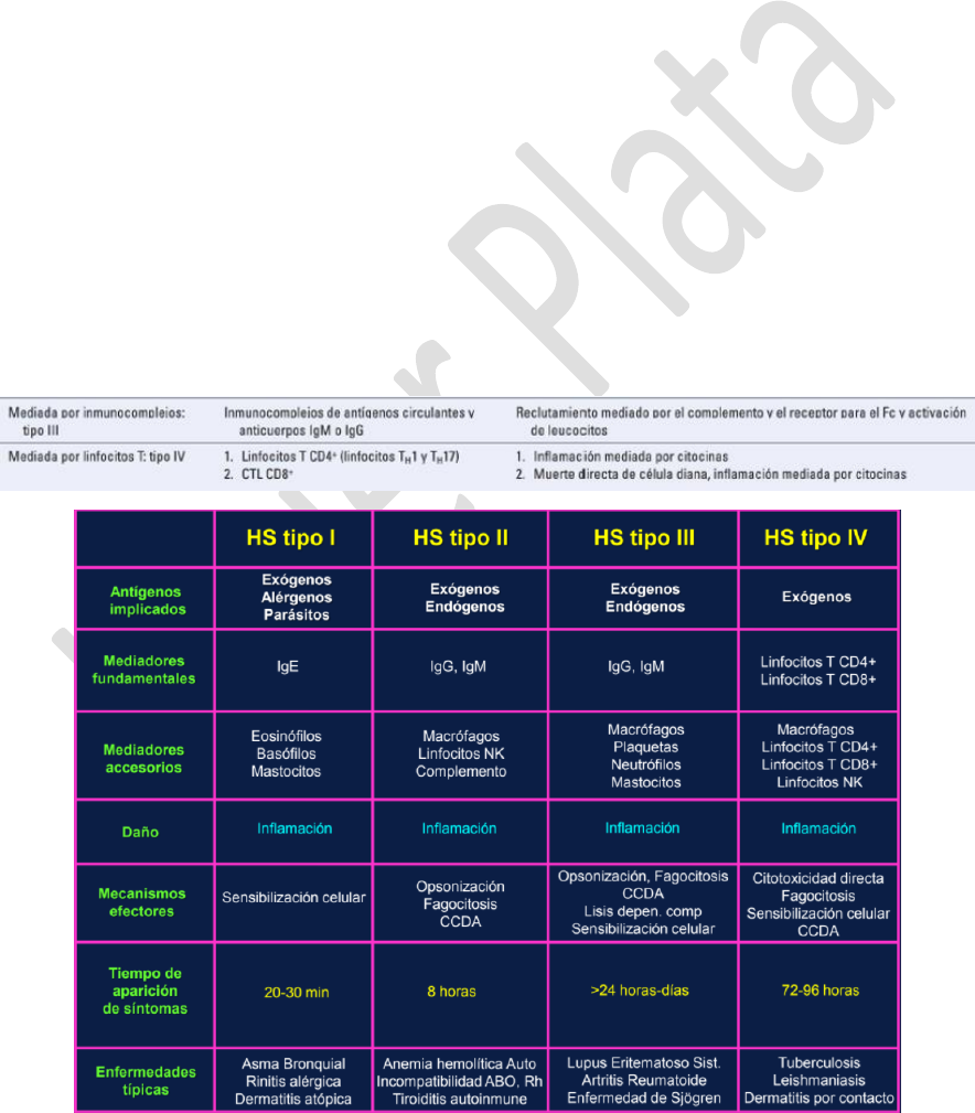 HIPERSENSIBILIDAD III y IV Recordando que la hipersensibilidad es una respuesta inmunitaria exagerada o excesiva inadecuada que se da contra un antígeno conocido previamente que generalmente no es patógeno. Esta clasificada según los mecanismos efectores y el tiempo de aparición de los síntomas. Donde ya conocemos que - HS I: como mediadores están IgE y Th2, llevando a la hipersensibilidad inmediata o alergia - HS II: como mediadores están las IgG e IgM, las cuales activan principalmente la complemento, opsonizan para fagocitosis y bloquean o estimulan receptores específicos - HS III: esta mediada por inmunocomplejos que se depositan y producen alteraciones en los tejidos - HS IV: es la hipersensibilidad de tipo retardado HIPERSENSIBILIDAD TIPO III Será la hipersensibilidad mediada por inmunocomplejos, los cuales son la unión no covalente entre un antígeno y anticuerpo. Aunque en las otras hipersensibilidades también se ven IC, el termino se usa para describir los complejos multimoleculares de anticuerpos y antígenos solubles. Esto diferencia la HS III de la II, además de que se da en horas En esta HS los antígenos solubles producen inmunocomplejos en forma de agregados que se depositan en tejidos y activan el complemento, lo que lleva a alteraciones en órganos como - Riñon - Vasos - Pericardio - Articulaciones - Piel Los factores que favorecen el deposito de inmunocomplejos son - Mientras mayor sea el CI y mayor sea su PM, mayor será la sedimentación - Si la carga eléctrica del CI es contraria a la del tejido, se favorece al deposito - El flujo lento y turbulento favorece al deposito, sobre todo en vasos pequeños - Tejidos previamente inflamados o afectados - Deposito previo de CI - Déficit de receptores Fc y de complemento, lo que disminuye la eliminación de los CI Adicional a todos estos factores, también esta la avidez y afinidad del anticuerpo, que de manera fisiológica aumenta la formación de inmunocomplejos por ser una característica de estas moléculas para unirse a los antígenos La fuerza de unión entre una sola zona combinatoria de un anticuerpo y un epítopo de un antígeno se llama afinidad del anticuerpo. La cual se representa con una constante de disociación (Kd) - Mientras mayor sea la constante, menor será la afinidad porque se necesita mayor concentración del antígeno para que el anticuerpo se una - Mientras menor sea la constante, mayor será la afinidad porque se necesita menos concentración del antígeno para que el anticuerpo se una Como existen anticuerpos que contienen mas de una zona combinatoria, estos se pueden unir a un antígeno multivalente en distintos epítopos al mismo tiempo. A pesar de que la afinidad del anticuerpo hacia cada epítopo será independiente, la fuerza global que hacen todos los sitios de unión con los epítopos disponibles también es tomada en cuenta y se llama avidez. La cual sera mucho mayor que la afinidad de cualquier sitio de union del antigeno aislado. Es decir, una molecula de IgM que tiene baja afinidad aun puede unirse fuertemente a un antigeno polivalente, gracias a que varias interacciones de baja afinidad producen una interaccion con avidez alta Inmunocomplejos Compuestos principalmente por la IgG, que se unen a las celulas inflamatorias a través de los receptores FcγR - FcγRI (CD64): es el de mayor afinidad - FcγRII (CD32) - FcγRIII (CD16) - FcγRIV Ya conocemos que es la unión entre complejos multimoleculares de antígenos y anticuerpos solubles. Las características de estos son - Involucra cualquier isotipo de Ig - Tamaño variable - Se forman en tejidos o en circulación - Varian en estructura y composición - Activan el complemento Generalmente los inmunocomplejos son un mecanismo de defensa fisiológico que favorece al huésped. Donde cumplen dos funciones principales al fijarse al antigeno - Activar el complemento para la lisis del mismo (IgG e IgM) - Opsonizar junto a los fragmentos de complemento (C3b) para que los eritrocitos capten mediante el receptor de complemento tipo 1 (CR1 o CD35) y FcγR. Asi, los globulos rojos transportan los inmunocomplejos a los sistemas reticuloendoteliales para su eliminación Por lo que los CI - Opsonizan, tanto con complemento como sin el - Median la eliminación de circulación gracias al complemento y los receptores de los eritrocitos - Se unen a CPA mediante los receptores Fc para su procesamiento y que estas lo presenten mediante CMH a los linfocitos T - Los CI con complemento se unen al receptor de complemento 2 (CR2) de los linfocitos B para estimular la producción de anticuerpos Ademas, los niveles de CI aumentan de manera progresiva en una respuesta inmunitaria - Fase aguda: hay poco anticuerpo y mucho antígeno, por lo que se forman CI pequeños que no fijan complemento y no son eliminados de circulación - Fase intermedia: hay igual cantidad de anticuerpo y antígeno, lo que lleva a que se fije complemento y los CI de gran tamaño son eliminados de circulación - Fase avanzada: hay mucho anticuerpo y poco antígeno, por lo que se siguen formando CI pero de tamaño intermedio o pequeños que fijan complemento y son eliminados de circulacion Los eventos patológicos se presentan en las fases agudas o intermedias, donde hay niveles altos de CI o antigeno que no se eliminan lo suficiente y se depositan en los tejidos. Generalmente los de gran tamaño o los pequeños que no son detectados La patología se da cuando hay alteraciones en el sistema inmune y se dan depósitos de CI grandes en tejidos, los cuales activan a celulas inflamatorias y se secretan mediadores proinflamatorios que reclutan neutrófilos y celulas que generan daño tisular Además, hay que recordar el efecto de las anafilotoxinas. Las cuales actúan en la inflamación y quimiotaxis - C3a y C5a: activan a los mastocitos para que hagan degranulacion, se liberen sus mediadores y se produzca vasodilatación y aumento de permabilidad o Histamina o Leucotrienos o Prostagland