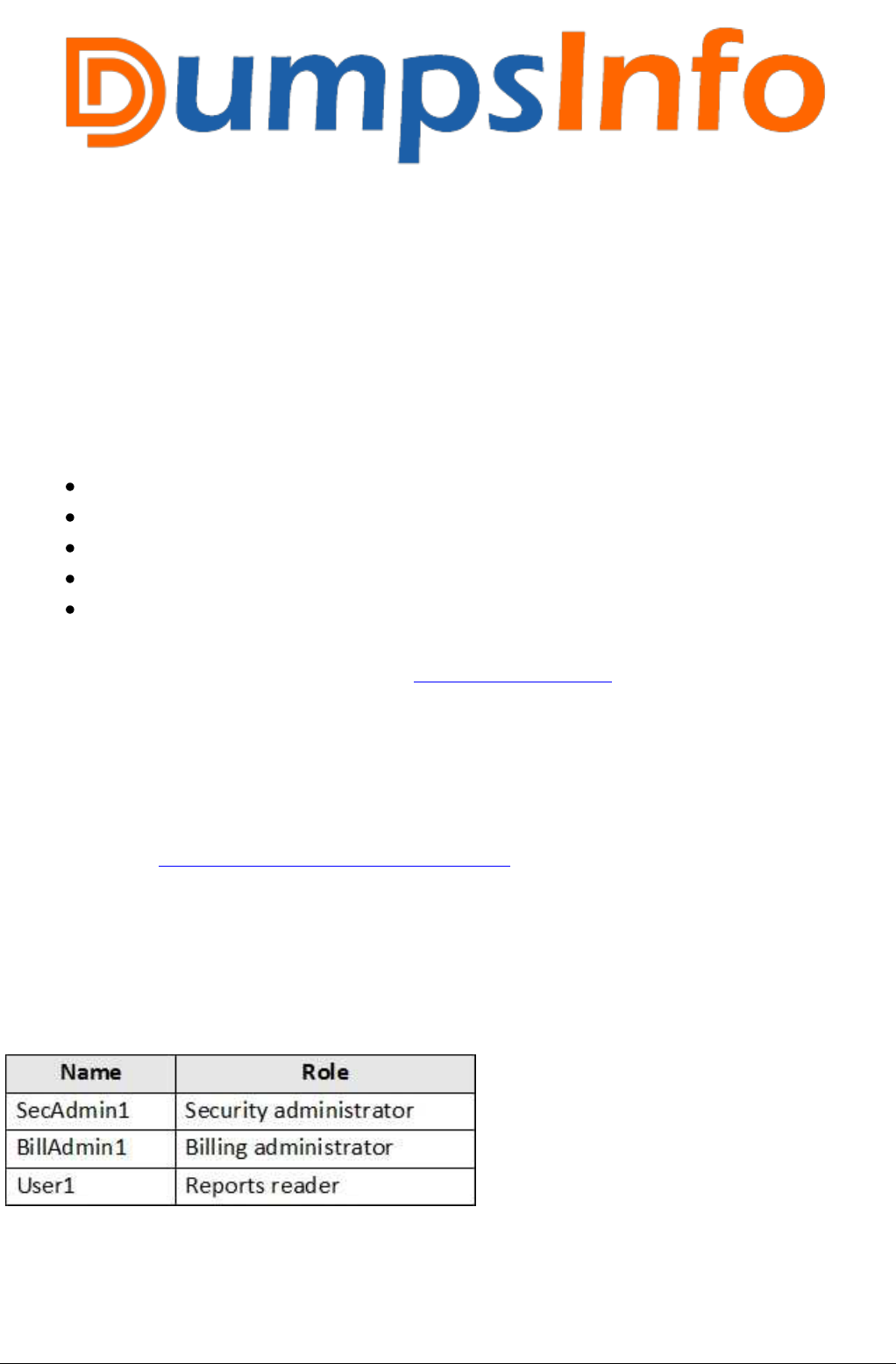 AZ-104 Microsoft Azure Administrator exam dumps questions are the best material for you to test all the related Microsoft exam topics. By using the AZ-104 exam dumps questions and practicing your skills, you can increase your confidence and chances of passing the AZ-104 exam. Features of Dumpsinfo’s products Instant Download Free Update in 3 Months Money back guarantee PDF and Software 24/7 Customer Support Besides, Dumpsinfo also provides unlimited access. You can get all Dumpsinfo files at lowest price. Microsoft Azure Administrator AZ-104 exam free dumps questions are available below for you to study. Full version: AZ-104 Exam Dumps Questions 1.HOTSPOT You have an Azure subscription that contains an Azure Directory (Azure AD) tenant named contoso.com. The tenant is synced to the on-premises Active Directory domain. The domain contains the users shown in the following table. You enable self-service password reset (SSPR) for all users and configure SSPR to have the 1 / 42 https://www.dumpsinfo.com/unlimited-access/ https://www.dumpsinfo.com/exam/az-104 following authentication methods: - Number of methods required to reset: 2 - Methods available to users: Mobile phone, Security questions - Number of questions required to register: 3 - Number of questions required to reset: 3 You select the following security questions: What is your favorite food? In what city was your first job? What was the name of your first pet? For each of the following statements, select Yes if the statement is true. Otherwise, select No. NOTE: Each correct selection is worth one point. Answer: Explanation: No, No, Yes https://learn.microsoft.com/en-us/azure/active-directory/authentication/concept-authentication-security- questions 2.DRAG DROP You have an Azure Active Directory (Azure AD) tenant that has the initial domain name. You have a domain name of contoso.com registered at a third-party registrar. You need to ensure that you can create Azure AD users that have names containing a suffix of @contoso.com. Which three actions should you perform in sequence? To answer, move the appropriate cmdlets from the list of cmdlets to the answer area and arrange them in the correct order. 2 / 42 https://www.dumpsinfo.com/ Answer: Explanation: The process is simple: Add the custom domain name to your directory Add a DNS entry for the domain name at the domain name registrar Verify the custom domain name in Azure AD Reference: https://docs.microsoft.com/en-us/azure/dns/dns-web-sites-custom-domain 3.You have an Azure subscription that contains a storage account named storage1. You plan to use conditions when assigning role-based access control (RABC) roles to storage1. Which storage1 services support conditions when assigning roles? A. containers only B. file shares only C. tables only D. queues only E. containers and queues only 3 / 42 https://www.dumpsinfo.com/ F. files shares and tables only Answer: A Explanation: "Currently, conditions can be added to built-in or custom role assignments that have blob storage or queue storage data actions. " https://learn.microsoft.com/en-us/azure/role-based-access- control/conditions-overview#where-can-conditions-be-added 4.You have an Azure subscription that contains a storage account named storageacct1234 and two users named User1 and User2. You assign User1 the roles shown in the following exhibit. Which two actions can User1 perform? Each correct answer presents a complete solution. NOTE: Each correct selection is worth one point. A. View file shares in storageacct1234. B. Upload blob data to storageacct1234. C. Assign roles to User2 for storageacctl234. D. View blob data in storageacctl234. E. Modify the firewall of storageacct1234. Answer: A, C 5.You have an Azure virtual network named VNet1 that contains a subnet named Subnet1. Subnet1 contains three Azure virtual machines. Each virtual machine has a public IP address. The virtual machines host several applications that are accessible over port 443 to user on the Internet. Your on-premises network has a site-to-site VPN connection to VNet1. You discover that the virtual machines can be accessed by using the Remote Desktop Protocol (RDP) from the Internet and from the on-premises network. You need to prevent RDP access to the virtual machines from the Internet, unless the RDP connection is established from the on-premises network. The solution must ensure that all the applications can still be accesses by the Internet users. 4 / 42 https://www.dumpsinfo.com/ What should you do? A. Modify the address space of the local network gateway. B. Remove the public IP addresses from the virtual machines. C. Modify the address space of Subnet1. D. Create a deny rule in a network security group (NSG) that is linked to Subnet1. Answer: D Explanation: You can filter network traffic to and from Azure resources in an Azure virtual network with a network security group. A network security group contains security rules that allow or deny inbound network traffic to, or outbound network traffic from, several types of Azure resources. You can use a site-to-site VPN to connect your on-premises network to an Azure virtual network. Users on your on-premises network connect by using the RDP or SSH protocol over the site-to-site VPN connection. You don't have to allow direct RDP or SSH access over the internet. And this can be achieved by configuring a deny rule in a network security group (NSG) that is linked to Subnet1 for RDP / SSH protocol coming from internet. Modify the address space of Subnet1: Incorrect choice Modifying the address space of Subnet1 will have no impact on RDP traffic flow to the virtual network. Modify the address space of the local network gateway: Incorrect choice Modifying the address space of the local network gateway will have no impact on RDP traffic flow to the virtual network. Remove the public IP addresses from the virtual machines: Incorrect choice If you remove the public IP addresses from the virtual machines, none of t
