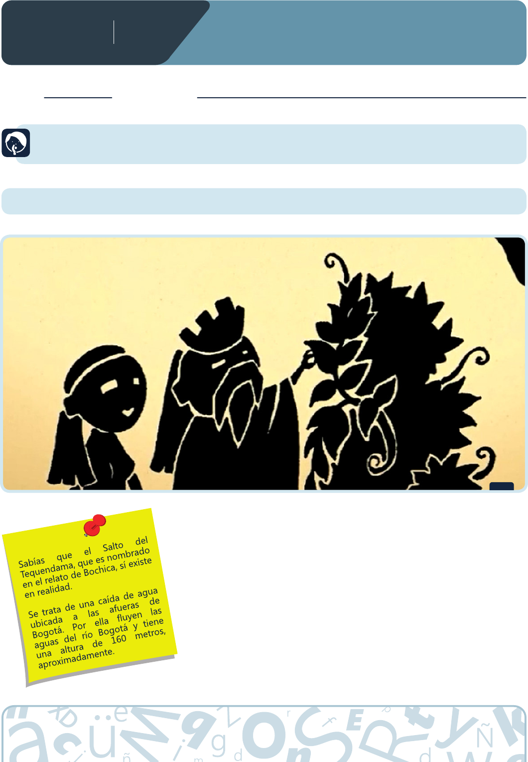 Clase: Nombre: 1 Te has preguntado alguna vez cómo las personas que vivieron en la antigüedad explicaban el mundo en el que vivían y los objetos que los rodeaban. Ellos, al igual que nosotros actualmente, necesitaban entender su mundo y para ello elaboraron explicaciones en forma de relatos. Presta atención a la animación sobre Bochica que vas a ver en la introducción, luego responde las preguntas. También puedes leer la historia a continuación: Figura 1 INTRODUCCIÓN COMPRENSIÓN DE LOS MITOS Y SUS CLASES. Lenguaje Unidad 4Grado 5 Bochica 2 Grado 4 Lenguaje 1. ¿Sabes quiénes fueron los Muiscas o dónde vivieron? Pregúntale a tu profesor o investiga en libros. Bochica Hace mucho tiempo en el reino de los muiscas, hijos de la diosa Bachué, la sociedad comenzó a perderse y a alejarse de sus valores debido a una hermosa y malvada mujer: la diosa Huitaca. El hombre se arrepentía por haber desechado y perdido sus valores mientras la oscuridad lo consumía. Pero un día, en la hermosa tierra del Sogamoso, un pequeño niño está intentando sembrar una extraña planta, pero tristemente no lo puede hacer. Luego se encuentra con alguien que no espera ver en este mundo. Maravillado por los extraordinarios poderes de este ser, el niño corre donde su madre para darse cuenta de que es el dios Bochica. Dios héroe de los muiscas, quien con su llegada les enseña a cultivar, les enseña el arte de la medicina, les enseña a convivir en sociedad y les inculca la unión familiar. La malvada Huitaca estaba observando todo y furiosa y envidiosa por no poder hacerles daño a los muiscas piensa de qué manera puede vengarse de estos. Seduce al poderoso Chibchacum, dios de los cultivos. Furioso por los engaños de Huitaca, arremete contra los muiscas inundando su territorio; y Bochica, al percibir aquel violento atropello, toma su bastón y lo arroja con tal poder contra unas montañas, destruyéndolas en el acto, formando el salto del Tequendama y salvando a los muiscas. Los otros dioses sorprendidos saben que recibirán su castigo. Bochica castiga en primer lugar al dios Chibchacum condenándolo a cargar la tierra sobre sus hombros por toda la eternidad y a la diosa Huitaca la condena a las tinieblas, convertida en lechuza. El cacique agradecido se despide de Bochica junto con su familia, recordando su enseñanza al tiempo que su héroe se desvanecía. 3 Grado 4 Lenguaje 2. ¿Qué se explica a través del relato de Bochica? 3. ¿Qué aspectos mágicos o sobrenaturales fueron mostrados a través del relato? Descríbelos. 4. ¿Crees que lo se cuenta en el relato es cierto? Justifica tu respuesta. 5. ¿Qué otra manera se te ocurre de explicar el fenómeno del Salto del Tequendama? Justifica tu respuesta. 4 ACTIVIDAD 1 Grado 4 Lenguaje 1. Reconocer explicaciones alternativas de la realidad. 2. Reconocer las características de un texto mítico. Durante mucho tiempo en Colombia habitaron pueblos ancestrales y cada uno de ellos tuvo un desarrollo cultural importante que se manifestó principalmente a través de sus creencias. Actualmente podemos saber de ellas por medio de los mitos, leyendas y demás relatos que crearon, los cuales han sido transmitidos a través de las generaciones para que hoy los podamos conocer y aprender acerca de qué creían o cómo entendían el mundo dichos pueblos. Un mito es un relato tradicional basado en antiguas creencias de diferentes comunidades y que presenta explicaciones sobrenaturales de hechos o fenómenos naturales. El relato mítico está relacionado con creencias religiosas, por lo que es asociado con un carácter ritual; es decir, presenta elementos invariables, que se repiten, y se distingue por su perdurabilidad a través del tiempo. Lee con atención los siguiente mitos de algunos pueblos ancestrales de Colombia, que también podrás ver a través de videos en el recurso de la actividad uno. Objetivos Nuestros mitos Grado 4 La Vieja Candela. fVIito. Tradición oral Nasa Lenguaje En los tiempos antiguos los Nasa no sabíamos encender el fuego, así que teníamos que pedírselo a la única anciana que lo poseía. La llamaban "Vieja Candela" ya que sacaba el fuego debajo de su brazo. Era una señora muy celosa y sólo nos regalaba unos tizones pequeños. Un día, una niña fue enviada por su madre a pedirle un tizón a la Vieja Candela. Al llegar a la casa de la anciana le solicitó el tizón, ella le regaló uno pequeño y le advirtió que lo cuidara mucho ya que no le daría más. La niña salió muy contenta hacia su casa, pero por el camino se le perdió el tizón. Muy triste por lo que había pasado, decidió regresar donde la anciana para pedirle uno nuevo. En ese momento, la anciana salió a cortarle la lana a sus ovejas. Al no encontrar a nadie, la niña entró a la casa y tomó un tizón, pero la anciana se dio cuenta y se puso muy furiosa . La niña salió corriendo con el tizón en su mano, mientras la anciana la perseguía exigiéndole que se lo devolviera. Cuando ya estaba a punto de ser alcanzada, la niña se asustó y soltó el tizón en un pastizal seco, lo cual produjo un gran incendio. Dicen que por esa razón el pueblo donde ocurrió esta historia fue llamado Calderas. En ese momento, todas las personas aprovecharon para llevar madera encendida y tizones a sus casas. De esta manera, la niña logró huir de la furiosa anciana, y el pueblo Nasa tuvo fuego y nunca más volvió a pasar frío. Actividad: Responde las siguientes preguntas de Falso o Verdadero a partir del mito que acabas de leer: l. Los Nasa buscaban a la Vieja Candela porque no sabían encender fuego: ___ _ 6 Grado 4 Lenguaje 2. La niña fue a buscar a la Vieja Candela a su casa para robarle todo el fuego: ___________ 3. La niña ocasionó un incendio accidentalmente mientras huía asustada: ___________ 4. Gracias al incendio, el pueblo Nasa tuvo fuego en sus casas y nunca más sintió frío: ___________ Origen de los Kuiba. Mito. Tradición oral Kuiba. Hace mucho tiempo, en