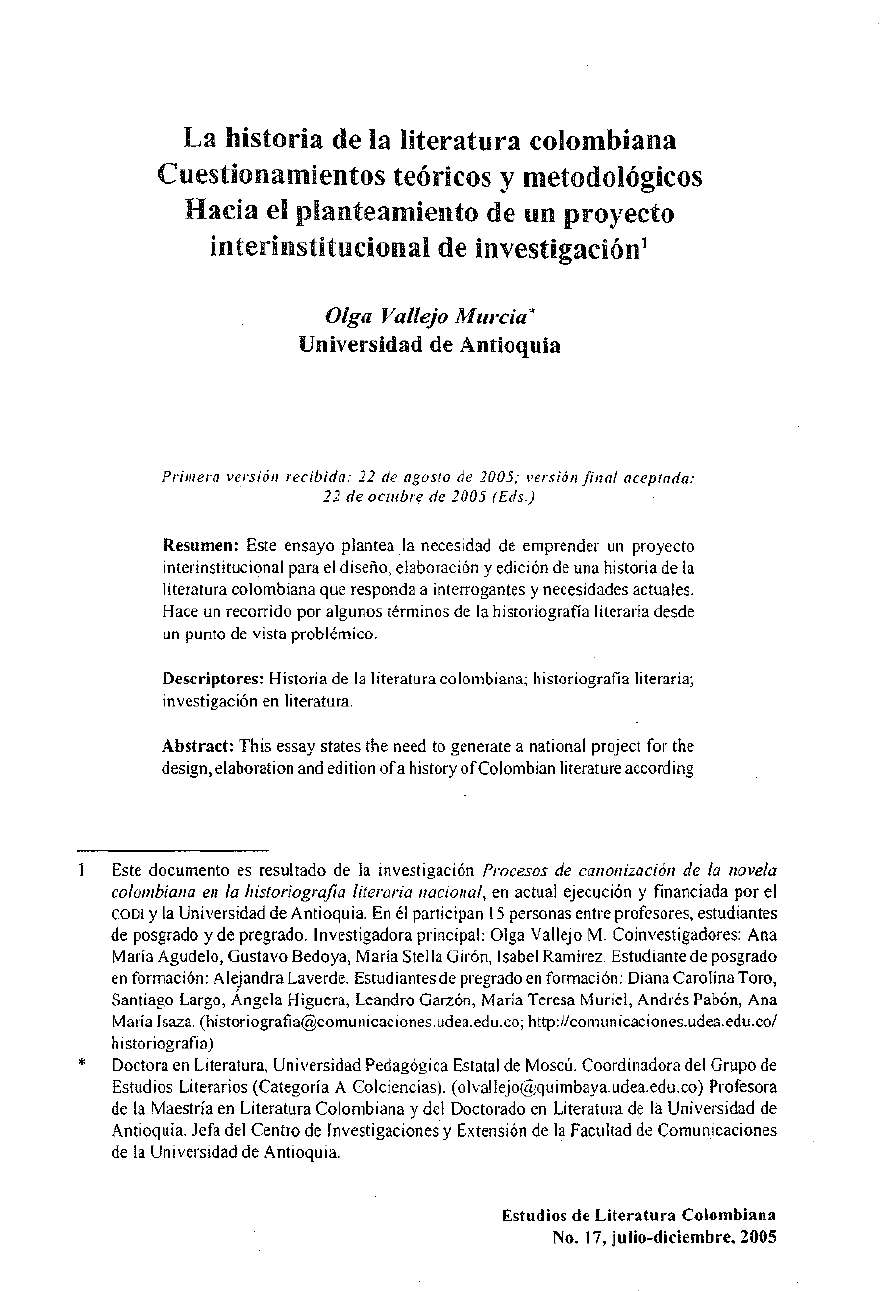 La historia de la literatura colombiana Cuestionamientos teóricos y metodológicos Hacia el planteamiento de un proyecto interinstitucional de investigación1 Olga Vallejo Murcia* * Universidad de Antioquia Primera versión recibida: 22 de agosto de 2005; versión final aceptada: 22 de octubre de 2005 (Eds.) Resumen: Este ensayo plantea la necesidad de emprender un proyecto interinstitucional para el diseño, elaboración y edición de una historia de la literatura colombiana que responda a interrogantes y necesidades actuales. Hace un recorrido por algunos términos de la historiografía literaria desde un punto de vista problémico. Descriptores: Historia de la literatura colombiana; historiografía literaria; investigación en literatura. Abstract: This essay States the need to generate a national project for the design, elaboration and edition of a history of Colombian literature according 1 Este documento es resultado de la investigación Procesos de canonización de la novela colom biana en la historiografía literaria nacional, en actual ejecución y financiada por el CODi y la Universidad de Antioquia. En él participan 15 personas entre profesores, estudiantes de posgrado y de pregrado. Investigadora principal: Olga Vallejo M. Coinvestigadores: Ana María Agudelo, Gustavo Bedoya, María Síella Girón, Isabel Ramírez. Estudiante de posgrado en formación: Alejandra Laverde. Estudiantes de pregrado en formación: Diana Carolina Toro, Santiago Largo, Ángela Higuera, Leandro Garzón, María Teresa Muriel, Andrés Pabón, Ana María Isaza. (historiografía@comunicaciones.udea.edu.co; http://comunicaciones.udea.edu.co/ historiografía) * Doctora en Literatura, Universidad Pedagógica Estatal de Moscú. Coordinadora del Grupo de Estudios Literarios (Categoría A Colciencias). (olvallejo@quimbaya.udea.edu.co) Profesora de la Maestría en Literatura Colombiana y del Doctorado en Literatura de la Universidad de Antioquia. Jefa del Centro de Investigaciones y Extensión de la Facultad de Comunicaciones de la Universidad de Antioquia. Estudios de L iteratura Colombiana No. 17, julio-diciembre, 2005 mailto:a@comunicaciones.udea.edu.co http://comunicaciones.udea.edu.co/ mailto:olvallejo@quimbaya.udea.edu.co La historia de la literatura colombiana Olga Vallejo Murcia to the present questions and needs. It considers some 1 iterary historiogra- phical terminology from a confrontational perspective. Key words: History ofColombian literature; ¡iterary historiography; ¡iterary research. A la memoria del doctor Ignacio Chaves, quien me pusiera en el camino de la historia literaria de Colombia. Presentación El objetivo de este ensayo no es resolver problemas conceptuales o meto dológicos acerca de la historia de la literatura; tampoco tiene una filiación teórica que pretenda dar por resueltas las preguntas más importantes que el ejercicio histórico de la literatura pueda suscitar. No pretendemos defen der que la historia social es una mejor opción que la historia crítica; ni vamos a hablar del método de las generaciones, bastante criticado por cier to, menos aún tendríamos tiempo para compartir las desazones historio- gráficas de nuestra literatura; en efecto, el tema del canon conservador heredado de la tradición historiográfica decimonónica es un tema álgido pero hoy no hablaremos de él. Plantearse la ruta de este escrito no fue tarea fácil. ¿Tendría acaso algún sentido hablar hoy del discurso histórico tradi cional y detenemos en las largas meditaciones de Paul Ricoeur o de Hayden White? Seguramente no. En conclusión, el objetivo de estas palabras no es resolver preguntas sino plantearlas. Nos sentiremos satisfechos si al tenninar este documento los lectores quedan contagiados de la preocupación que desde hace ya va rios años nos ocupa. Preocupación que de no convertirla en preguntas con cretas se tomará en un galimatías de términos. Seguramente sobra decir de qué preocupación hablamos. Quién de no sotros en su ejercicio docente, investigativo, e, incluso, de padre de familia no ha sentido en algún momento que los manuales y las consabidas histo rias de la literatura colombiana no son más que libros en desuso. Pero, quién de nosotros al constatar este vacío en nuestros estudios literarios no suspira profundamente de solo pensar qué significa pensar hoy una histo ria de la literatura colombiana. Hoy cuando el maremagnum teórico y con ceptual se hace tan inasible, que nos sentimos culpables de hablar de Genette 2 0 2 Estudios de Literatura Colombiana No. 17, julio-diciembre de 2005 y lio de Bhabha, o al contorno si ustedes lo prefieren. Seguramente la ima gen que en cada uno de nosotros se produce al pensar en una ‘historia de la literatura colombiana’ va desde el libro multitómico hasta el cd hipervirtual. Cuantas preguntas nos hagamos y cómo tratemos de responderlas no cam bia la esencia del asunto. Este país, entre tantas otras cosas, necesita una Historia Nueva de la Literatura Colombiana. Nueva quiere decir solamen te la de nosotros. Crítica, social, plana, lineal, antigeneracional, descripti va, canónica, anticanónica, de tendencia goldmaniana, bajtiniana o cual quier otra no lo sabemos aún. La historia de la literatura colombiana hoy Empecemos por afirmar que de un tiempo para acá la historia de la literatura colombiana se ha convertido en una idea inquietante en nuestra comunidad académica. Una de las pocas ideas que han logrado convocar las más diversas formas de describir, comprender e interpretar el hecho literario. Justamente, en esta capacidad de convocatoria radica una de las condiciones del ejercicio histórico literario: una historia literaria debe ser hoy una construcción colectiva. Esta, además de ser una convicción, es uno de los resultados elementales de una comparación historiográfica. des pués del M anual ele L iteratura Colombiana (autores varios, 1988) y de Literatura y Cultura (autores varios, 2000) queda claro 
