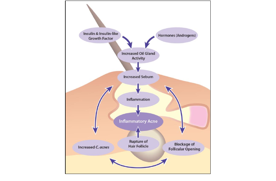 VA Office of Patient Centered Care and Cultural Transformation Page 1 of 8 ACNE BACKGROUND Acne affects between 50-80% of teenagers and young adults. It is a disorder of the pilosebaceous unit (hair follicle and associated oil gland). Factors that contribute to acne formation include increased sebum (a substance made up of oil and wax that functions to protect the skin), increased build-up of material in the hair follicle, increased levels of Cutibacterium acnes (a bacteria that is commonly present on the skin in low numbers), and inflammation. Clinically, there are three categories of acne including comedonal (whiteheads and blackheads), inflammatory (red bumps), and nodular (large, painful cysts). Hormones signal oil glands in the skin to increase their production of sebum. A plug of sebum and keratin (a protein that helps maintain the structure of the skin, hair, and nails) forms and blocks the opening of the hair follicle creating whiteheads and blackheads. The increased sebum supports increased concentrations of P. acnes. This leads to further blockage of the hair follicle opening and to increased inflammation. Ultimately the hair follicle can rupture, resulting in large, painful nodules. Insulin also contributes to the formation of acne. Insulin and insulin-like growth factor act by directly increasing the activity of the oil gland, as well as by indirectly increasing the levels of other hormones that stimulate the oil gland including insulin-like growth factor and androgens. Figure 1. Pathophysiology of Acne Acne VA Office of Patient Centered Care and Cultural Transformation Page 2 of 8 There are many factors to take into account when deciding on a treatment plan: the type of acne, the severity of acne, whether there is scarring, what has been tried in the past, and the psychological impact should all be assessed. In girls and women, information about menstrual history (specifically regularity, duration, and quantity of bleeding) and signs of hormonal abnormalities (excessive facial hair, insulin resistance) can also be helpful. TREATMENT SKIN CARE The first step to managing acne is to adhere to gentle skin care practices. The skin should be rinsed gently with warm water once or twice a day. Washcloths or other abrasive materials should be avoided, and only gentle, nonsoap-based cleansers should be used. Detergent-based soaps, toners, and astringents further dry and irritate the skin. While they do remove oil and sebum from the surface of the skin, they do not alter sebum production within the oil gland. Ultimately, overly dry skin signals the pilosebaceous units to make more oil in order to adequately protect the skin. Moisturizers can help acne, but it is important to make sure any moisturizers or cosmetics are not oil based and are labeled noncomedogenic. The impulse to pick and squeeze acne lesions is common and can be difficult to overcome. These practices can lead to immediate gratification, but ultimately slow down the disappearance of specific acne lesions. These practices also result in tissue injury, which creates more inflammation and potential scarring that is very difficult, if not impossible, to reverse. FOOD & DRINK Healthy dietary choices are important for overall health. Anti-inflammatory or Mediterranean-style dietary approaches have been found to enhance many aspects of health—especially in the setting of inflammatory diseases. Acne is an inflammatory condition and will likely improve when dietary choices better align with foods that inhibit rather than promote inflammation.[1] In particular, low glycemic index/low glycemic load diets have been shown to improve acne in clinical trials.[2] More information about these dietary approaches can be found in the “Food and Drink,” Whole Health overview. Avoiding or limiting all forms of dairy may be beneficial. Dairy intake has been linked to increased risk and severity of acne. This is likely in part due to stimulating increased levels of insulin-like growth factor.[3] Limiting the intake of foods high in added hormones (such as meat and dairy) may also be helpful since these foods may alter hormonal balances and may lead to overstimulation of the oil gland. There is also evidence that increasing plants in the diet can help treat acne. We know that plants are full of prebiotics—compounds that are either indigestible or partially digestible by humans, which can be metabolized by the microbiome in our guts. Basically, plants help feed the gut microbiome and help keep it healthy. Maintaining a healthy balance of https://www.va.gov/WHOLEHEALTHLIBRARY/self-care/food-and-drink.asp Acne VA Office of Patient Centered Care and Cultural Transformation Page 3 of 8 microbes in the gut is important for many areas of health including acne. Other mechanism that have been proposed for benefits of diets rich in plants for patients with acne include modulation of hormones, normalization of blood sugar and insulin sensitivity and anti- inflammatory benefits.[4] SUPPLEMENTS Note: Please refer to the Passport to Whole Health, Chapter 15 on Dietary Supplements for more information about how to determine whether or not a specific supplement is appropriate for a given individual. Supplements are not regulated with the same degree of oversight as medications, and it is important that clinicians keep this in mind. Products vary greatly in terms of accuracy of labeling, presence of adulterants, and the legitimacy of claims made by the manufacturer. OMEGA-3 FATTY ACIDS Omega-3 fatty acids have been shown to decrease the production of inflammatory compounds and of the hormones important in acne formation.[5] Additionally, groups of people who consume high amounts of omega-3 fatty acids have less acne than groups of people who have lower levels of this nutrient. Ideally, omega-3 fatty acids should come from foods such as fatty fish (salmon, mackerel, and sardines), flaxseeds, and walnuts. When that is not possible, supplements can be helpfu