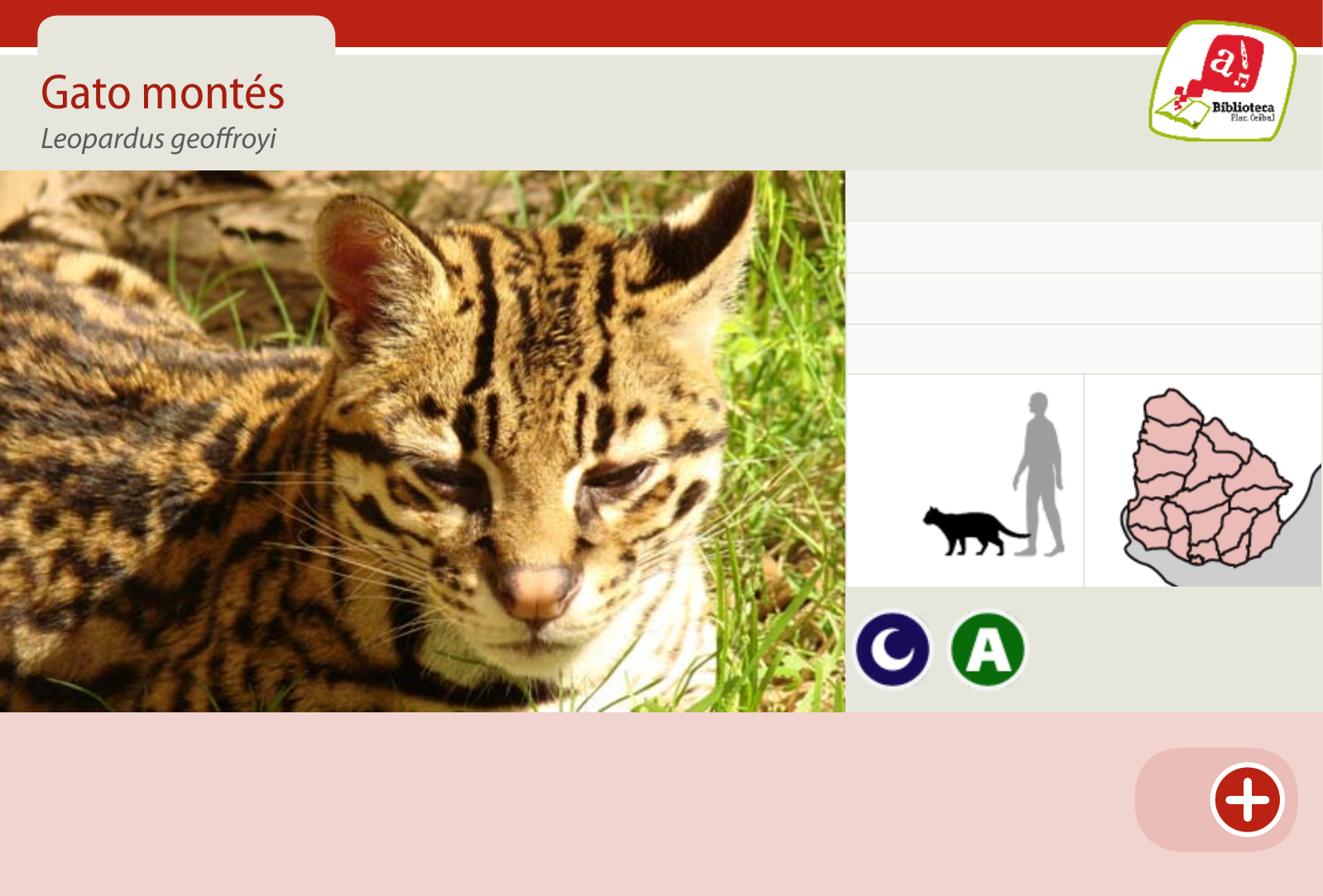 013 . Mamíferos Gato montés Leopardus geoffroyi REINO ANIMAL El gato montés es el félido silvestre más común en Uruguay. Generalmente su pelaje presenta pequeñas manchas negras sobre un fondo amarillento o grisáceo, aunque algunos ejemplares son negros. Llega a medir 1 m de largo y pesa entre 3 y 6 kg. Se alimenta de pequeños vertebrados. Frecuenta montes pero también se encuentra en praderas. VER Orden: Carnivora Familia: Felidae Género: Leopardus CLASIFICACIÓN 013 . Mamíferos Gato montés Leopardus geoffroyi REINO ANIMAL Puede reproducirse a partir de los 2 años de edad y llega a vivir 14 años. Luego de un período de gestación de 75 días, la hembra da a luz entre 1 y 3 crías, una vez al año. Se desplaza y caza de manera ágil, tanto en árboles como en el suelo, y es buen nadador. Se refugia en árboles huecos, troncos caídos o entre vegetación enmarañada. Es principalmente nocturno y solitario, excepto en época de celo y cría. Su dieta varía según la época del año y la región geo- gráfica. Se alimenta principalmente de roedores. A veces se introduce en gallineros, donde provoca grandes pérdidas. Los principales problemas de su conservación se deben a la pérdida de hábitat, a la caza y a los atropellamientos en las carreteras. En el pasado fue muy buscado por los caza- dores, quienes lo mataban para obtener su piel. En una misma camada pue- den nacer individuos pintados y melánicos. El melanismo es el exceso del pigmento negro, llamado melanina. Su pelaje manchado lo ayuda a confundirse con su entorno. Las uñas son retráctiles: cuando marcha las mantie- ne replegadas y cuando ata- ca a una presa las despliega. Se refugia en montes y transita por praderas, pastizales y pajonales. También habita en Bolivia, Paraguay, Argentina, Chile y Brasil. ¿SABÍAS QUÉ?CARACTERÍSTICAS PRINCIPALES GLOSARIO: CAMADA 013 . Mamíferos Gato montés Leopardus geoffroyi REINO ANIMAL CAMADA Conjunto de crías de animales nacidas de la misma madre y en el mismo parto. GLOSARIO A B C D E F G H I J K L M N Ñ O P Q R S T U V W X Y Z