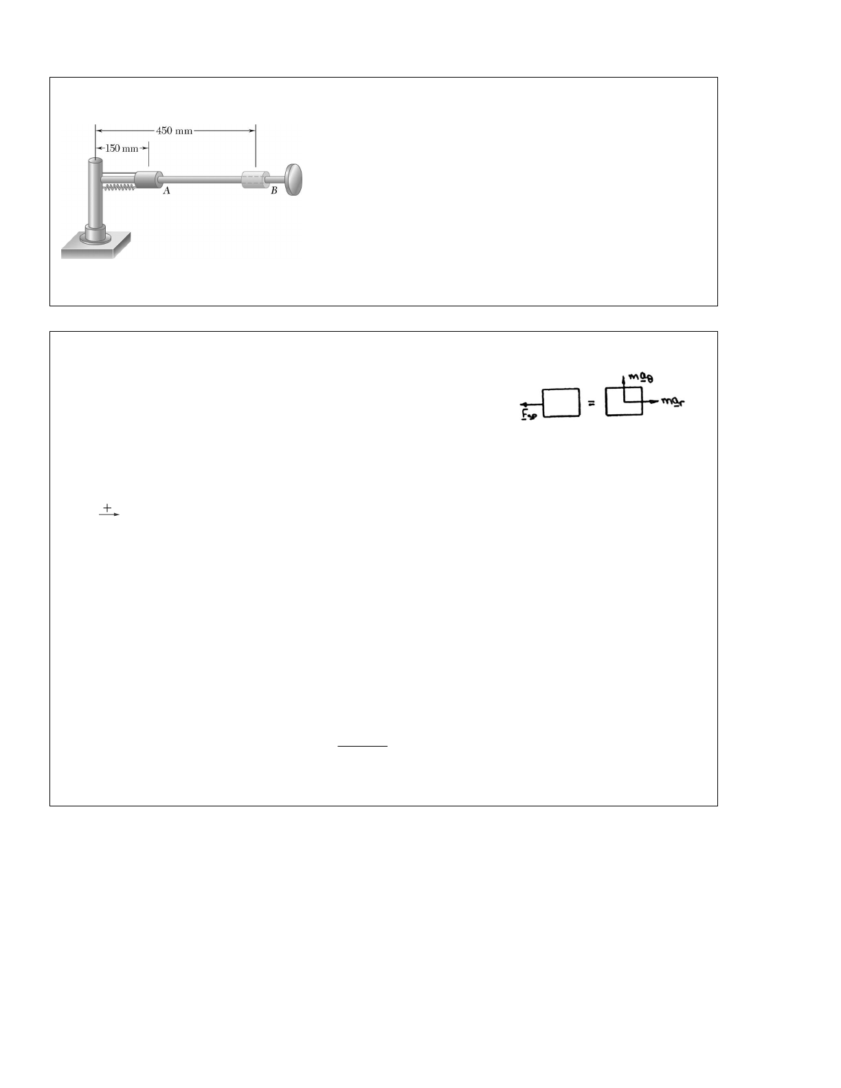 PROPRIETARY MATERIAL. © 2013 The McGraw-Hill Companies, Inc. All rights reserved. No part of this Manual may be displayed, reproduced or distributed in any form or by any means, without the prior written permission of the publisher, or used beyond the limited distribution to teachers and educators permitted by McGraw-Hill for their individual course preparation. If you are a student using this Manual, you are using it without permission. 442 PROBLEM 12.90 A 1 kg collar can slide on a horizontal rod, which is free to rotate about a vertical shaft. The collar is initially held at A by a cord attached to the shaft. A spring of constant 30 N/m is attached to the collar and to the shaft and is undeformed when the collar is at A. As the rod rotates at the rate 16 rad/s,θ = the cord is cut and the collar moves out along the rod. Neglecting friction and the mass of the rod, determine (a) the radial and transverse components of the acceleration of the collar at A, (b) the acceleration of the collar relative to the rod at A, (c) the transverse component of the velocity of the collar at B. SOLUTION First note ( )sp AF k r r= − (a) 0 and at ,F Aθ = 0r spF F= − = ( ) 0A ra = ( ) 0Aa θ = (b) :r rF maΣ = 2( )spF m r rθ− = − Noting that collar/rod ,a r= we have at A 2 collar/rod 2 collar/rod 0 [ (150 mm)(16rad/s) ] 38400 mm/s m a a = − = or 2 collar/rod( ) 38.4 m/sAa = (c) After the cord is cut, the only horizontal force acting on the collar is due to the spring. Thus, angular momentum about the shaft is conserved. 0( ) ( ) where ( )A A B B A Ar m v r m v v rθ θ θ θ= = Then 150 mm ( ) [(150 mm)(16rad/s)] 800 mm/s 450 mmBv θ = = or ( ) 0.800 m/sBv θ =