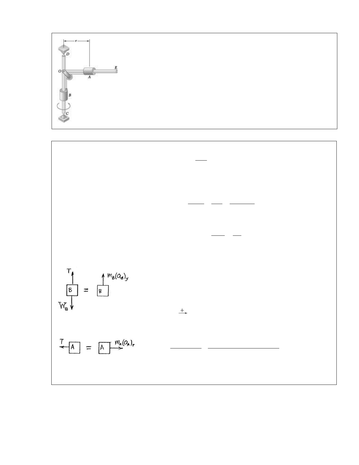 PROPRIETARY MATERIAL. © 2013 The McGraw-Hill Companies, Inc. All rights reserved. No part of this Manual may be displayed, reproduced or distributed in any form or by any means, without the prior written permission of the publisher, or used beyond the limited distribution to teachers and educators permitted by McGraw-Hill for their individual course preparation. If you are a student using this Manual, you are using it without permission. 445 PROBLEM 12.92 Two 2.6-lb collars A and B can slide without friction on a frame, consisting of the horizontal rod OE and the vertical rod CD, which is free to rotate about CD. The two collars are connected by a cord running over a pulley that is attached to the frame at O and a stop prevents collar B from moving. The frame is rotating at the rate 12 rad/sθ = and 0.6 ftr = when the stop is removed allowing collar A to move out along rod OE. Neglecting friction and the mass of the frame, determine, for the position 1.2 ft,r = (a) the transverse component of the velocity of collar A, (b) the tension in the cord and the acceleration of collar A relative to the rod OE. SOLUTION Masses: 22.6 0.08075 lb s /ft 32.2A Bm m= = = ⋅ (a) Conservation of angular momentum of collar A: 0 2 0 1( ) ( )H H= 1 1 2 2( ) ( )A Am r v m r vθ θ= 2 2 1 1 1 1 2 2 2 ( ) (0.6) (12) ( ) 3.6 1.2 r v r v r r θ θ θ= = = = 2( ) 3.60 ft/svθ = 2 2 ( ) 3.6 3.00 rad/s 1.2A v r θθ = = = (b) Let y be the position coordinate of B, positive upward with origin at O. Constraint of the cord: constant or r y y r− = = Kinematics: 2( ) and ( )B y A ra y r a r rθ= = = − Collar B: :y B B B B BF m a T W m y m rΣ = − = = (1) Collar A: 2( ) : ( )r A A r AF m a T m r rθΣ = − = − (2) Adding (1) and (2) to eliminate T, 2( )B A B AW m m r m rθ− = + + 2 2 2 /rod (0.08075)(1.2)(3.00) (2.6) 10.70 ft/s 0.08075 0.08075 A B A A B m r W a r m m θ − −= = = = − + + ( ) (0.08075)( 10.70 32.2)BT m r g= + = − + 1.736 lbT = 2 / rod 10.70 ft/sAa = radially inward.