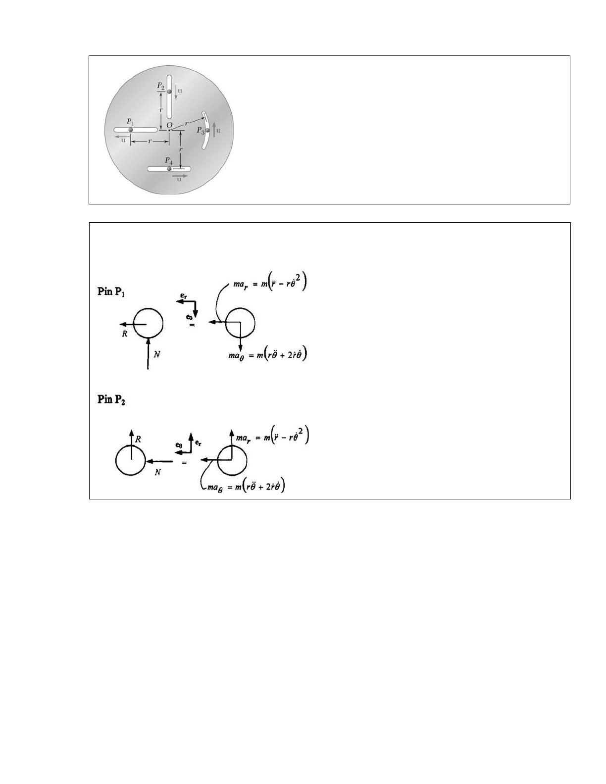 PROPRIETARY MATERIAL. © 2013 The McGraw-Hill Companies, Inc. All rights reserved. No part of this Manual may be displayed, reproduced or distributed in any form or by any means, without the prior written permission of the publisher, or used beyond the limited distribution to teachers and educators permitted by McGraw-Hill for their individual course preparation. If you are a student using this Manual, you are using it without permission. 405 PROBLEM 12.F9 Four pins slide in four separate slots cut in a horizontal circular plate as shown. When the plate is at rest, each pin has a velocity directed as shown and of the same constant magnitude u. Each pin has a mass m and maintains the same velocity relative to the plate when the plate rotates about O with a constant counterclockwise angular velocity ω. Draw the FBDs and KDs to determine the forces on pins P1 and P2. SOLUTION