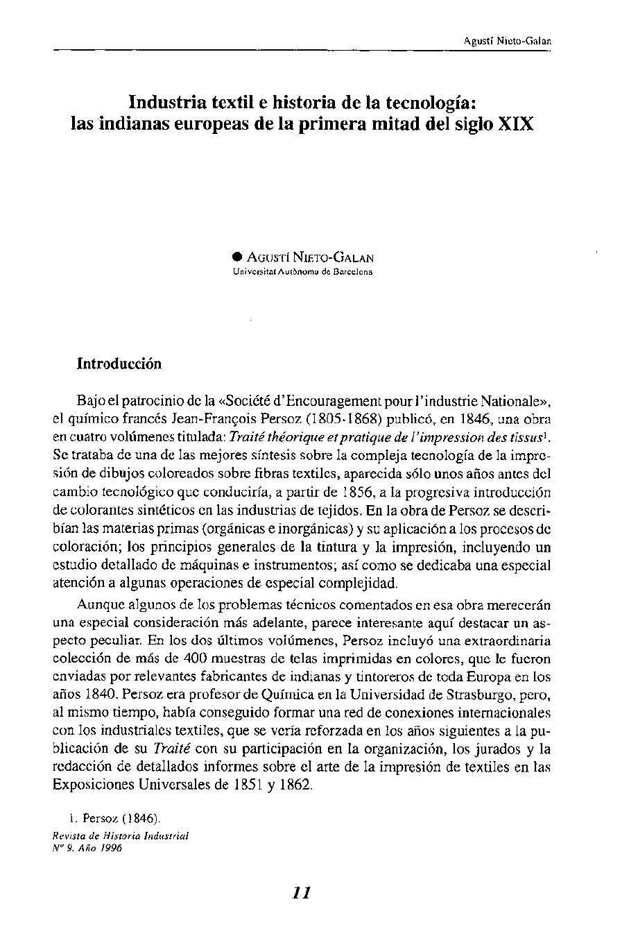 Agustí Nieto-Galan Industria textil e historia de la tecnologia: las indianas europeas de la primera mitad del siglo XIX AGUST~ NIETO-GALAN Universitat Autbnoma de Barcelona Introducción Bajo el patrocini0 de la c<Société dYEncouragement pour l'industrie Nationale,,, el quimico francés Jean-Frangois Persoz (1 805- 1868) publicó, en 1846, una obra en cuatro volúmenes titulada: Traité théorique etpratique de L'impression des tissusl. Se trataba de una de las mejores síntesis sobre la compleja tecnologia de la impre- sión de dibujos coloreados sobre fibras textiles, aparecida s610 unos años antes del cambio tecnológico que conduciría, a partir de 1856, a la progresiva introducción de colorantes sintéticos en las industrias de tejidos. En la obra de Persoz se descri- bían las materias primas (orgánicas e inorgánicas) y su aplicación a 10s procesos de coloración; 10s principios generales de la tintura y la impresión, incluyendo un estudio detallado de máquinas e instrumentos; asi como se dedicaba una especial atención a algunas operaciones de especial complejidad. Aunque algunos de 10s problemas técnicos comentados en esa obra merecerán una especial consideración más adelante, parece interesante aquí destacar un as- pecto peculiar. En 10s dos ultimos volúmenes, Persoz incluyó una extraordinaria colección de más de 400 muestras de telas imprimidas en colores, que le fueron enviadas por relevantes fabricantes de indianas y tintoreros de toda Europa en 10s años 1840. Persoz era profesor de Química en la Universidad de Strasburgo, pero, al mismo tiempo, había conseguido formar una red de conexiones internacionales con 10s industriales textiles, que se vería reforzada en 10s años siguientes a la pu- blicación de su Traité con su participación en la organización, 10s jurados y la redacción de detallados informes sobre el arte de la impresión de textiles en las Exposiciones Universales de 185 1 y 1862. 1 . Persoz ( 1 846) Revista de Historia Indltstrial Nu 9. AAo 1996 Industria textil e historia de la tecnologia: las indianas europeas de la primera mitad del siglo XIX La colección de telas imprimidas en el libro de Persoz combinaba diferentes sustratos de fibra textil (lana, algodón, lino o seda), con colorantes naturales (ru- bia, cochinilla, indigo, azul de Prusia, pastel, palo amarillo, gualda, etc.), produc- tos auxiliares de tintura (gomas, resinas, Óxidos metálicos, sales, etc.), y diversos procedimientos de fabricación (impresión continua, discontinua, reservas, cfescar- gas, colores al vapor, etc.). Se podría decir que para el historiador cada muestra es una <<ventana>> a través de la cua1 podria reconstruirse la compleja tecnologia de la impresión, y la misma obra de Persoz en su conjunt0 es un documento excelente para conocer la geografia tintórea (industrias, ciudades, regiones, empresarios, expertos tintoreros, etc., que estaban detrás de la fabricación a gran escala). ~Cuáles eran las caracteristicas principales desde el punto de vista técnico que permitian llegar a la confección con éxito de esas bellas muestras coloreadas que aparecian en la obra de Persoz? Las próximas páginas intentan, al menos en parte, dar respuesta a esta cuestión, explorando 10s antecedentes en las primeras dCcadas del siglo XIX que propiciaron la aparición de una obra de estas caracteristicas en un momento de madurez de la tecnologia de la tintura y la impresión con coloran- tes de origen natural. El sistema técnico de las indianas En 1978, el historiador de la tecnologia Bertrand Gille definia un esquema en cinco etapas para explicar el funcionamiento general de la industria texti12: (a) la obtención de la materia prima (animal, vegetal o, posteriormente, sintética); (b) la preparación de la misma (lavado, desengrase, etc.); (c) la hilatura; (d) el tejido; (e) 10s aprestos sucesivos (blanqueo, tintura, impresión, acabados). Gille proponia un modelo de múltiples interacciones en el que ligeros cambios en alguna de las eta- pas podian modificar sustancialmente las otras operaciones. La comprensión de la tecnologia de las indianasi y de las telas impresas y teñidas en general, que se incluia en el apartado (e) de 10s aprestos, no seda posible sin un intento de integrar aspectos relacionados con 10s saberes quimicos, mecáni- cos, estéticos y sociológicos de la Europa de la primera industrialización. No es por casualidad que uno de 10s fundadores de la historia de la tecnologia como disciplina propia, el profesor Melvin Kranzberg, ubicara, en la introducción a un catálogo bibliográfico de obras publicadas en el mundo entero sobre blanqueo y coloración4, un comentari0 sobre esta tecnologia dentro de un sistema técnico com- plejo e interconectado. Según Kranzberg": 2. Gille (19781, pp. 17-18. 3. Chapman y Chassagne (1981). 4. Ron (1991). 5. Ron (1991), p. 8. Arusti Nieto-Galan <<...la llegada de la revolución industrial y la difusión de la rnecanización del hilado y de2 tejido, significó un estimulo añadido para la búsqueda de rnás eficaces preparaciones quírnicas para la irnpresión, la tintura y el acabado para colorear la gran cantidad de telas obtenidas con las nuevas máquinas. w Kranzberg recogia aquí una tradición historiográfica que se habia iniciado unas décadas antes en 10s primeros modelos propuestos para explicar el cambio tecno- lógico. Si ya en 1934 Lewis Mumford6 habia introducido la idea un poc0 ambigua de una evolución técnica en cuatro grandes etapas (eotécnica, paleotécnica, neo- técnica y biotécnica), en 1978 Bertrand Gille publicó en su Histoire des Techniques una descripción más rigurosa y detallada de 10 que podia ser un sistema técnico, entendido como una especie de coherencia a diferentes niveles de 10s objetos y las estructuras técnicas que existen en un momento histórico determinado7. Asi, 10s sistemas clásicos estaban basados en el agua y la madera, 10s industriales en el vapor, el 