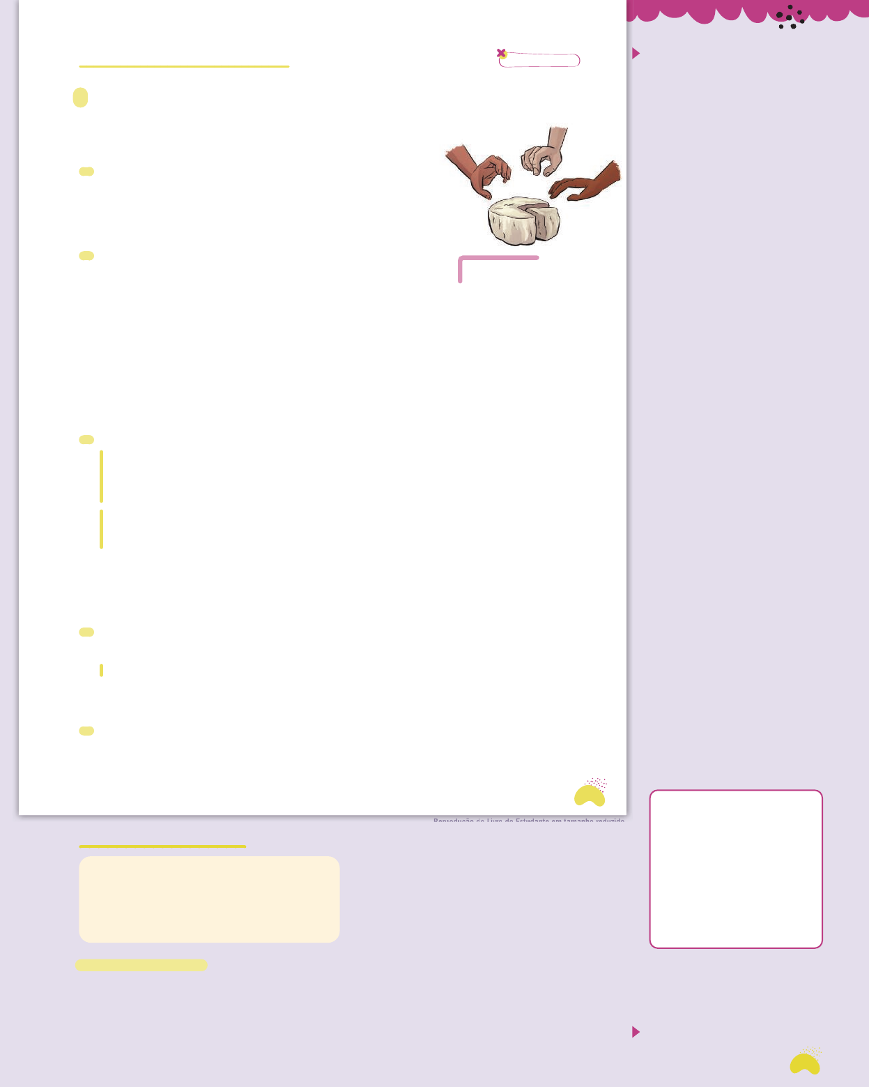 27 Reprodução do Livro do Estudante em tamanho reduzido. Interpretação do texto Habilidades da BNCC: EF69LP32, EF69LP33, EF69LP44, EF69LP47, EF69LP49, EF69LP52, EF69LP53, EF69LP54, EF69LP55, EF67LP28, EF67LP36, EF06LP03, EF06LP04 Compreensão inicial Atividade 1 a) Se necessário, ajudar os estudantes a perceber que há qua- tro personagens no conto, incluindo o dono da venda, que lhes dá o queijo. Trata-se de um personagem secundário. Atividade 2 Essa é uma questão de inferência, pois exige que os estudantes analisem as atitudes e as ações dos persona- gens para chegar à conclusão sobre as características de cada um, o que exercita a análise da função e da flexão de substantivos e adjetivos (conforme habilidade EF06LP04). c) Se julgar pertinente, comentar com os estudantes que em duas oportunidades o roceiro chama o fazendeiro de nhonhô (que, de acordo com o Dicionário eletrôni- co Houaiss da língua portuguesa, no contexto da es- cravidão, era um tratamento reverente dispensado aos brancos, especialmente ao patrão ou proprietário, pelas pessoas escravizadas e seus descendentes). Essa obser- vação contribui para o desenvolvimento da habilidade EF69LP44, de inferência da presen- ça de valores sociais, culturais e hu- manos e de diferentes visões de mundo no texto literário, reconhe- cendo formas de estabelecer múl- tiplos olhares sobre a sociedade e cultura considerando o contexto so- cial e histórico de sua produção. Atividade 3 a) Caso os estudantes tenham dificul- dade para chegar à resposta, pedir a eles que retomem o texto. Atividade 4 O objetivo da atividade é colocar em destaque o desenvolvimento do voca- bulário dos estudantes. Essa é uma prática intencional que, assim como o glossário apresentado junto ao tex- to, visa promover a ampliação do re- pertório. Nessa atividade é também desenvolvida a habilidade EF06LP03, de analisar diferenças de sentido en- tre palavras. Atividade 5 Chamar a atenção dos estudantes para o fato de o nome Trancoso mi- grar da autoria das histórias reunidas pelo autor Gonçalo Fernandes Tranco- so no século XVI em Portugal (confor- me mencionado antes da seção Leitu- ra) para o nome do herói popular que vence os ricos e poderosos por meio da astúcia. O estabelecimento dessa rela- ção contribui para o exercício da habi- lidade EF69LP54, de analisar o efei- to de sentido decorrente do emprego de palavras e expressões percebendo sua função na caracterização do per- sonagem. Cabe observar que o termo herói identifica o personagem principal de uma obra de ficção, que pode ser ca- racterizado como um herói clássico (aquele que apresenta valores e con- dutas exemplares) ou como um anti- -herói (aquele a que faltam atributos fí- sicos e/ou morais característicos do he- rói clássico, como é o caso de Trancoso). Reprodução do Livro do Estudante em tamanho reduzido NÃO ESCREVA NO LIVRO.Interpretação do texto Compreensão inicial O conto lido é da tradição popular oral. Para melhor saboreá-lo, é importan- te que ele seja lido em voz alta, com muita expressividade, e seja compreendido. Para isso, responda às seguintes questões. 1 Nesse conto popular destacam-se três personagens centrais. a) Como esses personagens são nomeados no texto? b) Só um desses personagens foi caracterizado de acordo com a aparência física. Escreva o nome desse personagem e as características relaciona- das a ele. 2 Na leitura do conto, é possível perceber também as características da per- sonalidade desses personagens. No caderno, escreva o nome do personagem relacionado a cada uma das características. Em seguida, escreva a justificativa, ou seja, a razão pela qual você indicou aquele personagem. a) O mais medroso. b) O que procura demonstrar que é corajoso. c) O mais humilde ou submisso. d) O que parecia ser o mais esperto. e) O mais enojado. f) O que foi realmente o mais esperto. 3 Releia estes dois trechos do conto. Dormiram que Deus deu. No canto do primeiro galo pularam da cama, selaram os cavalos enquanto o roceiro ajeitava seu burro velho. Engoliram um café com vento... E pé na estrada. A fome apertou, o padre foi contando o seu sonho: — Cês não ouviram um barulho de noite? Pois era eu que me levantei pra comer o queijo. Como vocês estavam no céu, achei que não precisavam mais do queijo. Agora, responda às questões. a) Quando o roceiro comeu o queijo, já sabia qual era o sonho de cada um dos companheiros? Explique sua resposta. b) Que estratégia ele utilizou para justificar a posse do queijo? 4 Vocabulário em foco. Releia o trecho a seguir observando o sentido da expres- são destacada. O padre e o fazendeiro olharam o roceiro de banda. Olhar de banda significa olhar de lado, com suspeita e desconfiança. Que outros significados você conhece da palavra banda? Dê exemplos. 5 No fim do conto o roceiro é identificado pelo narrador como Trancoso. Ele é o personagem principal da história? Justifique sua resposta com base em elementos do conto. Fazendeiro, padre e roceiro. Roceiro: um só dente na boca, cara de bobo. O padre. O fazendeiro. O roceiro. Possibilidades: o padre ou o fazendeiro. O fazendeiro. O roceiro. submisso: que aceita estar em uma posição inferior. enojado: que sente nojo. 2a. Justificativa: Tem medo de andar sozinho, tem medo de curupira; é chamado no texto de “medrosão”. 2b. Justificativa: Porque disse ao padre para não se preocupar com o curupira. 2c. Justificativa: Porque fica de fora da conversa entre o fazendeiro e o padre por entender que não tinha “conversa de doutor”. 2d. Justificativa: O padre porque sugeriu que quem tivesse o sonho mais bonito ficaria com o queijo e ele conta que sonhou que havia uma escada que o conduzia direto para o céu. O fazendeiro porque sonhou que estava no céu. 2e. Justificativa: Porque foi o último a beber água na moringa do roceiro; porque procurou uma parte rachada no bocal da moringa por achar que al