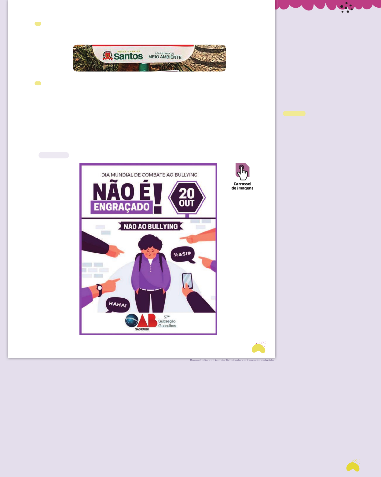 229 Reprodução do Livro do Estudante em tamanho reduzido. Atividades 5 e 6 A atividade 5 destaca a participa- ção de órgãos públicos na conscien- tização da população para problemas relacionados à responsabilidade so- cial em questões de saúde pública. A atividade 6 tem por objetivo expandir a conversa para questões de cidadania, reforçando a reflexão sobre a impor- tância de ações cidadãs, de se ques- tionar sobre o “descartável” (objeto e animal), sobre atitude de responsabi- lidade socioambiental. Texto 2 A escolha desse cartaz tem por ob- jetivo proporcionar momentos de re- flexão sobre um problema que tem se tornado muito presente nos dias de hoje: bullying. É preciso promover a discussão de atitudes, evidenciando a necessidade de se preservar a saúde mental e de se criar uma cultura de paz na escola, abordando as consequên- cias desastrosas da prática do bullying. Comentar com os estudantes que a palavra bullying vem do inglês bully, que significa “valentão, brigão”. Há três tipos de pessoas envolvidas em situa- ções de bullying: ⓿ vítimas ou alvos: são os que sofrem a violência; ⓿ agressores ou autores: são os que intimidam as vítimas; ⓿ testemunhas ou espectadores: são os que presenciam a situação. A Lei nº- 13.185, em vigor desde 2016, classifica o bullying como inti- midação sistemática, atos de humilha- ção ou discriminação em que é usa- da a violência física ou psicológica. O bullying pode incluir ataques físicos, insultos, ameaças, comentários e ape- lidos pejorativos, entre outros. Inicialmente, solicitar aos estudan- tes que observem a propaganda e res- pondam, antes mesmo de ler o texto verbal, sobre o que ela trata. Eles pro- vavelmente a relacionarão com o te- ma de agressão, desrespeito, intimida- ção ou gozação, não necessariamente empregando o termo bullying. Sugere- -se ler a definição e perguntar aos es- tudantes se já presenciaram situações desse tipo. Reprodução do Livro do Estudante em tamanho reduzido 5 O cartaz foi produzido por uma empresa que participa de projetos educativos e campanhas. Ele tam- bém apresenta estas assinaturas: Por que a campanha apresenta a assinatura da Secretaria de Meio Ambiente? 6 Essa propaganda usa vários recursos porque tem a intenção de influenciar o leitor, levando-o a parti- cipar de uma campanha. a) Em sua opinião, essa propaganda consegue influenciar o leitor? Por quê? b) Os meios usados para convencer o leitor ajudam a incentivar uma ação cidadã? Por quê? Você viu um cartaz de propaganda sobre uma campanha apresentada em totem em que o argumento foi construído com o uso da negação: “Esse não”. Veja agora um cartaz de propaganda de uma campanha, publicado na internet, que também faz uso da negação: “Não é engraçado! Não ao bullying”. Leiam juntos o cartaz de propaganda a seguir. Texto 2 6a. Resposta pessoal. Espera-se que os estudantes, considerando o uso da foto do cão na posição em que está e a expressão do olhar do animal, avaliem que a propaganda pode convencer o leitor pelo apelo emocional. 5. Para reforçar que a Secretaria de Meio Ambiente está empenhada em chamar a atenção da população para um problema que acontece na cidade. 6b. Sim. Espera-se que os estudantes observem que há dois elementos a considerar: a proteção ao animal e a responsabilidade ambiental sobre o que é descartado. Cartaz da campanha “Não é engraçado! Não ao bullying”. Ordem dos Advogados do Brasil (OAB), Guarulhos (SP), 2020. R e p ro d u ç ã o /M e ra /S e m a m / P re fe it u ra d e S a n to s R e p ro d u ç ã o /O A B G u a ru lh o s 229 224-253_Telaris6_LP_LE_MPU_U08_PNLD24.indd 229224-253_Telaris6_LP_LE_MPU_U08_PNLD24.indd 229 7/28/22 3:11 PM7/28/22 3:11 PM 230 Reprodução do Livro do Estudante em tamanho reduzido. Interpretação do texto Compreensão inicial Habilidades da BNCC: EF69LP04, EF67LP07, EF67LP08 No momento do trabalho com a sub- seção Compreensão inicial, ou após os estudantes responderem às questões dessa subseção, ajudá-los a notar os aspectos composicionais da propagan- da, os objetivos e a forma de persuasão. Nesta unidade, a escolha do termo convencer em lugar de persuadir justi- fica-se pela equivalência entre ambos e pela maior facilidade de compreen- são do primeiro por estudantes dessa faixa etária. Persuadir: 1. levar (alguém ou a si pró- prio) a crer ou aceitar; convencer(-se); 2. levar (alguém ou a si próprio) a tomar decisão sobre (algo); 3. fazer (alguém) mudar de ideia ou atitude (por autorida- de, argumentação, raciocínio). [...] MICHAELIS on-line. Persuadir. Verbete. Disponível em: https:// michaelis.uol.com.br/moderno- portugues/busca/portugues- brasileiro/persuadir/. Acesso em: 22 abr. 2022. Atividade 1 c) É importante que os estudantes per- cebam que a data é deflagradora da campanha. O dia mundial leva a pro- duzir o surgimento da campanha. Atividade 3 Esta é uma questão de inferência e pressupõe o dado apresentado: idade incerta e mochila nas costas. A inten- ção dessa escolha foi, provavelmente, estender o ato de bullying a diferentes ambientes e pessoas. Linguagem e construção do texto Habilidades da BNCC: EF69LP01, EF67LP07, EF67LP08 Atividade 1 b) Comentar que o ponto de exclama- ção neste caso é um sinal gráfico usado para dar uma entonação com valor imperativo. Auxiliar os estudantes caso tenham dificuldade para responder às ativida- des de 3 a 5, pois elas pressupõem inferências mais complexas. Há neces- sidade de eles analisarem os dados, observarem padrões e acionarem o pensamento lógico (pensamento com- putacional). Reprodução do Livro do Estudante em tamanho reduzido NÃO ESCREVA NO LIVRO.Interpretação do texto Compreensão inicial 1 Responda: a) Qual é o assunto desse cartaz de propaganda? b) Qual é a campanha destacada nele? c) Qual informação presente no cartaz ajuda a incentivar essa campanha? 2 A image