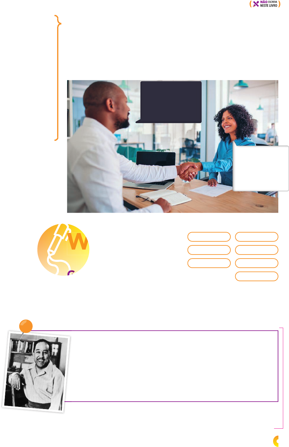 3. Get together with a classmate to role-play a job interview. Follow the instructions. Student A: You are the interviewer. Ask questions to the candidate. You can use the questions you checked in activity 1 and you can also add other questions. Student B: You are a candidate for the job. Answer the interviewer’s questions. TIP Às vezes, aprendizes de inglês, durante uma interação oral, hesitam ao tentar encontrar a tradução exata de alguma palavra. Se você não souber a tradução exata de algo que queira dizer, substitua-a por um sinônimo, explique de outra maneira ou use exemplos para que o interlocutor entenda a mensagem que você quer comunicar. Hello, I’m Douglas Perez, Human Resource manager here. Nice to meet you. m a v o /S h u tt e rs to ck Hi, I’m Laura Collins. I’m applying for the sales assistant job. Nice to meet you, too. Writing Getting Ready to Write 1. You are going to read a poem by Langston Hughes called “I Dream a World”. Before reading the poem, try to fi nd some information about the author in the text below. Then talk to a classmate. What do you think his dream world is like? Resposta pessoal Writing Getting Ready to Write W Getting Ready to W EM13LGG104 EM13LGG204 EM13LGG301 EM13LGG403 EM13LGG601 EM13LGG603 EM13LGG701 Langston Hughes Langston Hughes was one of the most important writers and thinkers of the Harlem Renaissance, which was the African American artistic movement in the 1920s that celebrated black life and culture. […] Through his poetry, novels, plays, essays, and children’s books, he promoted equality, condemned racism and injustice, and celebrated African American culture, humor, and spirituality. H u lt o n A rc h iv e /G e tt y I m a g e s Os artistas afro-americanos buscavam afi rmar sua identidade e orgulho racial, desafi ando o preconceito e a discriminação, que eram eminentes, sobretudo nos estados do sul daquele país. O movimento trouxe notoriedade a grandes obras afro-americanas e infl uen- ciou gerações futuras de artistas e intelectuais. Para saber mais sobre o movimento e o momento histórico em que surgiu, acesse o link https://www.comunidadeculturaearte.com/o-renascimento-de-harlem-um-despertar-afro-americano/. Acesso em: 8 abr. 2020. 3. Lembre aos estudantes que é comum iniciar uma entrevista de emprego com cumprimen- tos e apresentações e termi- ná-la com um agradecimento. Escreva no quadro algumas frases que eles podem usar em seu role-play, tanto para iniciar (I’d like to ask you a few ques- tions./Shall we start?) quanto para fi nalizar a entrevista (Thank you for your time./Thank you for coming./Good luck./We’ll be in touch.). Peça aos es- tudantes que troquem de papel/função, de modo que todos par- ticipem, seja como candidato, seja como entrevistador. Se possível, oriente-os a trocar de dupla, para que realizem as entrevistas mais de uma vez. Praticar várias vezes uma conversa semelhante ajuda no desenvolvimento de es- tratégias de produção oral e de fl uência. 1. O Renascimento do Harlem (Harlem Renaissance) foi um movimento artístico e cultural afro-ame- ricano, iniciado no fi nal dos anos 1920, no bairro do Harlem, em Nova York, nos Estados Unidos. Langston Hughes, 1945. LANGSTON Hughes. America’s Story. Available at: http://www.americaslibrary.gov/aa/hughes/aa_hughes_subj.html. Accessed on: Apr. 8, 2020. 115 VU_INGLES_Amadeu_g21Sa_105a118_U7_LA.indd 115VU_INGLES_Amadeu_g21Sa_105a118_U7_LA.indd 115 01/09/2020 11:5001/09/2020 11:50 2. Now read the poem below by Langston Hughes. I Dream a World I dream a world where man No other man will scorn, Where love will bless the earth And peace its paths adorn, I dream a world where all Will know sweet freedom’s way, Where greed no longer saps the soul Nor avarice blights our day. A world I dream where black or white, Whatever race you be, Will share the bounties of the earth And every man is free, Where wretchedness will hang its head And joy, like a pearl, Attends the needs of all mankind – Of such I dream, my world! HUGHES, Langston. Poetry for Young People. New York: Sterling Publishing, 2006. p. 40. 2. Pergunte aos estudantes se eles gostam de poesia e se cos- tumam ler poemas. Peça-lhes que pensem em poemas que já leram (em português ou mesmo em inglês) e pergunte quais são algumas características que po- demos encontrar nesse gênero textual. Poemas fazem parte do gênero literário e são uma forma de manifestação artística que envolve subjetividade. No poe- ma lido, algumas características são a escrita em versos e rimas (scorn/adorn; way/day; be/free; pearl/world). A Little Help adorn: decorar, ornamentar avarice: avareza, sovinice bless: abençoar blight: arruinar, desgraçar bounty: recompensa greed: ganância joy: alegria mankind: humanidade path: caminho pearl: pérola sap: enfraquecer, minar scorn: desprezar, desdenhar wretchedness: miséria 3. In I Dream a World, Langston Hughes tells us about his ideal world, focusing on four great themes: equality, freedom, peace and joy. In your notebook, match the verses below to the theme (sometimes more than one) he is talking about. a. I, IV; b. III, V; c. II; d. VI a. equality b. freedom c. peace d. joy I. “I dream a world where man / No other man will scorn,” II. “Where love will bless the earth / And peace its paths adorn” III. “I dream a world where all / Will know sweet freedom’s way,” IV. “A world I dream where black or white, / Whatever race you be, / Will share the bounties of the earth” V. “And every man is free,” VI. “And joy, like a pearl, / Attends the needs of all mankind” T h a is C ir c e lli /A rq u iv o d a e d it o ra 116 VU_INGLES_Amadeu_g21Sa_105a118_U7_LA.indd 116VU_INGLES_Amadeu_g21Sa_105a118_U7_LA.indd 116 01/09/2020 11:5001/09/2020 11:50