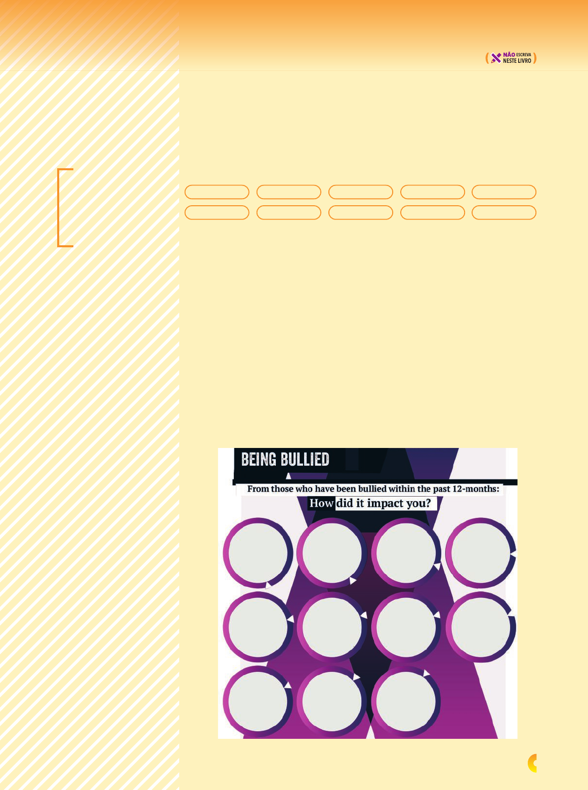 In Action 1 An Anti-Bullying Campaign 1. What do you know about bullying? Take notes in your notebook and discuss that problem with your classmates and teacher. You can use the following questions to guide you: • How do you defi ne bullying? • When can you say someone is being bullied? • What can you do if someone you know is being bullied or is bullying someone else? • Does the person who bullies need help? • Does bullying always involve physical contact? • Is it possible to bully using the internet as an instrument? 2. The infographic below was extracted from the Annual Bullying Survey 2019, conducted by Ditch the Label, an anti-bullying charity in England. Read the information in the text and, in your notebook, write all the correct alternatives according to it. Respostas pessoais Competências gerais da BNCC: 1, 2, 4, 5, 9 e 10 Competências específi cas de Linguagens e suas Tecnologias para o Ensino Médio: 1, 2, 3, 4 e 7 EM13LGG104 EM13LGG105 EM13LGG204 EM13LGG301 EM13LGG304 EM13LGG402 EM13LGG403 EM13LGG701 EM13LGG703 EM13LGG704 nismo dos estudantes, a busca por informações, a criatividade, a empatia e a cooperação. Os estudantes são incentivados a refl etir sobre uma questão relevante em nossa sociedade – nesse caso, o combate ao problema do bullying – e a agir, de forma responsável, para a sua solução. Esta Unidade pode ser planejada e realizada em parceria com os professores de Língua Portuguesa e Educação Física, conforme detalhado no Manual do Professor. 1. As questões propostas têm o intuito de introduzir o tópico e le- vantar o conhecimento prévio e as experiências dos estudantes. Elas podem ser alteradas, elimi- nadas ou substituídas conforme a necessidade ou o desejo da turma. Se achar adequado, a discussão pode ser feita em por- tuguês, para que os estudantes possam discutir suas ideias com maior profundidade. Na página https://www.stopbullying.gov/ bullying/what-is-bullying (acesso em: 8 jul. 2020), você encontra informações que podem ser úteis para essa discussão. Esta Unidade especial propõe aos estu- dantes que trabalhem de forma colabo- rativa para a criação de um produto fi nal que tem por objetivo o bem da socieda- de. As atividades estimulam o protago- THE ANNUAL Bullying Survey 2019. Ditch the Label. Available at: https://www.ditchthelabel.org/wp-content/ uploads/2020/05/The-Annual-Bullying- Survey-2019-1-2.pdf. Accessed on: Jul. 8, 2020. R e p ro d u ç ã o /w w w .d it ch th e la b e l. o rg 2. Explique aos estudantes que ditch the label é uma ex- pressão (literalmente, largue/ abandone/jogue fora o rótulo) adotada como nome de uma organização internacional, com sede na Inglaterra, voltada ao apoio a jovens que sofreram bullying ou qualquer outro tipo de preconceito. Ditch, como verbo regular, é o mesmo que dump, também usado com o sentido de “livrar-se de, largar, abandonar algo ou alguém de forma abrupta”. IMPACT FELT DEPRESSED FELT ANXIOUS HAD SUICIDAL THOUGHTS SELF-HARMED TRUANTED FROM SCHOOL/ COLLEGE DEVELOPED ANTI-SOCIAL BEHAVIOUR DEVELOPED AN EATING DISORDER ATTEMPTED SUICIDE RUN AWAY FROM HOME ABUSED DRUGS AND/OR ALCOHOL ENGAGED IN RISKY SEXUAL BEHAVIOUR 41% 13% 6% 33% 12% 4% 26% 11% 45% 20% 9% 99 VU_INGLES_Amadeu_g21Sa_099a102_IA1_LA.indd 99VU_INGLES_Amadeu_g21Sa_099a102_IA1_LA.indd 99 01/09/2020 11:4901/09/2020 11:49 a. Bullying victims are affected in many different ways. X b. Every bullying victim feels depressed. c. Some bullying victims had suicidal thoughts, some of them self-harmed and some actually attempted suicide. X d. Bullying victims are never at risk of losing their lives. 3. Listen to a Ditch the Label ambassador, Suzanne, who has gone through a bullying situation. Choose the correct options to complete the sentences. a. Suzanne feels a lot more now. • confident X • evident b. She received help from . • Ditch the Label X • no one c. Suzanne was able to reach out for . • help X • friends d. She says she is in a place now. • bad • good X 4. Read the following sentence from Suzanne’s speech and answer the questions in your notebook. “They really encouraged me to get the help that I didn’t really think I deserved.” a. How did Suzanne feel before getting in touch with the organization? b. What about you? Who do you look for when you need help? TRACK 8 She felt she didn’t deserve help. Resposta pessoal 3. O áudio desta atividade é retirado do vídeo “Welcome to Ditch the Label”, disponível em: https://www.youtube.com/ watch?v=5Bu-m4dAXRY. Aces- so em: 8 jul. 2020. R e p ro d u ç ã o /w w w .y o u tu b e .c o m /C a n a l D it ch th e L a b e l 100 VU_INGLES_Amadeu_g21Sa_099a102_IA1_LA.indd 100VU_INGLES_Amadeu_g21Sa_099a102_IA1_LA.indd 100 01/09/2020 11:4901/09/2020 11:49