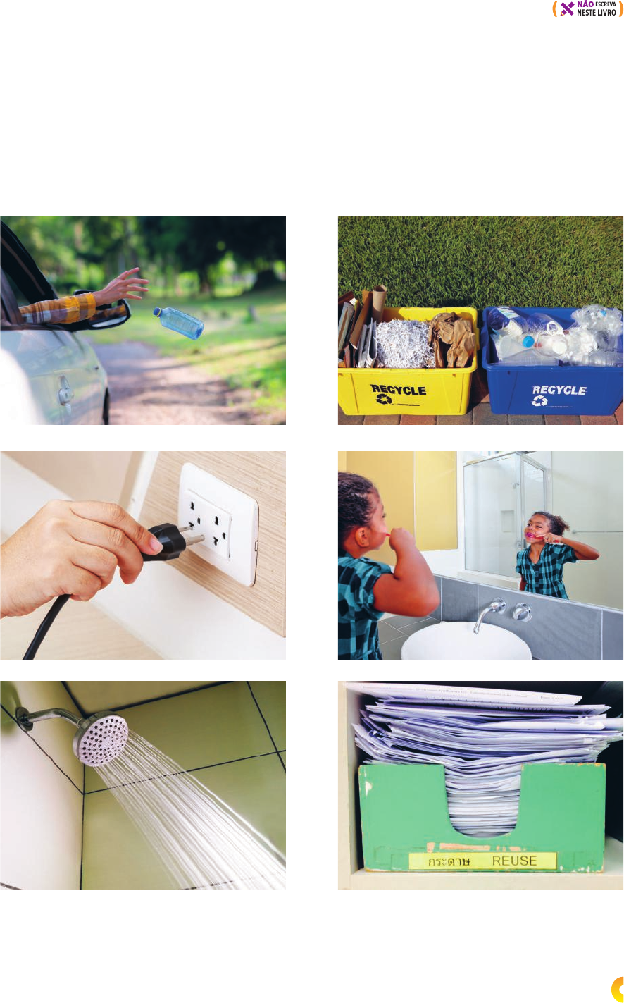 2. In your notebook, match the actions below to their corresponding pictures. Then compare your answers with a classmate. I. Turn off the faucet while brushing your teeth. d II. Take long showers. e III. Unplug electrical appliances when not in use. c IV. Sort out the trash. b V. Throw trash on the street. a VI. Reuse paper. f a. c. e. b. d. f. 2. Após fazer a correção da atividade, modele a pronún- cia das palavras e expressões em voz alta e peça aos estudantes que as repitam. 3. Talk to a classmate. Which actions from activity 2 help the environment and which actions harm the environment? 3. Peça aos estudantes que observem novamente as imagens da atividade 2. Aponte para a primeira imagem e pergunte a eles: Does that help or harm the environment? Espera-se que os estudantes respondam: It harms the environment. Escreva no quadro a pergunta e a resposta e sugira a eles que as usem como modelo para realizar esta atividade. N it ik a n T /S h u tt e rs to ck p ix fl y /S h u tt e rs to ck T h a m K C /S h u tt e rs to ck D a n a H o ff /S to ck b y te /G e tt y I m a g e s E d d y J o a q u im /T e tr a i m a g e s R F /G e tt y I m a g e s C re a ti v e T ra v e l P ro je c ts /S h u tt e rs to ck Actions that help the environment: turn off the faucet while brushing your teeth; unplug electrical appliances when not in use; sort out the trash; reuse paper. Actions that harm the environment: take long showers; throw trash on the street. 49 VU_INGLES_Amadeu_g21Sa_047a058_U3_LA.indd 49VU_INGLES_Amadeu_g21Sa_047a058_U3_LA.indd 49 01/09/2020 11:4201/09/2020 11:42 Reading Before You Read 1. Take a look at the article on the following page and answer the questions in your notebook. a. Which country is the website from? b. What is the target audience of the website? c. What is the main topic of the article? 2. The words below are in the article on the next page. Read and match them to the pictures. Use your notebook. Then compare your answers with your classmates. bees crops f ossil fuels lake pesticides river a. c. e. b. d. f. ReadingReadingReadingReading 1. Peça aos estudantes que ob- servem o endereço do site de onde o texto foi retirado para descobrir o país de origem e o público-alvo dele. Oriente-os a ler o título, pois isso os ajudará a identifi car o tema do texto. India kids the environment/environmental issues 2. Ao corrigir a atividade, per- gunte aos estudantes se sabem o que mostra a imagem do item c (usina de petróleo). Pergunte se os estudantes conhecem ou- tros combustíveis fósseis além do petróleo e quais são eles (gás natural e carvão mineral). lake river fossil fuels pesticides crops bees C re a ti v e T ra v e l P ro je c ts /S h u tt e rs to ck m o s e s d u k e s /S h u tt e rs to ck H a zl a n A b d u l H a k im /E + /G e tt y I m a g e s A n d ri i Y a la n s k y i/ S h u tt e rs to ck f. ie ld o f v is io n /S h u tt e rs to ck n e lic /S h u tt e rs to ck EM13LGG102 EM13LGG104 EM13LGG401 50 VU_INGLES_Amadeu_g21Sa_047a058_U3_LA.indd 50VU_INGLES_Amadeu_g21Sa_047a058_U3_LA.indd 50 01/09/2020 11:4201/09/2020 11:42