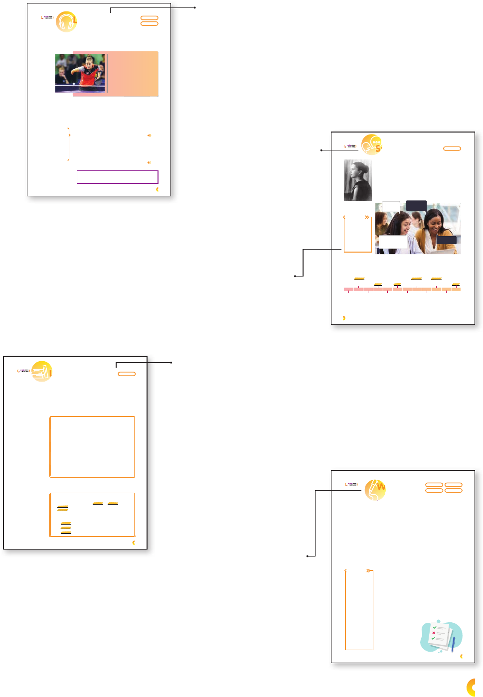 Listening Before You Listen 1. You are going to listen to an interview with the woman in the picture below. Look at her profi le and, with a classmate, answer the questions. ListeningListeningListeningListeningListening EM13LGG204 EM13LGG403 TIP Sempre leia as instruções das atividades antes de ouvir o áudio. Dessa forma, você vai saber com antecedência de que informações precisa e fi cará atento a palavras-chave enquanto ouve o áudio. a. What’s her name? b. Where is she from? c. How old is she? d. What sport can she play? e. Is she a good player? As You Listen 2. Now that you know who Natalia Partyka is, listen to part of an interview with her. In your notebook, write the sentences that are true according to what she says. a. Sports life is diffi cult. b. She cannot play well. c. She is confi dent and says she can beat everyone. 3. Listen again and choose the correct words to complete the sentence, according to what you hear. For Natalia Partyka, the Olympics / Paralympics are not easy, but she is really happy / sad that she can play well. TRACK 2 TRACK 2 Name: Natalia Partyka Country: Poland Born: July, 27 1989 Sport: Table tennis Some medals: Gold in Rio Paralympics 2016; Bronze in London Paralympics 2012; Silver in Beijing Paralympics 2008. O lim p ik /N u rP h o to /G e tt y I m a g e s 23 Language Study Simple Present 1. Read the sentences below about Bethanie Patch. Then use your notebook to complete the rules about the Simple Present. I study French in the arts component of my degree. I don’t live near the university. She participates in projects that help the community. She usually doesn’t buy food at university. Language Study EM13LGG403 a. As formas verbais destacadas em negrito nas frases acima referem-se a • ações que estão acontecendo agora. • fatos ou rotinas no presente b. Em frases afi rmativas, acrescentamos -s ou -es ao verbo quando o sujeito for • I, we, you, they. • he, she, it. c. Em frases negativas, usamos do not (ou sua forma contraída don’t) antes do infi nitivo do verbo quando o sujeito for • I, we, you, they. • he, she, it. d. Em frases negativas, usamos does not (ou sua forma contraída doesn’t) antes do infi nitivo do verbo quando o sujeito for • I, we, you, they. • he, she, it. a. Complete the rules about its interrogative form. Em perguntas, usamos antes do sujeito as formas do verbo auxiliar to do, que são duas: ou . Usamos quando o sujeito for I, you, we ou they e usamos quando o sujeito for he, she ou it. b. Complete the questions below using the appropriate form of the auxiliary verb to do. • Bethanie live near the university? • Bethanie study French? • you live near school? 2. Take a look at the questions in activities 2 and 6 of the section Reading. Then, in your notebook, complete other rules about the Simple Present. 63 Writing Getting Ready to Write 1. On pages 136 and 137, you answered a quiz. Go back to those pages, take a look at it again and, in your notebook, check its characteristics. a. It has questions related to one topic: famous paintings. b. The answers to the questions are subjective. c. For each question, there is more than one correct answer. d. All the questions are in the Simple Future. e. There are questions in the Simple Past. 2. In your notebook, choose the alternative that best defi nes a quiz. a. It is a written interview with famous people, usually found in magazines. b. It is a test of knowledge, a sort of contest between individuals or teams as a form of entertainment. 3. Now it is your turn to create a quiz to be taken by your classmates. Get together with a classmate and decide the topic of your quiz: art in general, modernism, artistic movements, famous artists, Brazilian artists, etc. Do some research about the topic. Writing and Rewriting 4. To create your quiz, follow these instructions: • Make a draft of six to ten quiz questions (questions and alternatives). • Exchange your draft with another pair. Share your ideas and get feedback. • Rewrite your quiz based on the feedback you had and make any improvements and necessary corrections. • Proofread your work. Thinking It Over 5. Take your classmates’ quizzes. What is your score? Writing Getting Ready to WriteGetting Ready to Write W Getting Ready to WGetting Ready to W EM13LGG701 EM13LGG703 EM13LGG104 EM13LGG403 Que tal criar seu quiz on-line e enviar o link ou compartilhá-lo em suas redes sociais, para que os colegas de turma e até mesmo outros colegas e amigos respondam? Você pode fazer isso por meio de ferramentas gratuitas para a criação de quizzes on-line, como o Quiz Maker, o Quizur e a versão gratuita do FlexiQuiz (disponíveis em: www.quiz-maker. com/; https:// pt.quizur.com/; https://www. fl exiquiz.com/. Acesso em: 14 abr. 2020). SUGGESTION S a x a ri n k a /S h u tt e rs to c k 145 Speaking 1. Tarsila do Amaral was an internationally famous Brazilian painter. What do you know about her? 2. Get together with a classmate and follow the instructions. Student A: On this page, you can see a timeline of Tarsila do Amaral’s life, but some information is missing. Your classmate has the information you need. Ask him/her questions to complete the timeline. Student B: Go to page 147. You will see a timeline of Tarsila do Amaral’s life, but some information is missing. Your classmate has the information you need. Ask him/her questions to complete the timeline. SpeakingSpeakingSpeaking EM13LGG403 Tarsila do Amaral, 1926. Você pode saber mais sobre Tarsila do Amaral, bem como conhecer suas obras, no site ofi cial da artista, disponível em: http:// tarsiladoamaral. com.br/. Acesso em: 25 jun. 2020. SUGGESTION TARSILA DO AMARAL (STUDENT A) She moved to Barcelona with her family. What happened in 1900? When did she visit Anita Malfatti’s exhibition “Exposição de Pintura Moderna”? She visited the exhibition in... R e p ro d u ç ã o /T a rs ila d o A m a ra l E m p re e n d im e n to s E + /G e tt y 