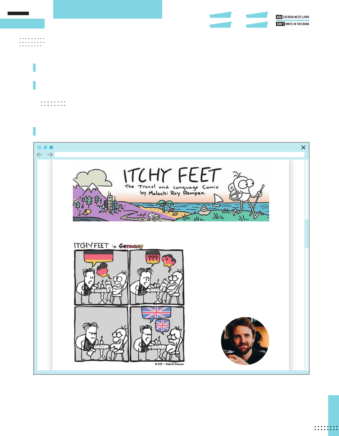 B a n c o d e i m a g e n s /A rq u iv o d a e d it o ra http://www.itchyfeetcomic.com/2012/09/default-language.html#.Xs_9lC-gSRt GOING FURTHER Pre-reading 1 Do you read comics? What kind of comics do you like reading? 2 Observe the web comic below. What is it about? Share your ideas with a classmate. Reading 3 Read the web comic and answer the questions in your notebook. Personal answers. Possible answers: It is about two people having trouble to understand each other. / It is about two people that manage to communicate in English, but not in German. RE MPEN, Malachi Ray. Default language. Itchy Feet. Available at: http://www.itchyfeetcomic.com/2012/09/default-language.html#.Xs_9lC-gSRt. Accessed on: May 25, 2020. EM13LGG101 EM13LGG102 EM13LGG103 EM13LGG202 Default Language Sunday, September 23, 2012 About ITCHY FEET is the weekly web comic about travel, life in foreign countries, and learning new languages. Readers can expect an astonishing array of exaggerated facial expressions, humorous situations involving foreigners and foreign lands, and ordinary silliness. Every Sunday! By Malachi Ray Rempen and Keen Bean Studio. R e p ro d u ç ã o /w w w .i tc h y fe e tc o m ic .c o m R e p ro d u ç ã o /w w w .i tc h y fe e tc o m ic .c o m A Who is the author of the web comic? B Where and when was this web comic published? Malachi Ray Rempen It was published on the Itchy Feet Comic Website, on September 23, 2012. Reprodução /w w w .itch y fe e tc o m ic.com 83 VU_INGLES_Julia_g21At_078a093_U05_LA.indd 83VU_INGLES_Julia_g21At_078a093_U05_LA.indd 83 9/27/20 11:05 AM9/27/20 11:05 AM 4 Identify the characters and where they are. Justify your answer with elements from the web comic. 5 Read the fi rst and the second panel of the web comic. Choose the correct answer for the following questions and write them in your notebook. A What language do the characters use? • They talk in English, because they do not speak German. • They talk in German. The colors in the speech bubbles represent the German fl ag. X B Is their communication successful? • No, it isn’t. The waiter does not understand what the customer is trying to say. X • Yes, it is. The waiter asks other questions and the customer answers them in German. 6 Now read the third and the fourth panels. Then read the sentences below and, in your notebook, write T (true) or F (false). A In the third panel, they are silent and they look comfortable. F B The language they speak in the fourth panel is not the same language they speak in the beginning of the web comic. T C The waiter and the customer look uncomfortable in the third panel. T D The waiter and the customer have a common language that they both understand. T 7 What language do the characters use in the last panel? Is communication successful in the end? Write and justify your answer in Portuguese in your notebook. The characters are a waiter and a customer. They are in Germany. Possible elements: the table, the clothes of the waiter, the notepad, the candle, the menu and the title “Itchy Feet in Germany”. They talk in English and the communication is successful. It is possible to see the United Kingdom � ag in both speech bubbles, which means they can understand each other. Post-reading 8 Which of the following sentences from Odette Spiteri’s blog post relate to the web comic? A “Learning helps me discover my hidden talents.” B “Big companies hire professional staff, soon after making sure that the people they are employing are good in English.” C “The English language helps us to communicate with nearly all the people around the world.” X D “After all, no man, or woman is an island.” 9 What do you usually do when people don’t understand what you are trying to say? Personal answer. 84 VU_INGLES_Julia_g21At_078a093_U05_LA.indd 84VU_INGLES_Julia_g21At_078a093_U05_LA.indd 84 9/27/20 11:05 AM9/27/20 11:05 AM