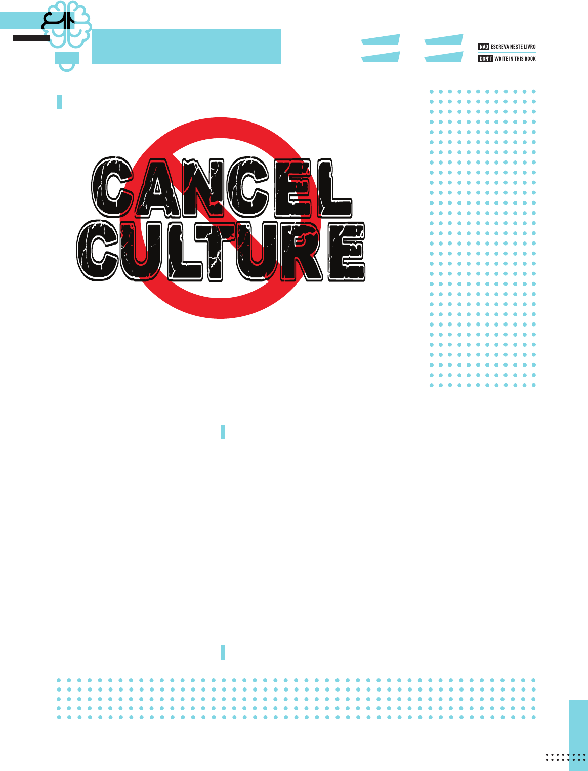 FOOD FOR THOUGHT EM13LGG202 EM13LGG704 EM13LGG102 EM13LGG702 37 1 Work in groups to discuss the questions below. A What do you know about the cancel culture, also known as call-out culture? B Do you know the reasons why some public fi gures are “cancelled” on social media? Possible answer: It’s to boycott a public � gure for offensive comments or behavior on social media. Possible answer: Because they did something bad or offensive that was exposed on social media. 2 Do some research on the call-out culture. Follow the steps and take notes in your notebook. A What is cancellation culture? B Is it good or bad to cancel someone? Can it be a form of activism? Why (not)? C How is someone cancelled? Can anyone cancel another person? D When did it begin? How? E Find out famous people that were cancelled and why. F Is there a specifi c amount of time for people to be cancelled? G How can a person stop being cancelled? 3 Report your fi ndings to other groups. Personal answers. Esta atividade pode ser realizada em português, conforme a turma. S ta c e y L y n n P a y n e / S h u tt e rs to ck VU_INGLES_Julia_g21At_030a045_U02_LA.indd 37VU_INGLES_Julia_g21At_030a045_U02_LA.indd 37 9/27/20 10:58 AM9/27/20 10:58 AM EM13LGG303 EM13LGG702 EM13LGG102 EM13LGG403 38 LISTEN UP! Pre-listening LANGUAGE PLUS Yout é uma palavra do dialeto patoá jamaicano – língua crioula de base inglesa falada – que signifi ca youth. Talk Up Yout is a Jamaican multi-media platform show launched in 2010 to give Jamaican youth a voice. 1 You’re going to listen to part of a show called Talk Up Yout. One of the participants talks about one of the downsides of social media. Can you guess what it is? Listening 3 Listen to the audio and check your guess from activity 1. 4 What is the main idea of the audio? Write the correct option in your notebook. A You have to be careful with what you post on your social media. X B You need to share your ideas with everybody. 5 What suggestions does the Jamaican girl give in the audio? Write the correct answers in your notebook. A You can change the privacy setting on your post. X B You can post everything to everybody. C You can limit posts with sensitive information. X No. 4 2 Are you careful while using social media? What do you do to stay safe? Personal answers. Possible answers: privacy matters, advertisings, cyberbullying, time consuming, etc. R e p ro d u ç ã o /h tt p s :/ /w w w .y o u tu b e .c o m /w a tc h ? v = lo Y e n _ H v V zM B a n c o d e i m a g e n s /A rq u iv o d a e d it o ra https://www.youtube.com/watch?v=loYen_HvVzM VU_INGLES_Julia_g21At_030a045_U02_LA.indd 38VU_INGLES_Julia_g21At_030a045_U02_LA.indd 38 9/27/20 10:58 AM9/27/20 10:58 AM