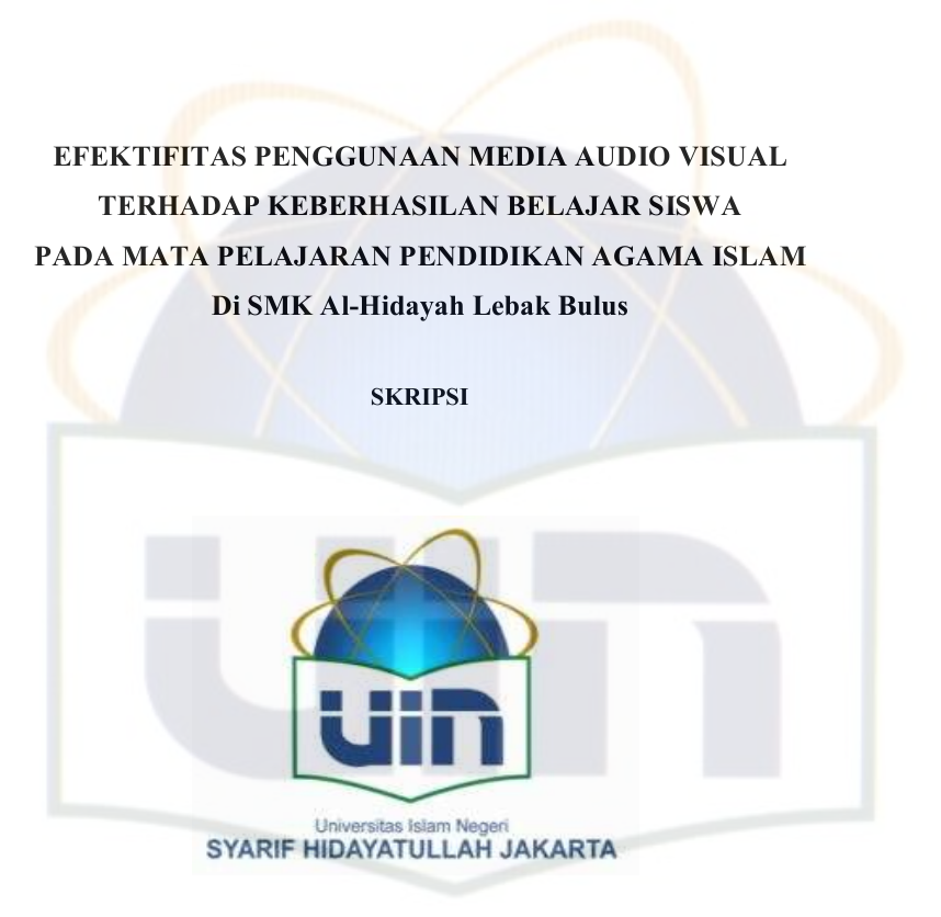 EFEKTIFITAS PENGGUNAAN MEDIA AUDIO VISUAL TERHADAP KEBERHASILAN BELAJAR SISWA PADA MATA PELAJARAN PENDIDIKAN AGAMA ISLAM Di SMK Al-Hidayah Lebak Bulus SKRIPSI Disusun Oleh: Edi Junaedi Abdilah 106011000083 JURUSAN PENDIDIKAN AGAMA ISLAM FAKULTAS ILMU TARBIYAH DAN KEGURUAN UNIVERSITAS ISLAM NEGERI SYARIF HIDAYATULLAH JAKARTA 2011 ABSTRAK Efektifitas Penggunaan Media Audio Visual Terhadap Keberhasilan Belajar Siswa Pada Mata Pelajaran Pendidikan Agama Islam Di SMK Al-Hidayah Lebak Bulus Media pembelajaran merupakan hal yang sangat penting untuk diperhatikan, karena media pembelajaran sangat mempengaruhi tingkat pemaham siswa terhadap materi yang disampaikan di kelas. Media pembelajaran merupakan sarana untuk menyampaikan informasi dari pengirim pesan kepada penerima pesan, dengan harapan proses komunikasi pembelajaran dapat berjalan dengan efektif dan pesan yang ingin disampaikan dapat diterima secara utuh oleh siswa sehingga pada akhirnya akan meningkatkan kualitas pembelajaran. Penggunaan media pembelajaran yang tepat akan mempermudah siswa dalam menerima dan memahami pelajaran, sehingga hal ini diprediksikan dapat mempengaruhi hasil belajar siswa. Oleh karena itu penelitian ini bertujuan untuk menjelaskan bagaimana efektifitas penggunaan media audio visual terhadap keberhasilan belajar siswa pada mata pelajaran Pendidikan Agama Islam. Penelitian ini dilakukan pada siswa kelas X AP2 SMK Al-Hidayah Lebak Bulus. Metode yang digunakan dalam penelitian ini adalah metode deskriptif kualitatif, yaitu metode penelitian yang berusaha membuat deskripsi atau gambaran dari fenomena yang diselidiki dengan cara membuat kesimpulan berdasarkan data-data yang diperoleh selama penelitian. Sedangkan teknik penelitian yang penulis gunakan yaitu: observasi, wawancara, uji materi pelajaran berbentuk pilihan ganda serta dokumentasi. Adapun hasil yang diperoleh dari penelitian yang penulis lakukan adalah penggunaan media audio visual mempunyai tingkat efektifitas yang signifikan terhadap keberhasilan belajar siswa. Hal ini diketahui dari hasil jawaban siswa kelas X AP2 sebagai kelas eksperimen dengan nilai rata-rata 77,90. Dan hasil wawancara menunjukkan bahwa siswa menyukai dan termotivasi ketika proses pembelajaran menggunakan media audio visual berbentuk VCD, karena menurut hasil wawancara siswa menyebutkan bahwa media VCD dapat mempermudah mereka dalam memahami pelajaran. ii KATA PENGANTAR Segala puji dan syukur penulis panjatkan kepada Allah SWT yang telah melimpahkan karunia, rahmat, hidayah, inayah serta kasih sayang yang berlimpah dan tiada batas kepada penulis sehingga skripsi ini dapat tersusun dan terselesaikan. Shalawat dan salam senantiasa terlimpah curahkan kepada Nabi besar Muhammad SAW, yang telah menjadi sinar terang dalam perjalanan hidup umat manusia, semoga kita semua mendapatkan syafaatnya kelak di hari akhir. Amin. Penyusunan skripsi ini merupakan kajian singkat tentang “ Efektifitas Penggunaan Media Audio Visual Terhadap Keberhasilan Belajar Siswa Pada Mata Pelajaran Pendidikan Agama Islam di SMK Al-Hidayah Lebak Bulus”. Penulis menyadari bahwa dalam penyusunan skripsi ini ada pihak-pihak yang telah berkontribusi memberikan bantuan, pengarahan, inspirasi serta do’a dan dukungannya sehingga skripsi ini dapat terselesaikan dengan baik. Dengan segala kerendahan hati pada kesempatan ini penulis mengucapkan terima kasih kepada : 1. Bapak Prof. Dede Rosyada, M.A, Dekan Fakultas Ilmu Tarbiyah dan Keguruan Univevrsitas Islam Negeri (UIN) Syarif Hidayatullah Jakarta. 2. Bapak Bahrissalim, M.Ag, Ketua Jurusan Pendidikan Agama Islam Fakultas Ilmu Tarbiyah dan Keguruan UIN Syarif Hidayatullah Jakarta. iii 3. Bapak Drs. Sapiuddin Shidiq, M.Ag, Sekretaris Jurusan Pendidikan Agama Islam Fakultas Ilmu Tarbiyah dan Keguruan UIN Syarif Hidayatullah Jakarta 4. Bapak Dr. Abdul Majid Khon, M.Ag, selaku dosen pembimbing akademik, yang telah memberikan bimbingan, motivasi dan nasehat kepada penulis selama perkuliahan. 5. Bapak Yudhi Munadi, M.Ag, selaku dosen pembimbing skripsi yang telah meluangkan banyak waktu, tenaga dan pikiran untuk membimbing dan mengarahkan penulis dalam penyusunan skripsi ini. 6. Bapak dan ibu dosen jurusan Pendidikan Agama Islam yang telah mentransfer ilmu selama masa perkuliahan 7. Segenap staf Perpustakaan Utama dan Perpustakaan Tarbiyah Universitas Islam Negeri Syarif Hidayatullah Jakarta, yang telah memberikan bantuan berupa referensi buku-buku dan bahan penelitian bagi penulis 8. Kepala sekolah, para guru dan staf SMK Al-Hidayah Lebak Bulus yang telah memberikan ijin penelitian dan kerjasama yang baik dalam memberikan data-data yang diperlukan penulis dalam penelitian ini. 9. Kepada almarhum ayahanda tercinta, penulis mengucapkan terimakasih yang sedalam-dalamnya, semoga diampuni segala dosanya. Dan kepada ibunda tercinta yang senantiasa mengasuh, membimbing, membiayai, memotivasi serta menjadi sumber semangat bagi penulis dalam menjalani kehidupan ini. iv 10. Ade Nurfajriyah, yang senantiasa memberikan motivasi, dan dukungan kepada penulis baik berupa moril, tenaga, maupun pemikiran. 11. Sahabat dan teman-teman seperjuangan di Jurusan Pendidikan Agama Islam, Ahmad Sidrotul Muntaha, Kak Abdilah, Mahfud Fauzi, dan teman- teman PAI B Angkatan 2006 yang tidak bisa disebutkan satu-persatu, terimakasih atas kebersamaan dan persaudaraan selama ini serta motivasi dan semangat untuk segera meyelesaikan skripsi ini. 12. Teman-teman kosan, Ridwan, Fauzi, Teguh, Akbar, Mansur dan yang lainnya, yang selalu mengobarkan api semangat dalam keputusasaan penulis, terimakasih telah mengizinkan penulis untuk menjadikan kosannya sebagai tempat singgah yang nyaman bagi penulis. 13. Terimakasih juga kepada semua pihak yang turut serta membantu dalam kelancaran penyusunan skipsi ini. Penyusunan skripsi ini tidak lepas dari bantuan semua pihak didalamnya, penulis hanya mempu mengucapkan terimakasih yang sebesar-besarnya, semoga kebaikannya mendapatkan balasan yang lebih baik lagi dari Allah SWT. M