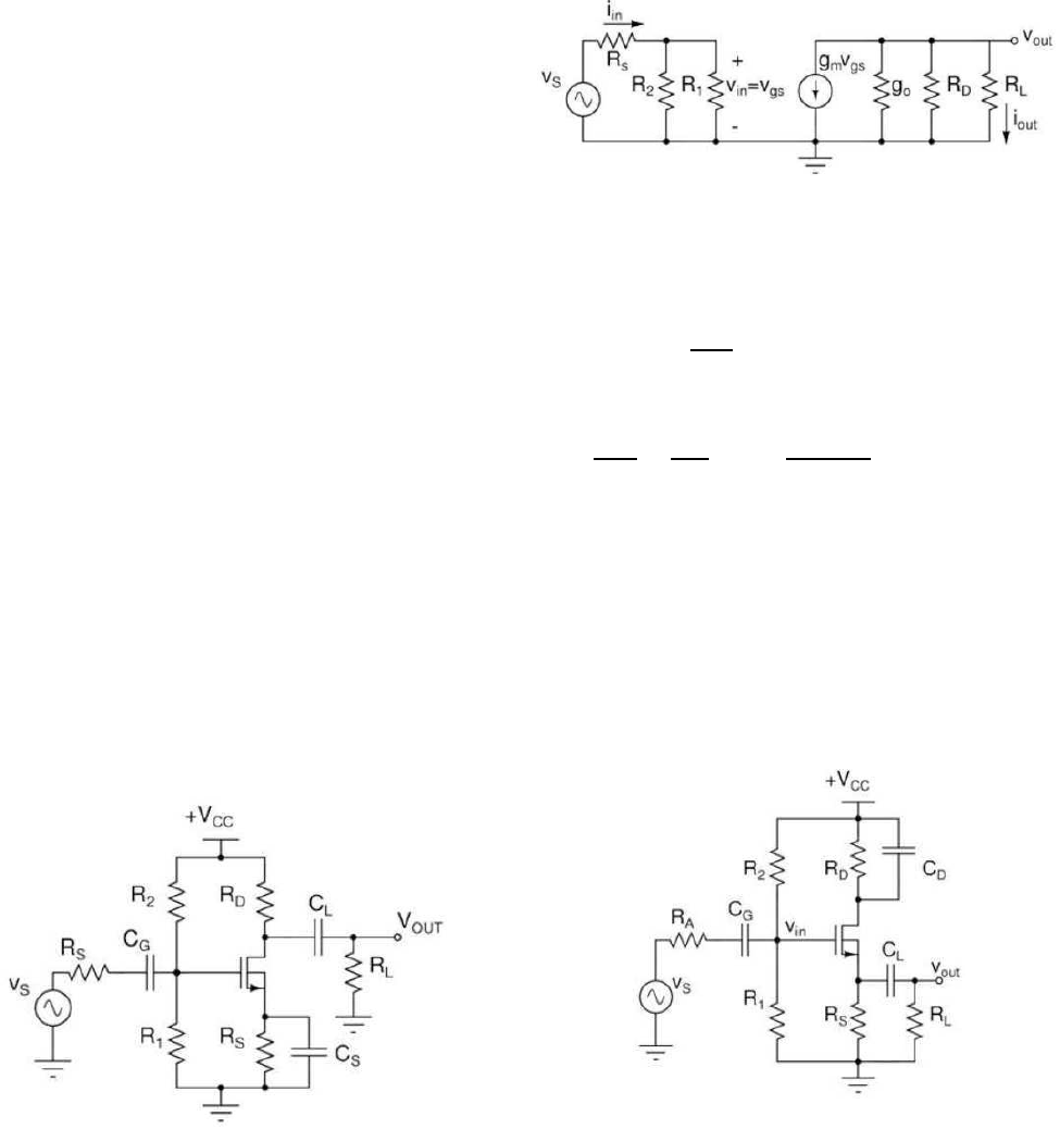 UNIVERSIDAD NACIONAL DE COLOMBIA, BOGOTÁ D.C. 1 Práctica 8: Transistor MOSFET en circuitos amplificadores David Santiago Daza Quirogadsdazaq@unal.edu.co, Fabian Hernan Villegas Manrique fahvillegasm@unal.edu.co,Nicolas Moreno Francojnmorenofr@unal.edu.co Abstract—Signal amplifiers are the basic applications we have for a MOSFET transistor, thus the need to analyze and understand how it works as they are critical in more complex structures. A study conducted in this laboratory report. Index Terms—MOSFET, Zone of saturation, Amplifier, Com- mon source, Common drain, Source follower. I. INTRODUCCIÓN EN el presente informe se muestran los resultados obtenidos durante la práctica de laboratorio en la cual se realizó la verificación del comportamiento de algunos tipos de amplificadores, y el análisis de los mismos, también se comprueba el comportamiento de una fuente de corriente de espejo sometido a distintas cargas. En concreto se estudiará el amplificador de fuente común y de drenaje común, así como la resultante de su combinación en serie. II. MARCO TEÓRICO Entre los tipos de amplificadores básicos que tenemos para dispositivos MOSFET, tenemos el fuente común y el drenaje común o seguidor de fuente. A. Amplificador de Fuente Común Figura 2.1.1. Amplificador fuente común [1]. Su modelo de pequeña señal puede verse en la figura 2.1.2. Figura 2.1.2. Modelo de pequeña señal amplificador fuente común [2]. De donde tenemos las relaciones: Av = vout vin = −gm(go−1||RD||RL) Ai = Iout Iin = Zin RL Av = − (R1||R2) RL gm(go−1||RD||RL) Para esta configuración se obtienen valores altos de ganancia (mayor a 1) para la señal de entrada, ya sea de tensión o de corriente. B. Amplificador de Drenaje Común o Seguidor de Voltaje El esquema general puede verse en la figura 2.2.1. Figura 2.2.1. Amplificador seguidor de voltaje [3]. El correspondiente modelo de pequeña señal puede verse en la figura 2.2.2. UNIVERSIDAD NACIONAL DE COLOMBIA, BOGOTÁ D.C. 2 Figura 2.2.2. Modelo de pequeña señal amplificador seguidor de voltaje [4]. III. PROCEDIMIENTO De acuerdo a cálculos previos, para la fuente de corriente del esquema del circuito 1, se usó una resistencia de referencia de 6.12 kΩ, un valor para VDD = 10V usando del chip CD4007CN únicamente las compuertas NMOS. Variando RL desde 0 hasta 10 kΩ, se obtuvo la siguiente tabla de datos. TABLA I IQ2 VS RL CIRCUITO 1 RL[kΩ] IQ1[mA] IQ2[mA] 10 1.05 0.872 9 1.05 0.934 8 1.05 0.988 7 1.05 1.02 6 1.05 1.06 5 1.05 1.1 4 1.05 1.14 3 1.05 1.18 2 1.05 1.23 1 1.05 1.28 0.1 1.05 1.34 Tabla 3.1. Toma de datos. Y la correspondiente gráfica. Figura 3.1. Variación de la corriente respecto a RL en el circuito 1. Figura 3.2. Circuito 1, Fuente de corriente espejo [5]. Posteriormente se realizó el montaje del circuito 2 con valores para R1 = 12.5MΩ, R2 = 3.7MΩ, RD = 10.2 kΩ, RS = 600Ω, C1= C2 = CS = 1µF, RL = 10 kΩ, Vipp = 200 mV a una frecuencia de 10 kHz y VDD = 20 V. Figura 3.3. Circuito 2, Amplificador de fuente común [6]. Bajo los valores iniciales encontramos una salida V0pp = 1 V, obteniendo una ganancia aproximada Av = 5. Luego variamos la frecuencia para la señal de entrada con lo cual obtuvimos la siguiente tabla. TABLA II AV VARIANDO FRECUENCIA DE VI f[KHz] 0,1 1 10 100 500 1000 V0[mVp] 321.5 479 500 500 500 489,03 AV [ V V ] 3,21 4,79 5 5 5 4,93 Tabla 3.2. Toma de datos. Figura 3.4. Circuito 2, Amplificación de fuente común. UNIVERSIDAD NACIONAL DE COLOMBIA, BOGOTÁ D.C. 3 Figura 3.5. Transferencia de tensiones. Inmediatamente se procedió a hacer el montaje del circuito 3 mostrado en la figura 8, con los valores para los componentes iguales a los del circuito 2 de fuente común. Figura 3.6. Circuito 3, Amplificador de fuente común Degenerado [7]. Figura 3.7. Circuito 3, Amplificación de fuente común degenerado. Figura 3.8. Transferencia de tensiones. Los valores medidos de este circuito sonV0pp = 787 mV con una ganancia de Av = 3.93 V/V. Igual que en el caso anterior, variamos la frecuencia de la señal de entrada, cuyos resultados están consignados en la siguiente tabla. TABLA III AV VARIANDO FRECUENCIA DE VI f[KHz] 0,1 1 10 100 500 1000 V0[mV] 391,02 395 392.55 372.74 329,65 329,45 AV [ V V ] 3.91 3,95 3,92 3,72 3,21 3,21 Tabla 3.3. Toma de datos. Finalmente para el montaje del circuito 4 con valores de C1 = C2 = C3 = 1µF, R1 =1kΩ, RD = RS = RL = 220Ω, R2 = 3 kΩ, VDD = 20 V y Vipp = 400 mV a una frecuencia de 10 kHz se obtuvo una salidaV0pp = 162 mV con una ganancia de Av = 0,405 V/V. Figura 3.9. Circuito 4, Amplificador de Drenaje común [8]. Variando la frecuencia en la señal de entrada obtenemos los valores de la siguiente tabla. TABLA IV AV VARIANDO FRECUENCIA DE VI f[KHz] 0,1 1 10 100 500 1000 V0[mVp] 6.7 70.9 79.9 81 81 81 AV [ V V ] 0,033 0,355 0,399 0,405 0,405 0,405 Tabla 3.4. Toma de datos. Figura 3.10. Circuito 4, Amplificación drenaje común. UNIVERSIDAD NACIONAL DE COLOMBIA, BOGOTÁ D.C. 4 Figura 3.11. Transferencia de tensiones. Finalmente, uniendo los circuitos de fuente común y drenaje común como lo ilustra el esquema del circuito 5, y con los valores para los elementos ya utilizados, tenemosV0pp= 70 mV con una ganancia de Av = 0,35 V/V. Figura 3.12. Circuito 5, Amplificación en cascada. IV. ANÁLISIS El circuito 1, la fuente de corriente, al variar RL como lo muestra la TABLA 3.1 y la gráfica correspondiente, se deduce que dicha corriente disminuye para valores superiores para RL a los 8 kΩ, alejándose del valor ideal de 1 mA. Por tanto RL no debe superar los 8 kΩ. En el circuito 2 tenemos Zi = R1 || R2, Zi = 2.85 MΩ, Zo = RL || RD, Zo = 5.05 kΩ. La tabla de variación de frecuencias de entrada para el circuito 3.2 devela que no incide en la ganancia de respuesta del circuito ya que se mantiene en valores muy estables y cercanos entre sí. Para el circuito 3 tenemos Zi = R1 || R2, Zi = 2,85 MΩ, Zo = RL || RD, Zo = 5.05 kΩ. Al variar la frecuencia, de forma semejante al cas