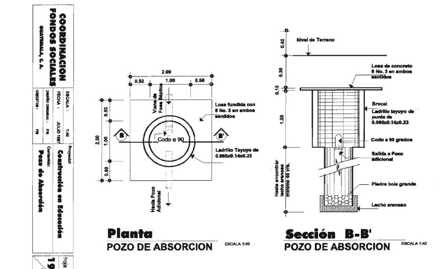 En que momento se utiliza un poso de absorción: Los pozos de absorción se usan ampliamente en el mundo desde hace mucho tiempo, especialmente para evacuar las aguas de lluvia. También suelen usarse los pozos de absorción para evacuar hacia el suelo las aguas de lluvia que caen en los techos y evitar que los terrenos alrededor de los edificios se saturen de agua después de cada lluvia Drenaje francés Un drenaje francés es básicamente una zanja en el piso que contiene una tubería perforada sobre una cama de graba, el drenaje francés también es usado en los muros de contención para aliviar la presión del agua subterránea image1.png image2.jpg