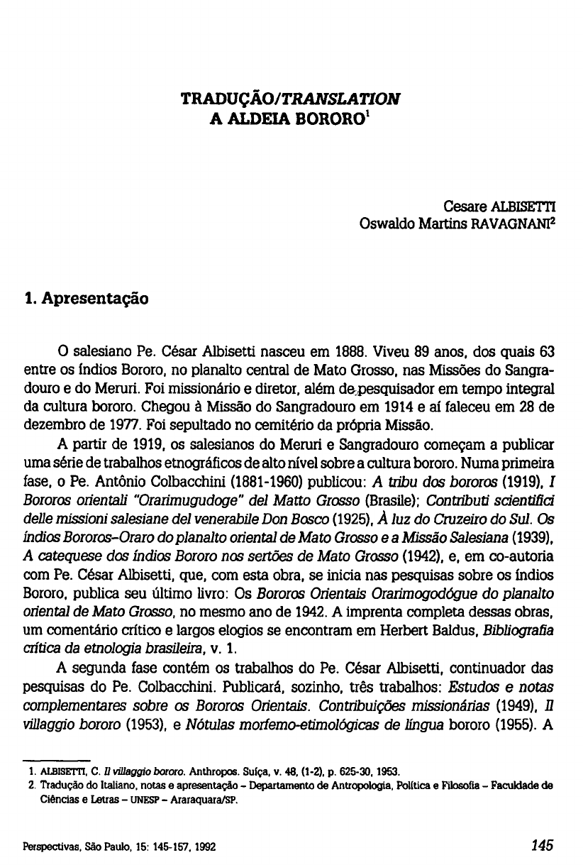 TRADUÇÃ0/TRANSLATI0N A ALDEIA BORORO 1 Cesare ALBISETTI Oswaldo Martins RAVAGNANí2 1. Apresentação O salesiano Pe. César Albisetti nasceu em 1888. Viveu 89 anos. dos quais 63 entre os índios Bororo, no planalto central de Mato Grosso, nas Missões do Sangra- douro e do Meruri. Foi missionário e diretor, além depesquisador em tempo integral da cultura bororo. Chegou à Missão do Sangradouro em 1914 e aí faleceu em 28 de dezembro de 1977. Foi sepultado no cemitério da própria Missão. A partir de 1919, os salesianos do Meruri e Sangradouro começam a publicar uma série de trabalhos etnográficos de alto nível sobre a cultura bororo. Numa primeira fase, o Pe. Antônio Colbacchini (1881-1960) publicou: A tribu dos bororos (1919), I Bororos orientali "Orarimugudoge" del Matto Grosso (Brasile); Contributi scientifici delle missioni salesiane del venerabile Don Bosco (1925), À luz do Cruzeiro do Sul. Os índios Bororos-Oraro do planalto oriental de Mato Grosso e a Missão Salesiana (1939), A catequese dos índios Bororo nos sertões de Mato Grosso (1942), e, em co-autoria com Pe. César Albisetti, que, com esta obra, se inicia nas pesquisas sobre os índios Bororo, publica seu último livro: Os Bororos Orientais Orarimogodógue do planalto oriental de Mato Grosso, no mesmo ano de 1942. A imprenta completa dessas obras, um comentário crítico e largos elogios se encontram em Herbert Baldus, Bibliografía crítica da etnologia brasileira, v. 1. A segunda fase contém os trabalhos do Pe. César Albisetti, continuador das pesquisas do Pe. Colbacchini. Publicará, sozinho, três trabalhos: Estudos e notas complementares sobre os Bororos Orientais. Contribuições missionárias (1949), II villaggio bororo (1953), e Nótulas morfemo-etimológicas de língua bororo (1955). A 1. ALBISETTI, C. Il villaggio bororo. Anthropos. Suíça, v. 48, (1-2). p. 625-30.1953. 2. Tradução do Italiano, notas e apresentação - Departamento de Antropologia, Política e Filosofia - Faculdade de Ciências e Letras - UNESP - Araraquara/SP. partir daqui, já com algumas décadas de vida entre os índios Bororo, e como o maior conhecedor dessa cultura, parte para o vôo mais alto dos salesianos em pesquisa científica. Aliado ao Pe. Angelo Jayme Venturelli, iniciarão u m imenso projeto: A Enciclopédia bororo, planejada para quatro densos volumes. Começa assim a terceira fase das publicações salesianas sobre os Bororo. Enciclopédia bororo: vocábulos e etnografía (1962). Sobre este I a volume Herbert Baldus, op. cit., p. 47 escreveu: "Obra monumental que, pela abundância das informa ções nela contidas e pela exatidão de sua apresentação, honra os salesianos, seus autores, e os índios que com eles colaboraram". Também Lévi-Strauss tecerá comen tários elogiosos em Mythologiques: Le cru et le cuit. E m 1969, aparece Enciclopédia bororo. Volume II. Lendas e antropônimos, elogiado por todos os antropólogos que comentaram a obra. Finalmente, em 1976, saiu Enciclopédia bororo. Volume III*. Parte I: Textos dos cantos de caça e pesca. A apresentação foi de Lévi-Strauss. No ano seguinte faleceu o pesquisador Pe. César Albisetti . Muito provavelmente Pe. Angelo Jayme Venturelli continuará a publicar as outras partes do 3 a volume e o 4 a volume prometidos da Enciclopédia. Como se vê, os trabalhos dos salesianos a respeito dos Bororo mantêm uma continuidade de mais de meio século. Os autores foram com o tempo se especializando no conhecimento da cultura, na coleta e na análise do material empírico. Os trabalhos publicados foram paulatinamente se aprofundando nos mais variados aspectos da cultura indígena. Deste modo, se explica a presente tradução de um trabalho publicado em 1953. E m todo o continuun, era o único em língua estrangeira. E seu próprio valor intrínseco o justifica. Sobre ele escreveu Herbert Baldus na Bibliografía crítica da etnologia brasileira, vol. n, p. 46: "Esta descrição da aldeia bororo é, antes de tudo, uma importante contribuição à etno-sociologia". Com o tempo II villaggio bororo se tomou um clássico da etnologia brasileira. 2. Tradução A descrição da aldeia bororo Bóe éua está tão estreitamente ligada à divisão e à subdivisão da tribo em metades e famílias, que falar de uma coisa é falar também da outra. Esta instituição é antiga, anterior ao dilúvio da lenda bororo. Diz a fábula que um tal Meriri-ppóro* da família dos Páivoe e por isso da metade Tugarégue, foi a causa de uma inundação geral porque flechou o espírito Jaccoméa. 3. Nas palavras bororo segui a ortografia e a pronúncia italiana, com estas exceções: 1) ja, je, ji, )o, ju, se pronunciam respectivamente: già, ge, gi giò, giú. 2) xa. xe, xi , xo, xu, se pronunciam respectivamente: cià, ce, ci, ciò, ciü 3) gue, gui, se pronunciam respectivamente: ghe, ghi. 4) que, qui, se pronunciam respectivamente: che, chi. 5) O acento agudo indica apenas a sílaba tônica e não a pronúncia fechada da vogai. Ninguém se salvou, exceto Géringui-ottogivu que, agitando um tição aceso, avançou o cume de um morro coberto pelas águas. Dali jogou no elemento líquido uma pedra abrasada no fogo alimentado pelo seu tição e viu que aquele começou a diminuir. Jogou outras com resultado tão prodigioso que em breve a terra reemergiu. Descido do morro se dirigiu ao lugar da aldeia: tudo estava deserto. Gritou, assoviou, mas ninguém respondeu: estava só. Mas eis que sobre a terra lamacenta apareceram pegadas de u m cervo. Chamou-o com um assovio e, para grande alegria sua, ele lhe respondeu e se lhe apresentou pouco depois. Era uma fêmea. Com ela se uniu e teve filhos e filhas. Os primeiros nascidos tinham algum vestígio hereditário da mãe: os últimos eram já bororo perfeitos. Então Geríngui-ottogívu os dividiu e subdividiu, como antes do dilúvio, em Iugarégue, Exxeráe e em clã, segundo o gráfico e esquema anexos. Os Chefes Através das lendas sabemos q