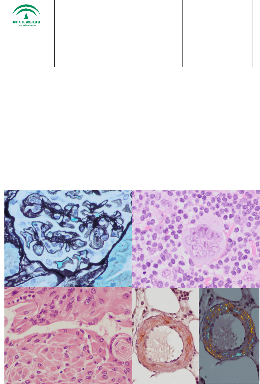 <p>GUIA O ITINERARIO FORMATIVO</p><p>DE RESIDENTES</p><p>Anexo 7.</p><p>EDICIÓN : 2 FECHA ELABORACIÓN:</p><p>10/05/2016</p><p>GUÍA FORMATIVA DE RESIDENTES DE ANATOMÍA</p><p>PATOLÓGICA</p><p>GUIA O ITINERARIO FORMATIVO</p><p>DE RESIDENTES</p><p>Anexo 7</p><p>EDICIÓN : 2 FECHA ELABORACIÓN:</p><p>01/10/2018</p><p>2</p><p>Manual del residente de Anatomía Patológica</p><p>Unidad Docente de Anatomía Patológica</p><p>Jefatura de Unidad Docente: Mª Isabel Hierro Martín</p><p>Tutores/as: Juan Mª García Hirschfeld, Denis Gerardo Estrada,</p><p>Estefanía Garrido Hijano y Elisa Prieto Sánchez</p><p>Centro asistencial: Hospital Regional Universitario</p><p>de Málaga</p><p>GUIA O ITINERARIO FORMATIVO</p><p>DE RESIDENTES</p><p>Anexo 7</p><p>EDICIÓN : 2 FECHA ELABORACIÓN:</p><p>01/10/2018</p><p>3</p><p>Manual del residente de Anatomía Patológica</p><p>ÍNDICE</p><p>Pág.</p><p>1. BIENVENIDA 4</p><p>2. Unidad Docente de Anatomía Patológica 4</p><p>2.1. Estructura física 5</p><p>2.2. Organización jerárquica y funcional 7</p><p>2.3. Cartera de Servicios 9</p><p>2.4. Actividad asistencial 11</p><p>3. PROGRAMA FORMATIVO OFICIAL DEL ESPECIALISTA EN</p><p>ANATOMÍA PATOLÓGICA</p><p>12</p><p>4. GUÍA O ITINERARIO FORMATIVO DEL RESIDENTE DE ANATOMÍA</p><p>PATOLÓGICA</p><p>12</p><p>4.1. Competencias generales a adquirir durante la formación 13</p><p>4.2. Plan de rotaciones 13</p><p>4.3. Competencias específicas por rotación</p><p>4.4. Rotaciones Externas recomendadas</p><p>15</p><p>5. GUARDIAS: Protocolo de supervisión de la unidad 23</p><p>6. SESIONES 23</p><p>7. OBJETIVOS DE INVESTIGACIÓN/TRABAJOS DE CAMPO 24</p><p>8. EVALUACIÓN 24</p><p>8.1. FORMATIVA: HOJA DE ENTREVISTA ESTRUCTURADA TUTOR-</p><p>RESIDENTE</p><p>24</p><p>8.2. HOJAS DE EVALUACIÓN POR ROTACIÓN 25</p><p>8.3. HOJA DE EVALUACIÓN FINAL 25</p><p>9. BIBLIOGRAFIA RECOMENDADA 25</p><p>10. PLANTILLA PLAN INDIVIDUALIZADO DE FORMACIÓN 27</p><p>GUIA O ITINERARIO FORMATIVO</p><p>DE RESIDENTES</p><p>Anexo 7</p><p>EDICIÓN : 2 FECHA ELABORACIÓN:</p><p>01/10/2018</p><p>4</p><p>Manual del residente de Anatomía Patológica</p><p>1. BIENVENIDA</p><p>Bienvenidos en nombre de todos los que formamos el Servicio de Anatomía</p><p>Patológica del Hospital Regional Universitario de Málaga. Nos alegra que hayáis</p><p>escogido Anatomía Patológica como especialidad y que hayáis decidido</p><p>aprenderla en nuestro hospital. Podéis contar con nosotros para resolver cualquier</p><p>duda que se os pueda presentar a lo largo de este periodo de formación.</p><p>A continuación, vamos a intentar exponer una serie de aspectos que creemos</p><p>necesarios para la integración dentro del funcionamiento del Hospital y que por lo</p><p>tanto conviene que leáis.</p><p>2. LA UNIDAD DE ANATOMÍA PATOLÓGICA</p><p>El Servicio de Anatomía Patológica del Hospital Regional Universitario de Málaga</p><p>se adapta en su organización a la del Complejo Hospitalario, un centro de tercer</p><p>nivel del Servicio Andaluz de Salud. El Hospital regional esta constituido por cuatro</p><p>hospitales y un centro de especialidades distribuidos en distintos puntos de</p><p>Málaga capital: el Hospital General (HG), que alberga las especialidades médicas</p><p>y quirúrgicas más complejas, el Hospital Materno-Infantil (HM-I) que está dedicado</p><p>exclusivamente a la atención de mujeres, niños y jóvenes, el Hospital Civil donde</p><p>se localizan diversas especialidades quirúrgicas, junto con el Hospital Ciudad</p><p>Jardín y por último, el Centro de Alta Resolución de Especialidades (C.A.R.E.).</p><p>Inició su actividad en el año 1972 en el Pabellón A del Hospital General y fue en el</p><p>año 1977 cuando comenzó a funcionar la sección de microscopía electrónica. En</p><p>el año 1982 se fundó la parte del servicio ubicada en el Hospital Materno Infantil,</p><p>para cubrir las necesidades de este centro, y a partir de 1989 también las del</p><p>GUIA O ITINERARIO FORMATIVO</p><p>DE RESIDENTES</p><p>Anexo 7</p><p>EDICIÓN : 2 FECHA ELABORACIÓN:</p><p>01/10/2018</p><p>5</p><p>Manual del residente de Anatomía Patológica</p><p>Hospital Civil. El laboratorio de Patología molecular lleva funcionando desde 1998,</p><p>ampliando día a día su cartera de servicios y respondiendo a la creciente</p><p>demanda de estudios moleculares por parte de Oncología para el tratamiento</p><p>personalizado de los pacientes.</p><p>2.1. Estructura Física</p><p>El Servicio de Anatomía Patológica del Hospital Regional se encuentra dividido en</p><p>dos secciones: la principal, localizada en la planta baja del pabellón A del Hospital</p><p>General, cubre la demanda diagnóstica del Hospital General, el Hospital Civil, el</p><p>CARE y los Centros de Salud del Área Sanitaria. La sección localizada en el</p><p>Hospital Materno-Infantil realiza los estudios diagnósticos solicitados por los</p><p>Servicios de Ginecología, Pediatría y Cirugía Pediátrica.</p><p>La división del Servicio en dos hospitales obliga a la existencia de dobles</p><p>instalaciones e infraestructura de procesado de muestras, existiendo dos</p><p>laboratorios de histología, dos secretarías, dos salas de residentes, dos salas de</p><p>autopsias, etc.</p><p>Dispone de ocho despachos de facultativos especialistas, dos salas de trabajo de</p><p>residentes, una sala de sesiones o aula y dos secretarías. Se dispone de</p><p>laboratorios de histología tanto en el HG como en el HM-I con capacidad para</p><p>procesar, cortar y teñir las muestras diagnósticas, incluyendo en ambas secciones</p><p>de histoquímica clásica y enzimática, así como de inmunohistoquímica</p><p>automatizada. En el HG se cuenta además con una sección específica de</p><p>inmunofluorescencia.</p><p>Cada uno de los hospitales está dotado de una sala de autopsias para cubrir sus</p><p>necesidades. En el HG contamos además con un Laboratorio de Patología</p><p>Molecular y un Laboratorio de Citolog