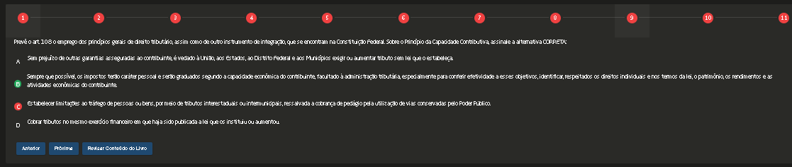 <p>1 2 3 4 5 6 7 9 10 11 108 emprego dos principios gerais de assim como de instrumento de que se encontram na Constituição Federal Sobre Principio da Capadidade Contributiva assinale a CORRETA Sem prejuizo de outras garantias asseguradas a contribuinte exigir aumentar tributo sem que Que os impostos terão pessoa graduados segundo económica do facultado administração tributária para efetividade objetivos, individuals rendimentos e B atividades do contribuinte ao pessoas to bens por tributos ressalvada a cobranca utilização Pode Publico D tributos nomesmo exercido financeiro sido publicada ale aumentou de</p>