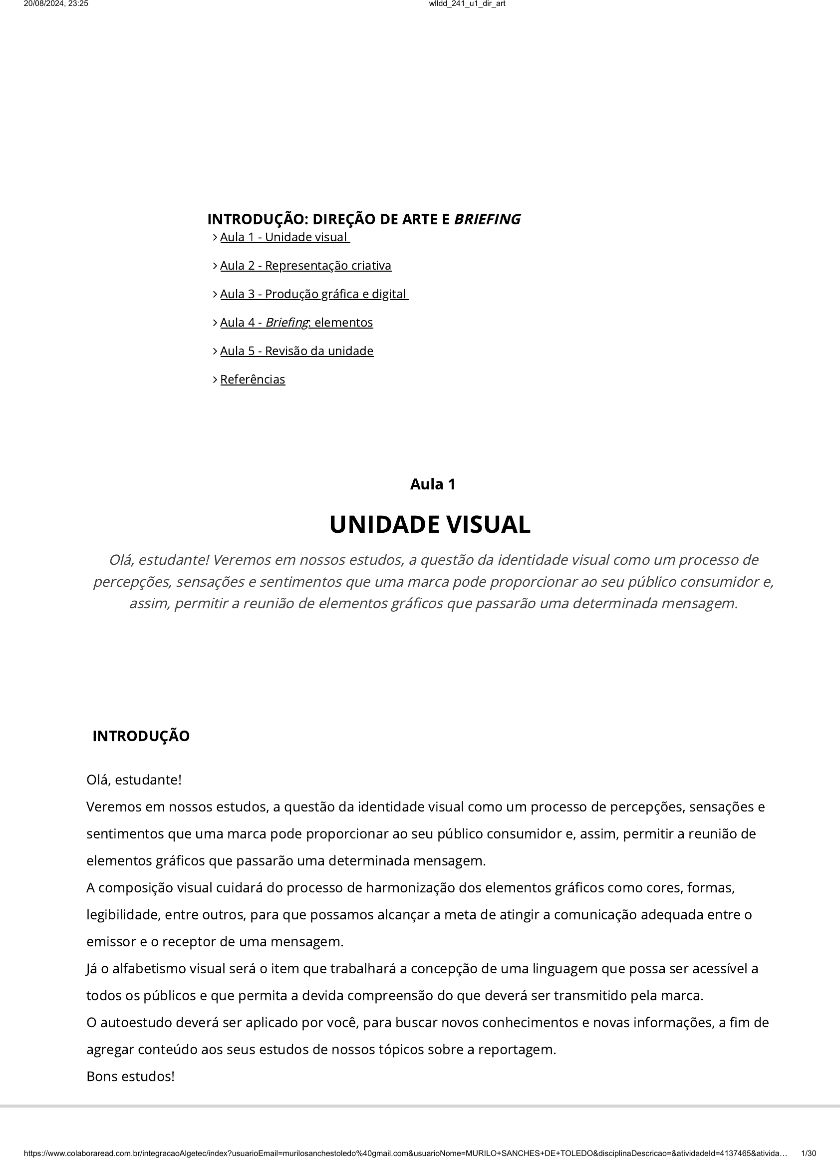 <p>INTRODUÇÃO</p><p>Olá, estudante!</p><p>Veremos em nossos estudos, a questão da identidade visual como um processo de percepções, sensações e</p><p>sentimentos que uma marca pode proporcionar ao seu público consumidor e, assim, permitir a reunião de</p><p>elementos grá�cos que passarão uma determinada mensagem.</p><p>A composição visual cuidará do processo de harmonização dos elementos grá�cos como cores, formas,</p><p>legibilidade, entre outros, para que possamos alcançar a meta de atingir a comunicação adequada entre o</p><p>emissor e o receptor de uma mensagem.</p><p>Já o alfabetismo visual será o item que trabalhará a concepção de uma linguagem que possa ser acessível a</p><p>todos os públicos e que permita a devida compreensão do que deverá ser transmitido pela marca.</p><p>O autoestudo deverá ser aplicado por você, para buscar novos conhecimentos e novas informações, a �m de</p><p>agregar conteúdo aos seus estudos de nossos tópicos sobre a reportagem.</p><p>Bons estudos!</p><p>Aula 1</p><p>UNIDADE VISUAL</p><p>Olá, estudante! Veremos em nossos estudos, a questão da identidade visual como um processo de</p><p>percepções, sensações e sentimentos que uma marca pode proporcionar ao seu público consumidor e,</p><p>assim, permitir a reunião de elementos grá�cos que passarão uma determinada mensagem.</p><p>INTRODUÇÃO: DIREÇÃO DE ARTE E BRIEFING</p><p> Aula 1 - Unidade visual</p><p> Aula 2 - Representação criativa</p><p> Aula 3 - Produção grá�ca e digital</p><p> Aula 4 - Brie�ng: elementos</p><p> Aula 5 - Revisão da unidade</p><p> Referências</p><p>20/08/2024, 23:25 wlldd_241_u1_dir_art</p><p>https://www.colaboraread.com.br/integracaoAlgetec/index?usuarioEmail=murilosanchestoledo%40gmail.com&usuarioNome=MURILO+SANCHES+DE+TOLEDO&disciplinaDescricao=&atividadeId=4137465&ativida… 1/30</p><p>A IDENTIFICAÇÃO VISUAL DA MARCA</p><p>Identidade visual</p><p>Em uma conceituação sobre a identidade visual, você poderá observar que ela representa os elementos que</p><p>indicarão e comunicarão a um determinado público: ideias, sentimentos, sensações, missão, visão, valores de</p><p>uma empresa, de seus produtos ou serviços.</p><p>O autor Gilberto Strunck (2003) apresenta uma visão da identidade visual para o nosso universo interno, no</p><p>qual o processamento de informações está cada vez mais voltado para a questão das imagens.</p><p>A identidade visual também é o conjunto de itens visuais e grá�cos que comunicarão uma determinada</p><p>mensagem por meio das cores e formas integradas ao produto ou serviço, indicando sua personalidade e o</p><p>mercado de atuação.</p><p>Sendo assim, a identidade visual trabalhará os elementos que caracterizam a divulgação e permitirá a �xação</p><p>da marca na mente do consumidor. Ao realizarmos o trabalho adequadamente em criar uma identi�cação</p><p>positiva, ela será lembrada pelas pessoas no momento de suas compras, por exemplo.</p><p>Como podemos observar na Figura 1, que é uma simulação de uma marca de refrigerante conhecida e que</p><p>será rapidamente identi�cada por você.</p><p>Figura 1 | Exemplo de marca conhecida do público</p><p>Fonte: Pixabay.</p><p>É preciso veri�car quais são as características que deverão ser personalizadas para criar uma ligação entre o</p><p>produto e o consumidor, permitindo que a marca tenha uma identidade única em um grupo de itens</p><p>similares.</p><p>Tudo que vemos nos comunica alguma coisa. Cores, formas, texturas. Um enorme e</p><p>complexo universo de pequenos detalhes se combina para trazermos informações</p><p>processadas instantaneamente por nossos cérebros. Em se tratando de comunicação,</p><p>somos cada vez mais uma civilização visual. (STRUNK, 2003, p. 37)</p><p>20/08/2024, 23:25 wlldd_241_u1_dir_art</p><p>https://www.colaboraread.com.br/integracaoAlgetec/index?usuarioEmail=murilosanchestoledo%40gmail.com&usuarioNome=MURILO+SANCHES+DE+TOLEDO&disciplinaDescricao=&atividadeId=4137465&ativida… 2/30</p><p>Composição visual</p><p>A composição visual representa uma organização de elementos que indicarão um vocabulário, uma maneira</p><p>de comunicar as intenções da marca pela harmonização de cores, formas, estilos, tipogra�a, legibilidade,</p><p>entre outros itens que comporão uma mensagem para um determinado público.</p><p>Essa harmonização de elementos grá�cos será essencial para conceituar a mensagem a ser transmitida na</p><p>composição visual, emitida por seu criador e modi�cada pelo observador – o receptor absorverá o conteúdo,</p><p>de acordo com suas experiências e sua perspectiva individual.</p><p>Neste sentido, a mensagem e o seu signi�cado se encontram na composição visual que conceituará uma</p><p>manifestação e intenção do emissor do conteúdo, para que a intenção de atingir a mente e o desejo de</p><p>consumo do público seja alcançada.</p><p>Alfabetismo visual</p><p>O alfabetismo visual pode ser entendido como a forma de linguagem que utiliza não apenas palavras, mas</p><p>também elementos que possam ampliar o que pode ser visto para algo maior, que será indicado por uma</p><p>imagem, grá�cos ou formas.</p><p>O alfabetismo visual terá a função de ensinar ao público que uma determinada �gura possui um signi�cado</p><p>maior do que poderia ser descrito em palavras, ou seja, um símbolo que represente uma ação será mais</p><p>e�caz na sua intenção de signi�cado do que uma frase sobre o assunto.</p><p>Também permitirá que quase tudo que possamos olhar represente um tipo de comunicação com uma</p><p>mensagem inserida em um determinado contexto, possibilitando dois tipos de comunicação: a casual, que é</p><p>um tipo estético que não carrega intenção de informar – como uma nuvem no céu, que não indica que poderá</p><p>chover, apenas está lá. E a intencional, que carrega em si uma intenção de inf