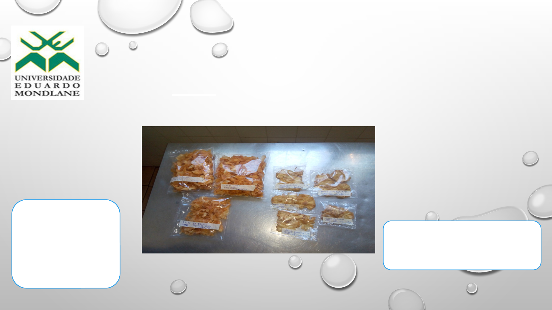 <p>Faculdade de Veterinária</p><p>Licenciatura em Ciência e Tecnologia de Alimentos</p><p>Nivel: 4° I° Semestre</p><p>Disciplina: Tecnologia de Alimentos II</p><p>Seminário I</p><p>TEMA: Processamento de frutas e vegetais</p><p>Discentes</p><p>Alexandra Suege</p><p>Edmy Bandeira</p><p>Elisa Mambo</p><p>Neusia Cuamba</p><p>Docente</p><p>Doutor Belisário Tomé Moiane</p><p>Maputo, Maio de 2019</p><p>Introdução</p><p>O consumo de frutas e hortaliças tem aumentado em todo mundo em função da sociedade moderna buscar cada dia hábitos de vida mais saudaveis e naturais.</p><p>A conveniência e a praticidade na hora de comprar e consumir frutas e hortaliças tem levado os consumidores a demandar produtos prontos para o consumo ou que exijam pouco ou nenhum preparado para serem consumidos com segurança.</p><p>A indústria de alimentos procura inovações que possam favorecer o aproveitamento de frutas e vegetais e aumentar a diversificação de produtos no mercado. Soma-se a isso a necessidade de desenvolver métodos que possam conservar alimentos por um período de tempo maior, mantendo da melhor forma as suas características sensoriais e nutricionais.</p><p>Objectivos</p><p>Geral</p><p>Aplicar os conhecimentos adiquiridos na aulas teoricas sobre processamento de frutas e vegetais.</p><p>Específico</p><p>Desenvolver os fluxogramas de processamento de chips de batata e de ananás desidratado;</p><p>Apresentar os produtos finais, ilustrando imagens.</p><p>Descrição de batata</p><p>A batata (solanum tuberosum L.) é um tubérculo originário da região andina, no continente sul-Americano.</p><p>A batata é um produto largamente consumido devido a suas qualidades nutricionais e a possibilidade de criação de diversos derivados.</p><p>Benefícios: Dimimui a pressão arterial;</p><p>Melhora o funcionamento do Cérebro;</p><p>Embeleza a pele e fortalece os ossos.</p><p>Nutrientes Batata de150g</p><p>Energia 150 cal</p><p>Proteina 3,7g</p><p>Lipídos 0g</p><p>Carbohidratos 23g</p><p>Fibras 27g</p><p>Sódio 5mg</p><p>Potássio 729mg</p><p>Composição nutricional da batata crua</p><p>Processamento de chips de batata</p><p>Materiais e Equipamentos</p><p>Batata</p><p>Vinagre</p><p>Água</p><p>Condimentos(sal, pimenta preta e piri piri)</p><p>Balança Analítica</p><p>Cortador de batata</p><p>Espumadeira</p><p>Faca</p><p>Fritadeira</p><p>Bandejas</p><p>Fluxograma de processamento de chips de batata</p><p>Recepção da matéria-prima</p><p>Selecção</p><p>Classificação</p><p>Pesagem</p><p>Pré- lavagem</p><p>Desinfecção</p><p>Descascamento</p><p>Corte</p><p>Marinar (15 minutos)</p><p>Fritura</p><p>Drenagem de óleo</p><p>Salga</p><p>Batata reno, vinagre piri piri ,pimenta preta, sal e óleo de soja.</p><p>Embalagem</p><p>Vinagre</p><p>Óleo de soja</p><p>Piri piri, pimenta preta e sal</p><p>Fluxograma de processamento de chips de batata</p><p>Resfriamento</p><p>( T 25 ˚C)</p><p>Embalagem</p><p>Armazenamento</p><p>T= ambiente</p><p>Rotulagem</p><p>Embalagem</p><p>Chips de Batata</p><p>Chips de Batata</p><p>Produto de fatias finas e onduladas de batata, que foram fritas ou cozidas até ficarem crocantes.</p><p>São comumente servidos como petisco, acompanhamento ou aperitivo.</p><p>Conservado a temperatura ambiente.</p><p>Rendimento</p><p>Peso da batata reno: 4652,5g</p><p>Peso do chips: 504g</p><p>Rendimento: 10. 8%</p><p>Processamento de Ananás</p><p>O ananás é uma planta da família bromeliaceae, que compreende aproximadamente 46 gêneros, destacando-se pela sua importância econômica o gênero ananás mill.</p><p>A fruta é proveniente de regiões tropicais e subtropicais e é muito consumida em todo o mundo, tanto ao natural quanto na forma de produtos industrializados.</p><p>Benefícios: fonte de Vitaminas A, B e C, combate o envelhecimento precoce e ajuda no emagrecimento.</p><p>Valor nutricional- teores de 100g de ananás</p><p>Energia 49,0kcal</p><p>Carbohidratos 12,40g</p><p>Gordura 0,1 – 0,43g</p><p>Acidez 0,35 – 1,35%</p><p>Proteinas 0,39 – 0,9g</p><p>Fibras 1 – 1,20g</p><p>Sólidos soluveis 12 – 16 ˚Brix</p><p>Processsamento de Ananás</p><p>Materiais</p><p>Ananás</p><p>Vinagre</p><p>Água</p><p>Provetas</p><p>Faca</p><p>Papel de alumínio</p><p>Bandejas</p><p>Tigelas</p><p>Embalagens plásticas</p><p>Desinfectante( hipoclorito de sódio)</p><p>Equipamentos</p><p>Estufa</p><p>Balança Analítica</p><p>Fluxograma de processamento de ananás desidratado</p><p>Recepção da Matéria-Prima</p><p>Pesagem</p><p>Pré-Lavagem</p><p>Desinfecção</p><p>Descascamento</p><p>Corte (1cm de diâmetro)</p><p>Pesagem</p><p>Marinar (t=15minutos)</p><p>Secagem em estufa (T=60˚C, t=48h)</p><p>Embalagem</p><p>Armazenamento (T ambiente)</p><p>Ananás</p><p>Vinagre</p><p>Embalagem</p><p>Vinagre</p><p>Ananás desidratado</p><p>Produto seco, em formato de roledas, servido como aperitivo e que pode ser conservado a temperatura ambiente.</p><p>Rendimento</p><p>Peso do ananás: 2857,3g</p><p>Peso do ananás desidratado: 206g</p><p>Rendimento: 7,2%</p><p>GRATAS PELA ATENçãO DISPENSADA</p><p>image2.png</p><p>image4.png</p><p>image5.png</p><p>image3.png</p><p>image6.png</p><p>image7.png</p><p>image8.png</p><p>image9.png</p><p>image10.png</p><p>image11.png</p><p>image1.png</p>