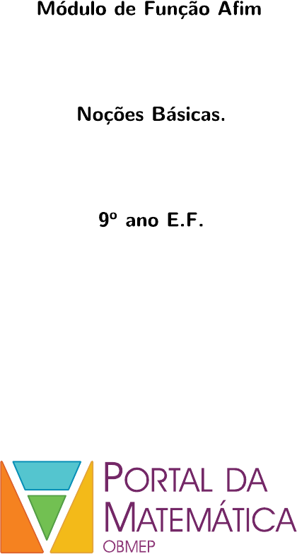 <p>Módulo de Funçño Afim</p><p>Noções Básicas.</p><p>9º ano E.F.</p><p>PO/YTAL DA</p><p>MATEMÁTICA</p><p>OBMEP</p><p>Função Afim</p><p>Noções Básicas.</p><p>1 Exercícios Introdutórios</p><p>Exercício 1. Em certa cidade, uma corrida de táxi custa</p><p>R$ 4, 80a bandeirada, mais R$ 0,40 por quilômetro rodado.</p><p>Quanto custa uma corrida de 50 quilômetros?</p><p>Exercício 2. O grau Fahrenheit (símbolo:° F)e uma es-</p><p>cala de temperatura proposta por Daniel Gabriel Fahre-</p><p>nheit em 1724. Nesta escala,o ponto de fusão da água</p><p>(0°C)é de 32°F-e o ponto de ebulição da água (100°C)é</p><p>de de 212°F. Sabendo quea temperatura na escala Fah-</p><p>renheité dada por uma função afim da escala Celsius,</p><p>determine em qual temperatura na escala Celsius ambas</p><p>assinalamo mesmo valor numérico?</p><p>Exercício 3. O custo total, por mês, de um serviço de</p><p>fotocópias, com cópias do tipo A4, consiste de um custo</p><p>fixo acrescido de um custo variável. O custo variável</p><p>depende, de forma diretamente proporcional, da quan-</p><p>tidade de páginas reproduzidas. Em um mês em que</p><p>esse serviço fez 50000 cópias, seu custo total foi de R$</p><p>21000, 00; enquanto que em um mês em que fez20000</p><p>cópias, seu custo total foi de R$ 19200, 00. Supondo queo</p><p>custo por página sejao mesmo nosmeses mencionados,</p><p>determine-o.</p><p>Exercício 4. Um experimento de Agronomia mostra que</p><p>a temperatura média da superfície do solo í(x), em °C,é</p><p>determinada em função do resíduoz de plantae biomassa</p><p>na superfície, em g/m2, conforme registrado na tabela</p><p>seguinte.</p><p>z Q/ 2] 10 20 30 40 50 60 70</p><p>f(z)° C] 7,24 7,30 7,36 7,42 7,48 7,54 7,60</p><p>Quala lei de formação da função t(x)*</p><p>Exercício 5. O reservatórioA perde águaa uma taxa</p><p>constante de 10 litros por hora, enquantoo reservatório</p><p>B ganha águaa uma taxa constante de 12 litros por hora.</p><p>No gráfico, estão representados, no eixo y, os volumes,</p><p>em litros, da água contida em cada um dos reservatórios,</p><p>em função do tempo, em horas, representado no eixo x.</p><p>Determineo tempo o. em horas, indicado no gráfico.</p><p>http://matematica.obmep.org.br/ 1</p><p>2 Exercícios de Fixação</p><p>Exercício 6. “Em fevereiro, o governo da Cidade do</p><p>México, metrópole com uma das maiores frotas de au-</p><p>tomóveis do mundo, passoua oferecerà população bici-</p><p>cletas como opção de transporte. Por uma anuidade de 24</p><p>dólares, os usuários têm direitoa 30 minutos de uso livre</p><p>por dia.O ciclista pode retirar em uma estaçãoe devolver</p><p>em qualquer outra e, se quiser estendera pedalada, paga</p><p>3 dólares por hora extra.” (Revista Exame. 21 abr. 2010.)</p><p>A expressão que relacionao valor/ pago pela utilização</p><p>da bicicleta por um ano, quando seutilizamx horas extras</p><p>nesse período é:</p><p>a) /(z) - 3z.</p><p>b) /(z) 24.</p><p>c) /(z) 27.</p><p>d) /(x) = 3x + 24.</p><p>e) /(x) = 24a+ 3.</p><p>Exercício 7. Em uma corrida de táxié cobrado um valor</p><p>inicial chamado dea bandeirada, mais uma quantia pro-</p><p>porcional por quilômetro rodado. Se por uma corrida de</p><p>8 km paga-se R$ 28,50e por uma corrida de5 km paga-se</p><p>R$ 19,50. Qualo valor da bandeirada?</p><p>Exercício 8. Duas pessoas combinaram de seencontrar</p><p>entre 13h e 14 h, no exato instante em que a posição do</p><p>ponteiro dos minutos do relógio coincidisse com a posição</p><p>do ponteiro das horas. Dessa forma, qualo horário queo</p><p>encontro foimarcado?</p><p>Exercício 9. Cláudio, gerente capacitado de uma em-</p><p>presa que produze vende instrumentos musicais, contra-</p><p>tou uma consultoria para analisaro sistema de produção.</p><p>Os consultores, após um detalhado estudo, concluíram</p><p>que o custo total de produção dex flautas de determinado</p><p>tipo pode serexpresso pela função C(x) = 2400 + 36x,</p><p>sendo R$ 2400, 00 o custo fixo. Atualmentea empresa</p><p>vende 60 flautas daquele tipo por mês, ao preço de R$</p><p>120, 00 por unidade. O trabalho da empresa de consul-</p><p>toria demonstrou, também, que um gasto extra de R$</p><p>1200, 00 em publicidade provocaria um aumento de 15%</p><p>no volume atual de vendas das flautas. Na sua opinião,</p><p>Cláudio deveria autorizaro gasto extra em publicidade?</p><p>Exercício 10. Considere três pontos distintos A, B e C</p><p>no plano cartesiano. Mostre que se suas coordenadas</p><p>satisfazema equaçãoy = as+ b, então esses pontos estão</p><p>alinhados e, em seguida, conclua queo grãfico de uma</p><p>função afimé sempre uma reta.</p><p>Exercício 11. Uma função jf definida de R+ em JR+,</p><p>crescente, satisfaza equação /(5x) = 5/(x) para todo</p><p>z real não-negativo. Se /(25) = 125, então qualo valor de</p><p>/(1)?</p><p>matematica0obmep.org.br</p><p>gabsp</p><p>Destacar</p><p>gabsp</p><p>Destacar</p><p>gabsp</p><p>Destacar</p><p>gabsp</p><p>Destacar</p><p>gabsp</p><p>Destacar</p><p>3 Exercícios de Aprofundamentoe de</p><p>Exames</p><p>Exercício 12. A fábula da lebree da tartaruga, do es-</p><p>critor grego Esopo, foirecontada utilizando-se o gráfico</p><p>abaixo para descrever os deslocamentos dos animais.</p><p>Suponha que na fábula lebree a tartaruga apostam uma</p><p>corrida em uma pista de 200 metros de comprimento. As</p><p>duas partem do mesmo local no mesmo instante. A tar-</p><p>taruga anda sempre com velocidade constante. A lebre</p><p>corre por5 minutos, para, deitae dorme porcerto tempo.</p><p>Quando desperta, voltaa correr com a mesma velocidade</p><p>constante de antes, mas, quando completao percurso,</p><p>percebe que chegou5 minutos depois da tartaruga. Con-</p><p>siderando essas informações,</p><p>a) determinea velocidade média da tartaruga durante</p><p>esse percurso, em metros por hora.</p><p>b) determine após quanto tempo da la
