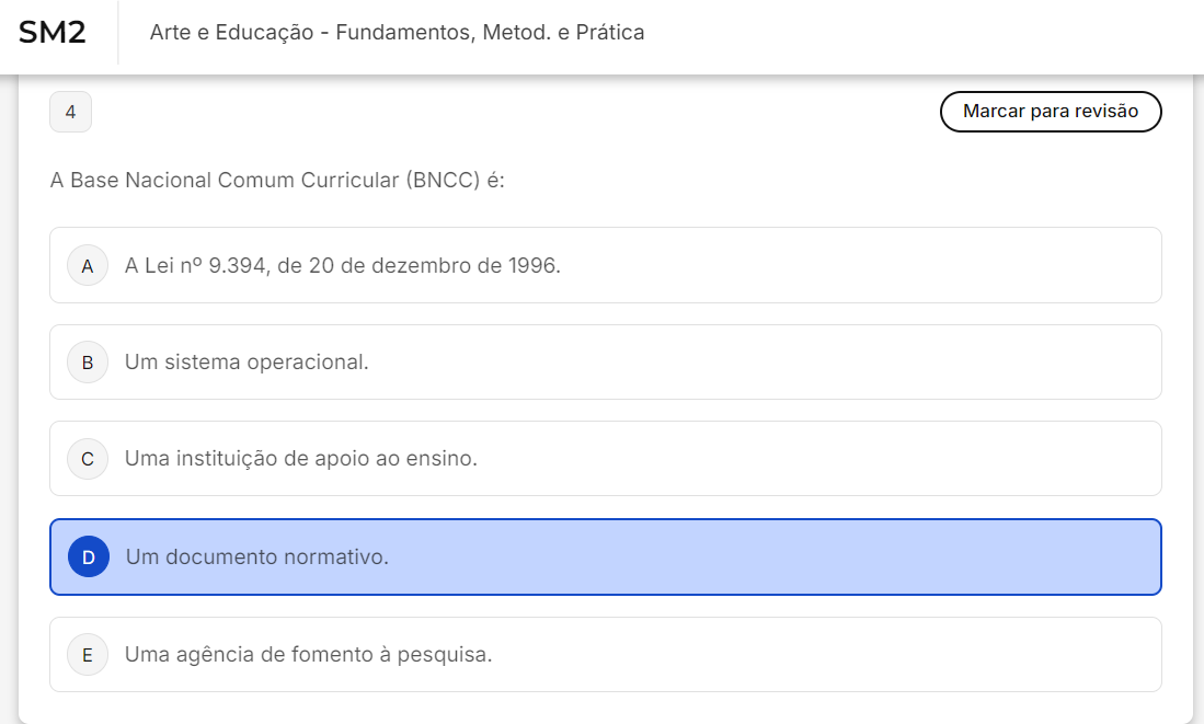 <p>SM2 Arte e Educação - Fundamentos, Metod. e Prática 4 Marcar para revisão A Base Nacional Comum Curricular (BNCC) é: A A Lei n° 9.394, de 20 de dezembro de 1996. B Um sistema operacional. C Uma instituição de apoio ao ensino. D Um documento normativo. E Uma agência de fomento à pesquisa.</p>