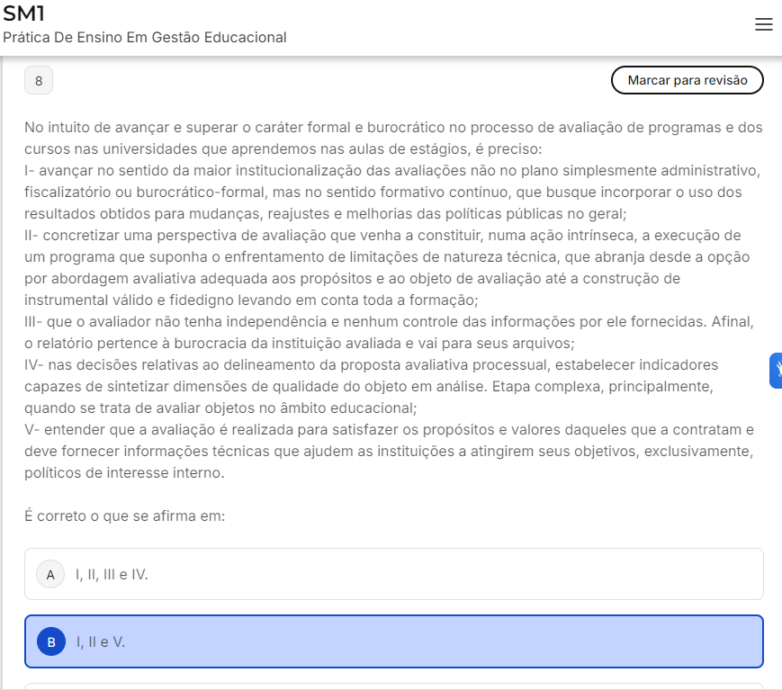 <p>Prática De Ensino Em Gestão Educacional 8 Marcar para revisão No intuito de avançar e superar caráter formal e burocrático no processo de avaliação de programas e dos cursos nas universidades que aprendemos nas aulas de estágios, é preciso: avançar no sentido da maior institucionalização das avaliações não no plano simplesmente administrativo, fiscalizatório ou burocrático-formal, mas no sentido formativo contínuo, que busque incorporar uso dos resultados obtidos para mudanças, reajustes e melhorias das políticas públicas no geral; II- concretizar uma perspectiva de avaliação que venha a constituir, numa ação intrinseca, a execução de um programa que suponha enfrentamento de limitações de natureza técnica, que abranja desde a opção por abordagem avaliativa adequada aos propósitos e ao objeto de avaliação até a construção de instrumental válido e fidedigno levando em conta toda a formação; que avaliador não tenha independência e nenhum controle das informações por ele fornecidas. Afinal, relatório pertence à burocracia da instituição avaliada e vai para seus arquivos; IV- nas decisões relativas ao delineamento da proposta avaliativa processual, estabelecer indicadores capazes de sintetizar dimensões de qualidade do objeto em análise. Etapa complexa, principalmente, quando se trata de avaliar objetos no âmbito educacional; V- entender que a avaliação é realizada para satisfazer os propósitos e valores daqueles que a contratam e deve fornecer informações técnicas que ajudem as instituições a atingirem seus objetivos, exclusivamente, políticos de interesse interno. É correto que se afirma em: A I, II, III e IV. B I, e V.</p>