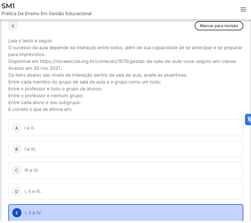 <p>SM1 Prática De Ensino Em Gestão Educacional 6 Marcar para revisão Leia texto a seguir. sucesso da aula depende da interação entre todos, além de sua capacidade de se antecipar e se preparar para imprevistos. Disponível - Acesso em 30 nov 2021. Os itens abaixo são níveis de interação dentro da sala de aula, avalie as assertivas: Entre cada membro do grupo de sala de aula e O grupo como um todo; Entre O professor e todo O grupo de alunos; Entre O professor e nenhum grupo; Entre cada aluno e seu subgrupo. É correto O que se afirma em: A II. B I e III. C III e IV. D I, e III. E I, II e IV.</p>