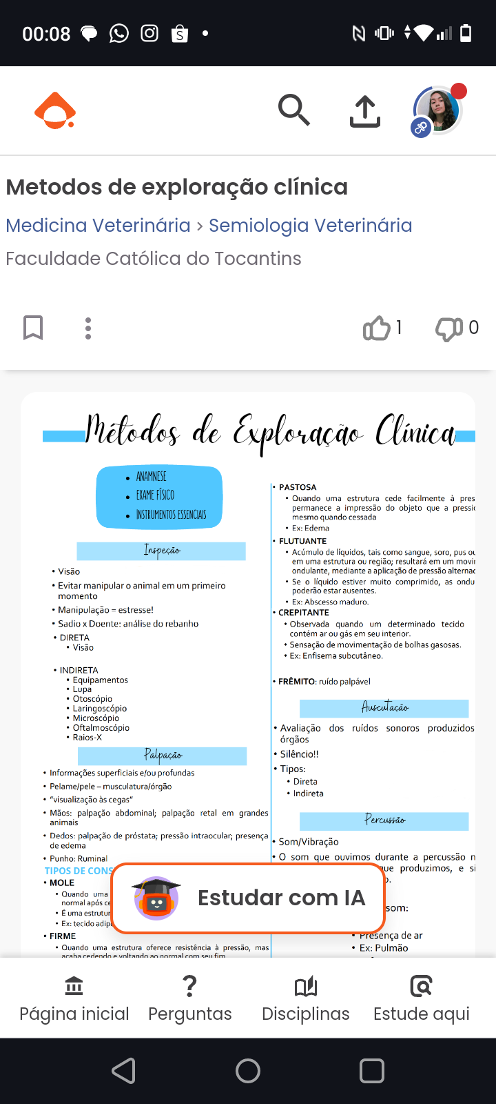 <p>00:08 N Metodos de exploração clínica Medicina Veterinária > Semiologia Veterinária Faculdade Católica do Tocantins 0 Metodos de Clinica ANAMNESE PASTOSA EXAME Quando uma estrutura cede facilmente à pres permanece a impressão do objeto que a INSTRUMENTOS ESSENCIAIS mesmo quando cessada Ex: Edema FLUTUANTE Acúmulo de líquidos, tais como sangue, soro, pus ou em uma estrutura ou região; resultará em um Visão ondulante, mediante a aplicação de pressão Evitar manipular animal em um primeiro Se estiver muito comprimido, as ondu poderão estar ausentes. momento Ex: Abscesso Manipulação = estresse! CREPITANTE Sadio Doente: análise do rebanho Observada quando um determinado tecido DIRETA contém an ou gás em seu interior Visão Sensação de movimentação de bolhas Ex: Enfisema INDIRETA Equipamentos FRÊMITO: ruído Lupa Laringoscópio Auscutação Microscópio Oftalmoscópio Avaliação dos ruídos sonoros produzidos Raios-X órgãos Silêncio!! Informações superficiais e/ou profundas Tipos: Direta Pelame/pele - musculatura/órgão Indireta "visualização às cegas" Mãos: palpação abdominal; palpação retal em grandes animais Percussão Dedos: palpação de próstata; pressão intraocular; presença de edema Som/Vibração Punho: Ruminal som que ouvimos durante a percussão TIPOS DE CONS produzimos, e si D. MOLE Quando uma normal após Estudar com IA som: É uma estrutur Ex: tecido adip FIRME Presença de an Quando uma estrutura oferece resistência à pressão, mas Ex: Pulmão acaba e voltando ao normal com seu fim ? Página inicial Perguntas Disciplinas Estude aqui O</p>