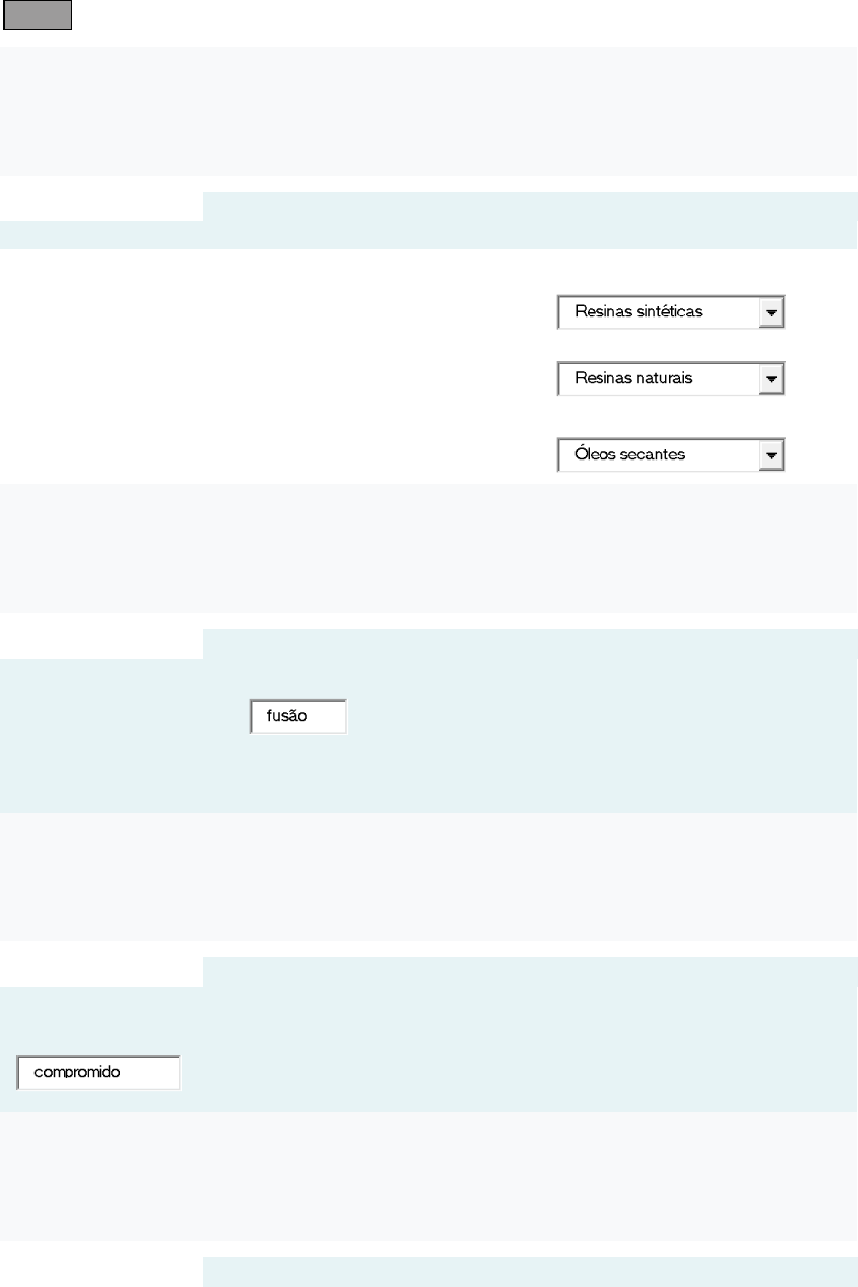 <p>Teste seus conhecimentos</p><p>Voltar</p><p>Questão 1</p><p>Ainda não respondida</p><p>Vale 1,00 ponto(s).</p><p>Marcar questão</p><p>Texto da questão</p><p>Associe corretamente os materiais que são veículos para as tintas.</p><p>Alquídica, fenólica, epoxi, acrílica, vinílica, PVA.</p><p>Resposta 1 Questão 1</p><p>Óleos vegetais oriundos da semente do linho, do tungue,</p><p>da oiticica e do algodão.</p><p>Resposta 2 Questão 1</p><p>A goma-laca, proveniente da excreção de um inseto da</p><p>Índia (cochonilha), o copal, extraído de algumas árvores</p><p>tropicais e o látex, obtido das seringueiras.</p><p>Resposta 3 Questão 1</p><p>Questão 2</p><p>Ainda não respondida</p><p>Vale 1,00 ponto(s).</p><p>Marcar questão</p><p>Texto da questão</p><p>Complete corretamente a lacuna do texto abaixo:</p><p>A Resposta Questão 2 é obtida nos fornos onde as matérias-primas</p><p>passarão a um estado pastoso, pouco viscoso, em que a temperatura</p><p>ultrapassa 1500 °C.</p><p>Questão 3</p><p>Ainda não respondida</p><p>Vale 1,00 ponto(s).</p><p>Marcar questão</p><p>Texto da questão</p><p>Complete corretamente a lacuna do texto abaixo:</p><p>Enquanto o exterior está tracionado e frio, o interior está Resposta Questão</p><p>3 e quente.</p><p>Questão 4</p><p>Ainda não respondida</p><p>Vale 1,00 ponto(s).</p><p>Marcar questão</p><p>Texto da questão</p><p>https://aprendamais.mec.gov.br/mod/quiz/view.php?id=62435</p><p>Complete corretamente a lacuna do texto abaixo:</p><p>O Resposta Questão 4 é o abate da árvore.</p><p>Questão 5</p><p>Ainda não respondida</p><p>Vale 1,00 ponto(s).</p><p>Marcar questão</p><p>Texto da questão</p><p>Marque a alternativa correta.</p><p>"É um vidro formado pela superposição e colagem de duas ou mais placas</p><p>de vidro liso recozido. A película aderente é um material polimérico, o</p><p>polivinilbutiral (PVB), de grande adesividade. A colagem é feita em</p><p>autoclave à 180 °C e os resultados obtidos indicam o vidro para aplicações</p><p>de segurança, como em para-brisas de automóveis. Se houver fratura do</p><p>vidro, os pedaços ficam aderidos ao conjunto pela película ou, mesmo</p><p>havendo a ruptura (trinca) de uma das lâminas, a outra lâmina pode não</p><p>ser atingida."</p><p>A qual tipo de vidro o trecho mostrado se refere?</p><p>Questão 5Resposta</p><p>a.</p><p>Vidro aramado</p><p>b.</p><p>Vidro comum</p><p>c.</p><p>Fibra de vidro e lã de vidro</p><p>d.</p><p>Vidro temperado</p><p>e.</p><p>Telhas e blocos de vidros</p><p>f.</p><p>Vidro laminado</p><p>Limpar minha escolha</p><p>Questão 6</p><p>Ainda não respondida</p><p>Vale 1,00 ponto(s).</p><p>Marcar questão</p><p>Texto da questão</p><p>https://aprendamais.mec.gov.br/mod/quiz/attempt.php?attempt=6631952&cmid=62435</p><p>Complete corretamente a lacuna do texto abaixo:</p><p>O princípio da fabricação do Resposta Questão 6 consiste</p><p>na mistura conveniente dos componentes, aquecimento à temperatura de</p><p>fusão e resfriamento para moldagem. A seguir, faz-se um ligeiro</p><p>reaquecimento para alívio das tensões produzidas no processamento.</p><p>Questão 7</p><p>Ainda não respondida</p><p>Vale 1,00 ponto(s).</p><p>Marcar questão</p><p>Texto da questão</p><p>Associe corretamente os comportamentos mecânicos de alguns materiais.</p><p>São materiais poliméricos, estáveis nas condições</p><p>normais de uso, mas que, em algum estágio de sua</p><p>fabricação, são fluidos, podendo ser moldados por</p><p>aquecimento, pressão ou ambos. Exemplos:</p><p>polietileno, polipropileno, poliestireno.</p><p>Resposta 1 Questão 7</p><p>São materiais poliméricos que, após sofrerem</p><p>deformação sob a ação de uma força, retornam à sua</p><p>forma original quando essa força é removida.</p><p>Exemplos: polibutadieno, borracha nitrílica.</p><p>Resposta 2 Questão 7</p><p>São polímeros que se apresentam em forma de fios.</p><p>Exemplos: poliésteres, nylon e poliacrilonitrila.</p><p>Resposta 3 Questão 7</p><p>Questão 8</p><p>Ainda não respondida</p><p>Vale 1,00 ponto(s).</p><p>Marcar questão</p><p>Texto da questão</p><p>Associe corretamente as formas de moldagem.</p><p>Para vidros de maiores espessuras Resposta 1 Questão 8</p><p>Para tubo de vidro de pequena espessura Resposta 2 Questão 8</p><p>Para o vidro plano Resposta 3 Questão 8</p><p>Questão 9</p><p>Ainda não respondida</p><p>Vale 1,00 ponto(s).</p><p>Marcar questão</p><p>Texto da questão</p><p>Leia atentamente o texto abaixo e na sequência indique se ele é</p><p>verdadeiro ou falso:</p><p>A fiação consiste no forçamento da resina aquecida contra o bocal de</p><p>uma matriz que lhe concede um formato contínuo.</p><p>Questão 9Escolha uma opção:</p><p>Verdadeiro</p><p>Falso</p><p>Questão 10</p><p>Ainda não respondida</p><p>Vale 1,00 ponto(s).</p><p>Marcar questão</p><p>Texto da questão</p><p>Complete corretamente a lacuna do texto abaixo:</p><p>Resposta Questão 10 a madeira consiste em aplicar-lhe</p><p>tratamentos para protegê-la do ataque de agentes biológicos ou</p><p>intempéricos, aumentando assim, a sua vida útil.</p>