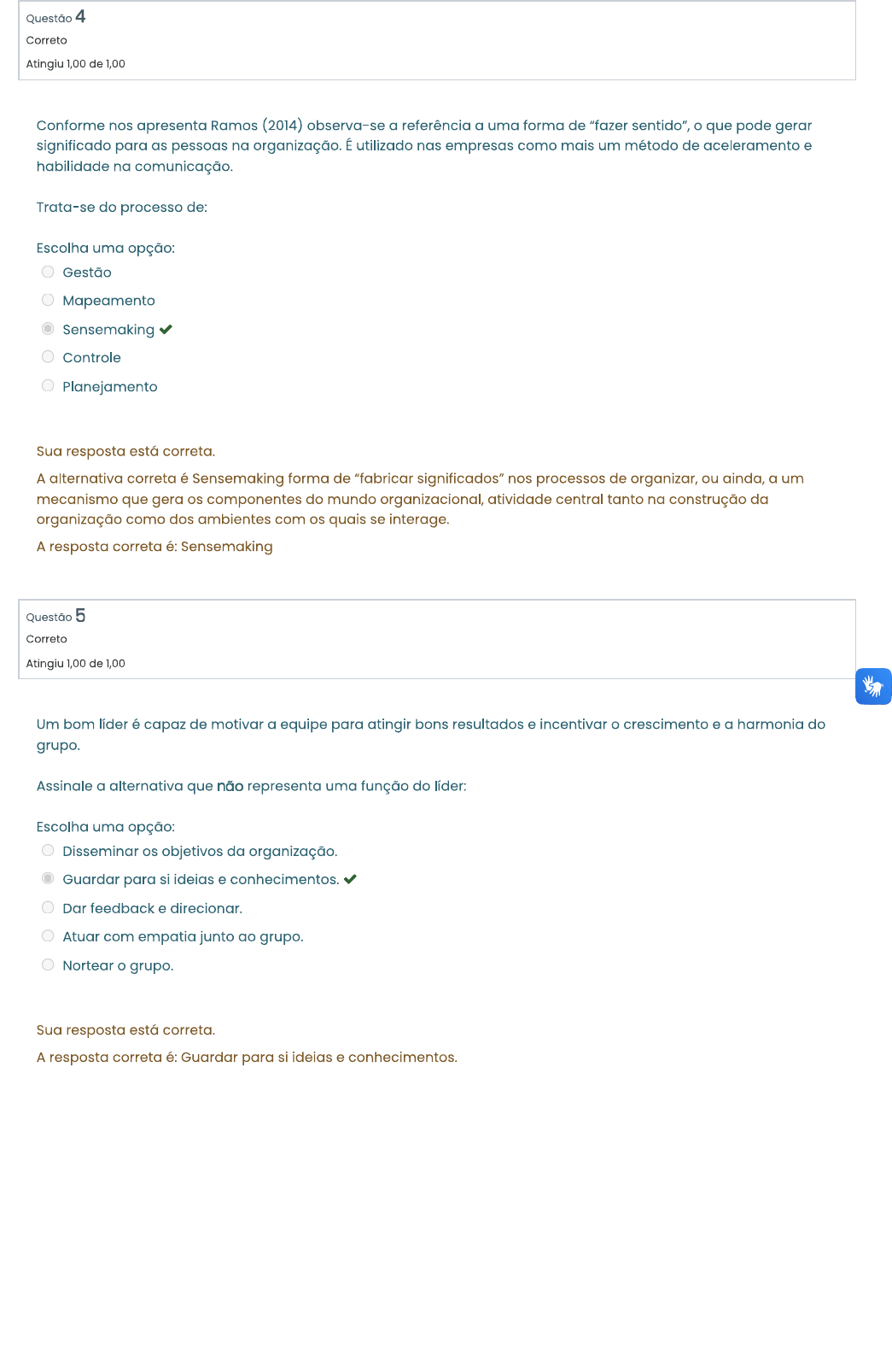 <p>Questão 4 Correto Atingiu 1,00 de 1,00 Conforme nos apresenta Ramos (2014) observa-se a referência a uma forma de "fazer que pode gerar significado para as pessoas na organização. É utilizado nas empresas como mais um método de aceleramento e habilidade na comunicação. Trata-se do processo de: Escolha uma opção: Gestão Mapeamento Sensemaking Controle Planejamento Sua resposta está correta. A alternativa correta é Sensemaking forma de significados" nos processos de organizar, ou ainda, a um mecanismo que gera os componentes do mundo organizacional, atividade central tanto na construção da organização como dos ambientes com os quais se interage. A resposto correta é: Sensemaking Questão 5 Correto Atingiu 1,00 de 1,00 Um bom líder é capaz de motivar a equipe para atingir bons resultados e incentivar crescimento e a harmonia do grupo. a alternativa que não representa uma função do líder: Escolha uma opção: Disseminar os objetivos da organização. Guardar para si ideias e Dar feedback e direcionar. Atuar com junto ao grupo. Nortear grupo. Sua resposta está correta. A resposta correta é: Guardar para si e conhecimentos.</p><p>Questão 6 Correto Atingiu 1,00 de 1,00 Por meio de seus autores, a Administração nos apresenta diferentes tipos de líderes. São os estilos de liderança que denominam o comportamento do líder, independentemente de suas características pessoais. Estilo de liderança é o padrão recorrente de comportamento exibido pelo líder. Para autor Ramos (2014) existem três estilos básicos de liderança: I. Liderança Autocrática II. Liderança Liberal III. Liderança Democrática Representam a participação dos líderes: A. líder não faz nenhuma tentativa de ou regular curso das coisas. Faz apenas comentários quando perguntado. B. líder é pessoal e dominador nos elogios e nas críticas ao trabalho de cada um. C. líder procura ser um membro normal do grupo. É objetivo e estimula com fatos, elogios ou críticas. Marque a opção que relaciona corretamente estilo de liderança à participação do líder. Escolha uma opção: - B - C; - B; III - - A A - C Sua resposta está correta. A. líder não faz nenhuma tentativa de avaliar ou regular curso das coisas. Faz apenas comentários quando perguntado. ( Liberal- II) B. líder é pessoal e dominador nos elogios e nas críticas ao trabalho de cada um. ( Autocrático- C. O líder procura ser um membro normal do grupo. É objetivo e estimula com fatos, elogios ou críticas. A resposta correta é: - - C</p>