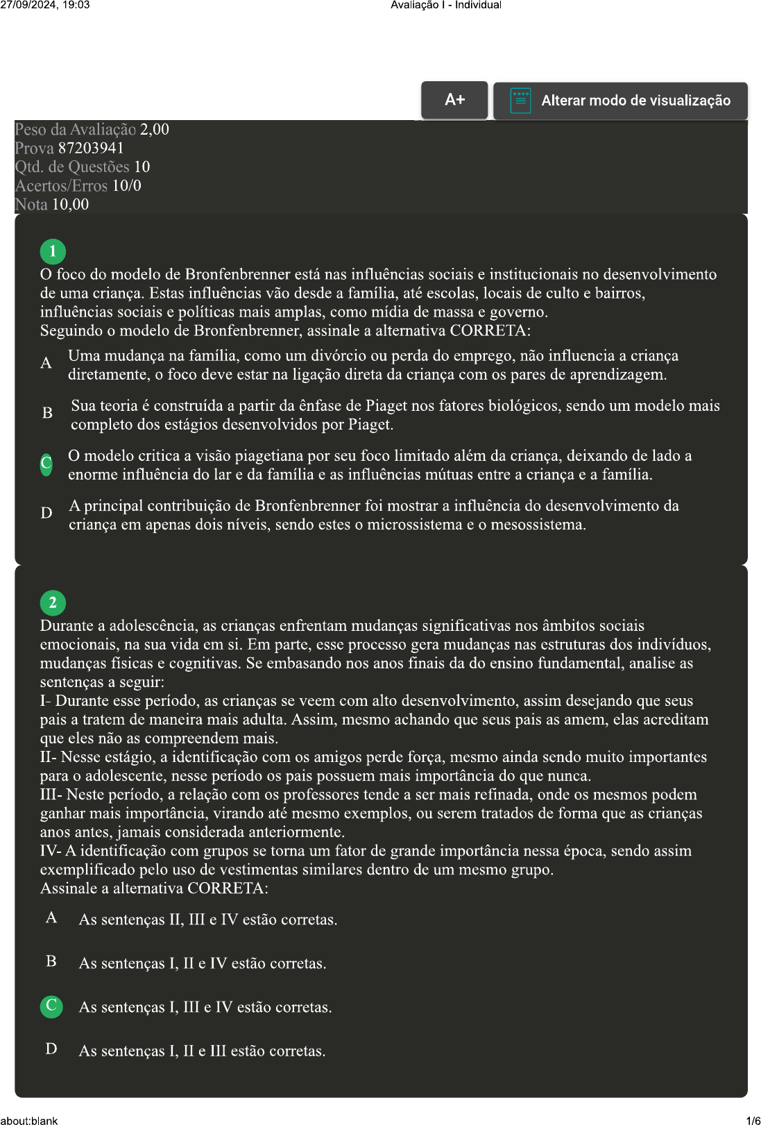 <p>27/09/2024, 19:03 Avaliação Individual A+ Alterar modo de visualização Peso da Avaliação 2,00 Prova 87203941 Qtd. de Questões 10 Acertos/Erros 10/0 Nota 10,00 1 O foco do modelo de Bronfenbrenner está nas influências sociais e institucionais no desenvolvimento de uma criança. Estas influências vão desde a família, até escolas, locais de culto e bairros, influências sociais e políticas mais amplas, como mídia de massa e governo. Seguindo modelo de Bronfenbrenner, assinale a alternativa CORRETA: A Uma mudança na família, como um divórcio ou perda do emprego, não influencia a criança diretamente, foco deve estar na ligação direta da criança com os pares de aprendizagem. B Sua teoria é construída a partir da ênfase de Piaget nos fatores biológicos, sendo um modelo mais completo dos estágios desenvolvidos por Piaget. O modelo critica a visão piagetiana por seu foco limitado além da criança, deixando de lado a enorme influência do lar e da família e as influências mútuas entre a criança e a família. D A principal contribuição de Bronfenbrenner foi mostrar a influência do desenvolvimento da criança em apenas dois níveis, sendo estes microssistema e mesossistema. 2 Durante a adolescência, as crianças enfrentam mudanças significativas nos âmbitos sociais emocionais, na sua vida em si. Em parte, esse processo gera mudanças nas estruturas dos indivíduos, mudanças físicas e cognitivas. Se embasando nos anos finais da do ensino fundamental, analise as sentenças a seguir: I- Durante esse período, as crianças se veem com alto desenvolvimento, assim desejando que seus pais a tratem de maneira mais adulta. Assim, mesmo achando que seus pais as amem, elas acreditam que eles não as compreendem mais. II- Nesse estágio, a identificação com os amigos perde força, mesmo ainda sendo muito importantes para adolescente, nesse período os pais possuem mais importância do que nunca. III- Neste período, a relação com os professores tende a ser mais refinada, onde os mesmos podem ganhar mais importância, virando até mesmo exemplos, ou serem tratados de forma que as crianças anos antes, jamais considerada anteriormente. IV- A identificação com grupos se torna um fator de grande importância nessa época, sendo assim exemplificado pelo uso de vestimentas similares dentro de um mesmo grupo. Assinale a alternativa CORRETA: A As sentenças II, III e IV estão corretas. B As sentenças I, II e IV estão corretas. C As sentenças I, III e IV estão corretas. D As sentenças I, II e III estão corretas. about:blank 1/6</p><p>19:03 Avaliação Individual 3 As pessoas progridem por meio de quatro estágios de desenvolvimento cognitivo entre nascimento e a idade adulta. Cada estágio é marcado pelo surgimento de novas habilidades intelectuais que permitem às pessoas compreenderem mundo de maneiras cada vez mais complexas. Referente aos quatro estágios de Piaget, associe os itens, utilizando código a seguir: I- Pré-Operatório. III- Operacional Concreto. IV- Operacional Formal. ( ) Melhoria na habilidade de pensar logicamente. Novas habilidades incluem uso de operações reversíveis. O pensamento é descentralizado e a resolução de problemas é menos restrita pelo egocentrismo. O pensamento abstrato ainda não é possível. ( Formação do conceito de "permanência do objeto" e progressão gradual do comportamento reflexivo para comportamento direcionado a um objetivo. ( ) Desenvolvimento da capacidade de usar símbolos para representar objetos no mundo. O pensamento permanece egocêntrico e centrado. ( ) O pensamento abstrato e puramente é possível. Os problemas podem ser resolvidos com uso de experimentação sistemática. Assinale a alternativa que apresenta a sequência CORRETA: A III IV II. B IV. C D 4 Não existe uma fórmula para um bom ensino, nem sete passos para ser Professor do Ano. O ensino envolve planejamento e preparação e, em seguida, dezenas de decisões a cada momento. No entanto, existe um atributo característico em professores notáveis, a intencionalidade. Com base na intencionalidade de um bom professor, analise as sentenças a seguir: I- Os professores intencionais não precisam pensar constantemente sobre os resultados que desejam para seus alunos, apenas sobre as decisões que os movem em direção aosucessoem sala de aula. II- Sim, as crianças aprendem de maneiras não planejadas tempo todo, e muitas aprenderão até mesmo com a aula mais caótica. Mas para realmente desafiar os alunos, para obter seus melhores esforços, para ajudá-los a dar saltos conceituais e organizar e reter novos conhecimentos. os professores precisam ser intencionais: propositais, atenciosos e flexíveis, sem nunca perder de vista seus objetivos para cada criança. III- Os professores frequentemente adotam estratégias que eles próprios reconheceriam, após uma breve reflexão, como apenas preenchimentos de tempo, em vez de atividades instrucionais essenciais. IV- Os professores intencionais alcançam um senso de eficácia avaliando constantemente os resultados de sua instrução; tentando novas estratégias se sua instrução inicial não funcionar; e buscando continuamente ideias de colegas, livros, recursos on-line, revistas, workshops e outras fontes para enriquecer e solidificar suas habilidades pedagógicas. Assinale a alternativa CORRETA: A As sentenças II, III e IV estão corretas. B As sentenças I e III estão corretas. about:blank 2/6</p><p>27/09/2024, 19:03 Avaliação Individual C As sentenças I, II e IV estão corretas. D As sentenças I e IV estão corretas. 5 De modo geral, conhecimento de como transmitir as informações e os conhecimentos é tão importante quando próprio conhecimento e desenvolvimento das habilidades. A maioria das pessoas já teve contato com algum profissional que se destacava em sua área, porém no momento de compartilhar esse conhecimento. de forma significativa, apresentava muita dificuldade. Desta